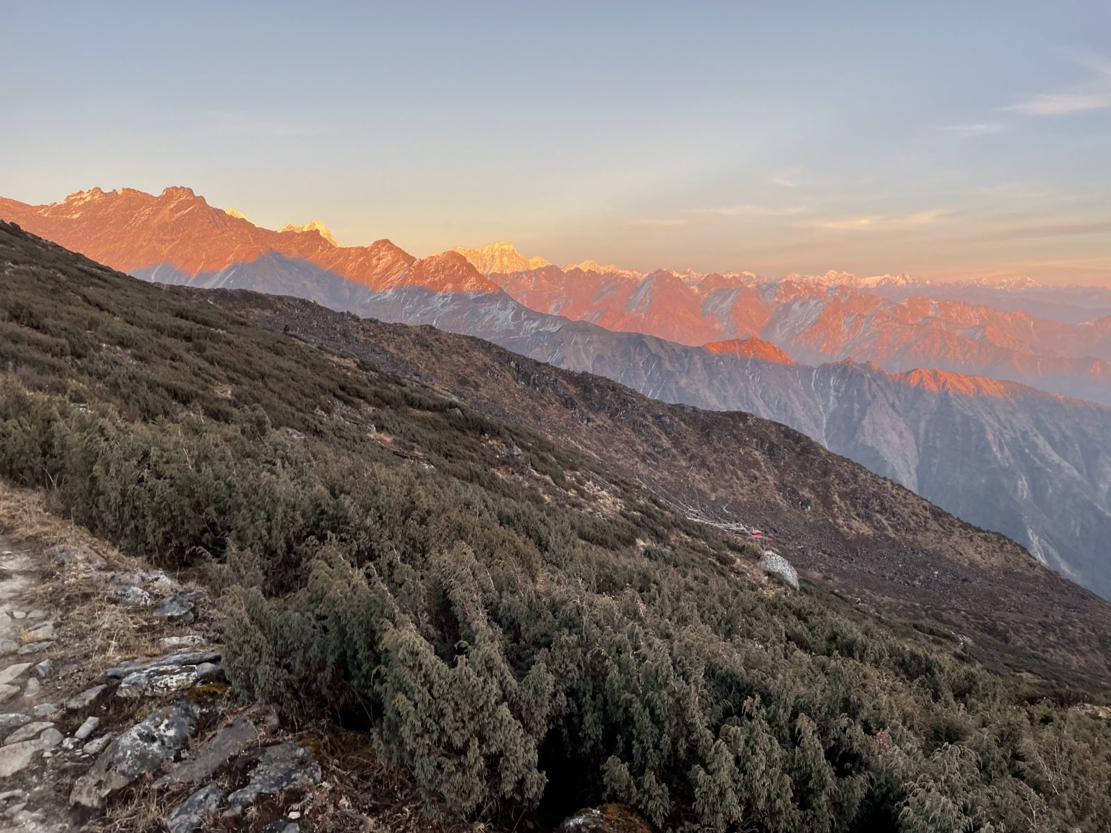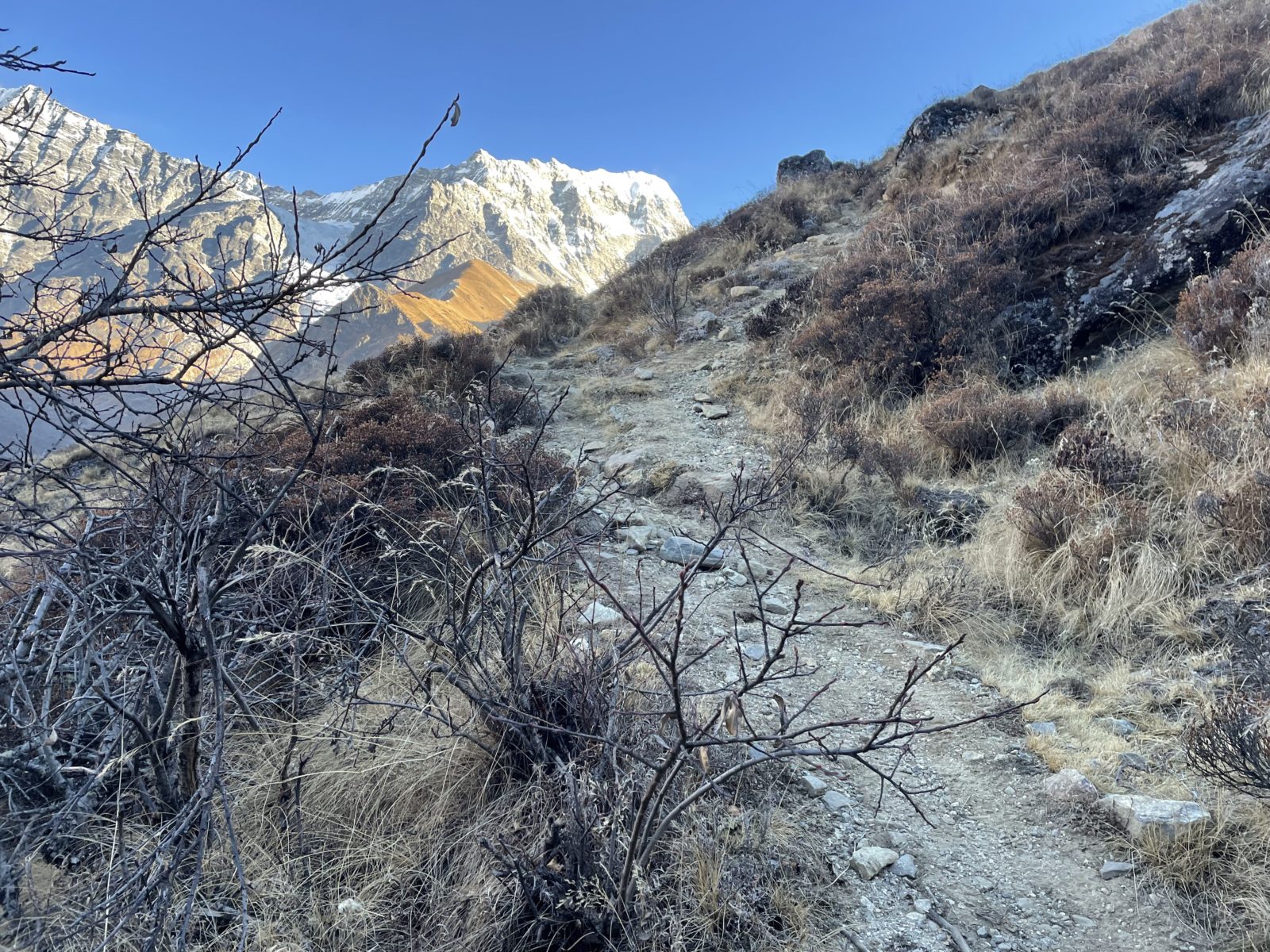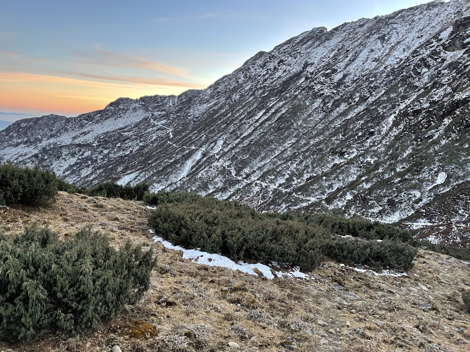 Když procházím kolem salaše Dhukpu, je pár minut po páté – západ slunce. Zastavuju se a dávám svačinu. Cesta nevede přímo kolem stavení, ty jsou o kus níž. Předpokládám, že uvnitř to bude špinavé, ale asi by tam šlo přespat. Mám bivakovací pytel, nafukovací karimatku a spacák. Moc se mi ta představa nelíbí. Myslím, že by to byla dost chladná noc. Můj spacák má limit -4 stupně. O moc větší zima asi nebude, ale i tak. Co je lepší, 14 hodin klepat kosu v salaši a čekat, než přijde ráno, anebo jít ještě pár hodin po tmě a dojít až do vesnice a tam se ohřát u kamen? Volím druhou variantu. Plus je tu ještě ten hec, že to zvládnu přejít za jeden den a že ten chatař v Kyanjin Gompě neměl pravdu, když říkal, že to nejde.