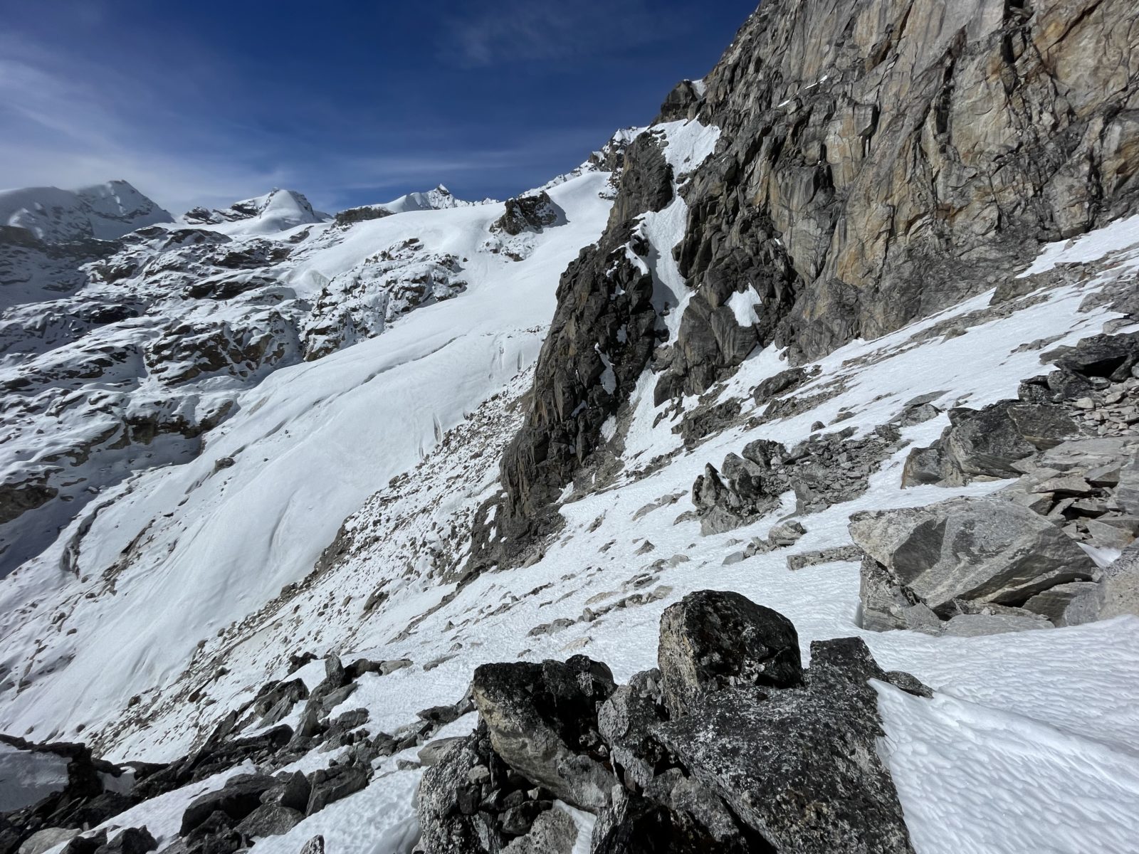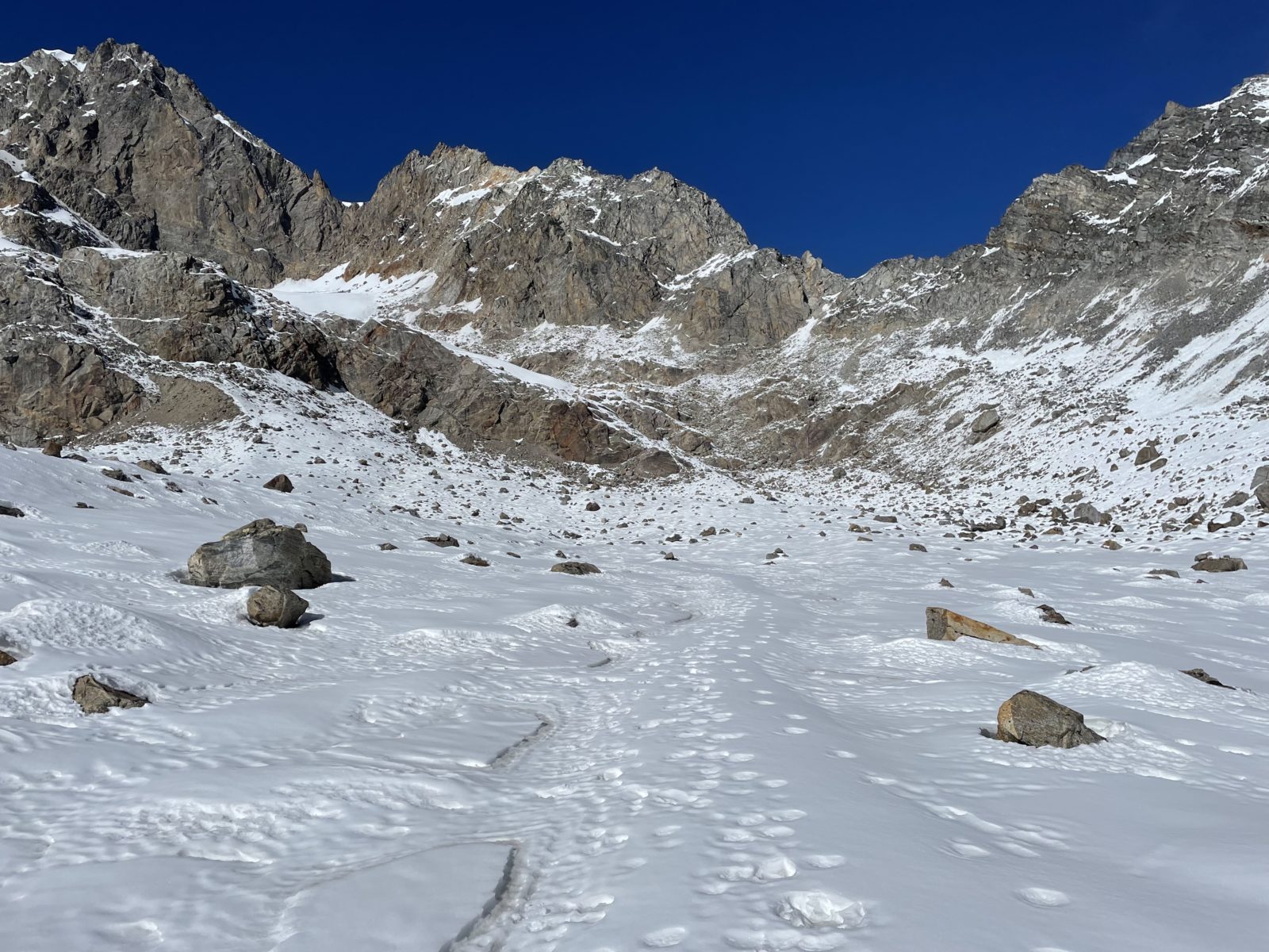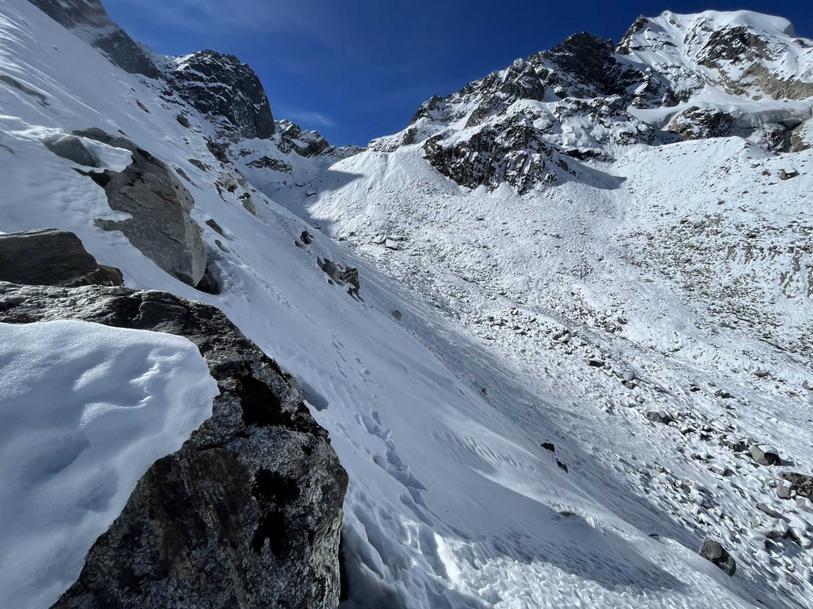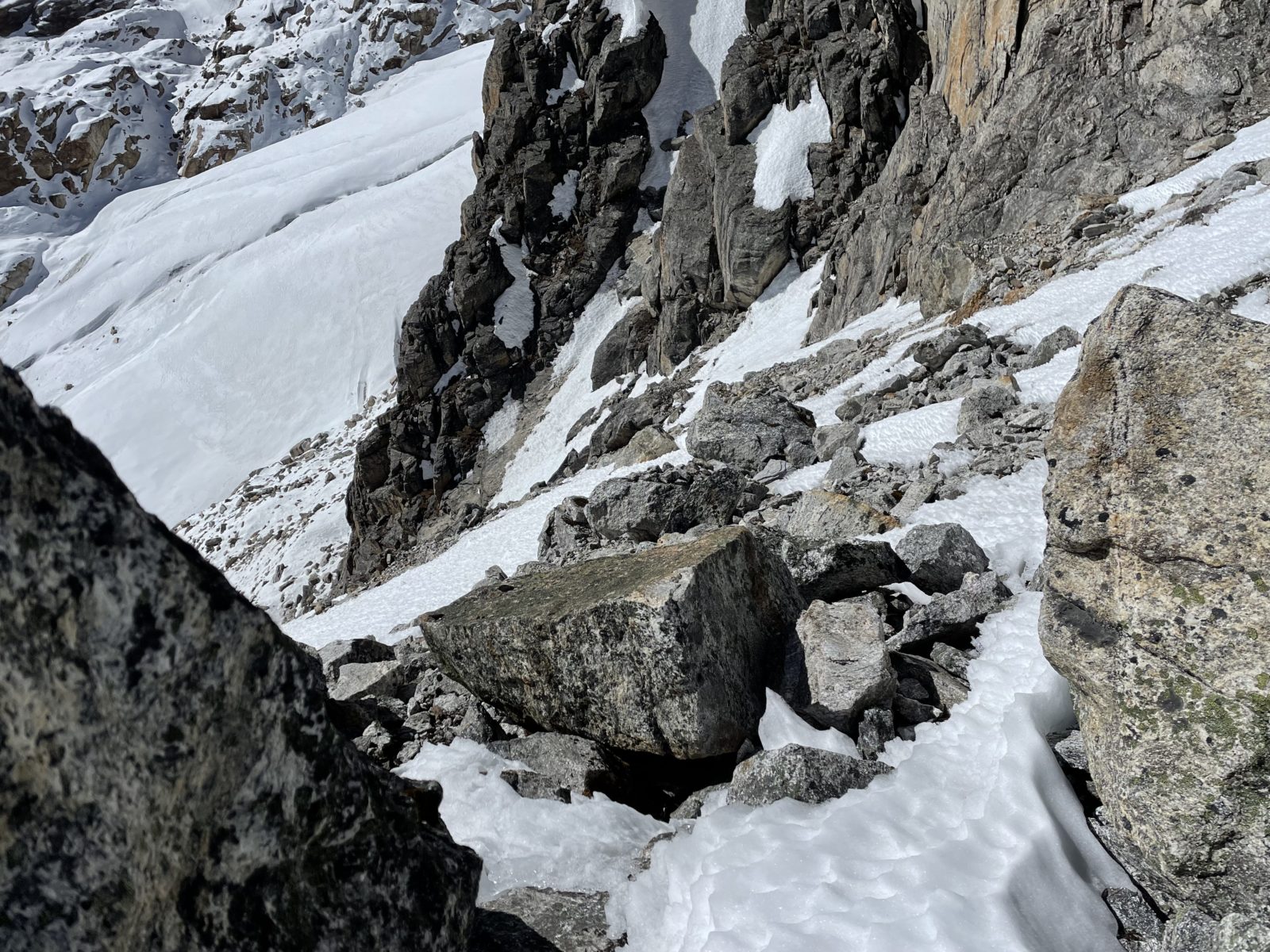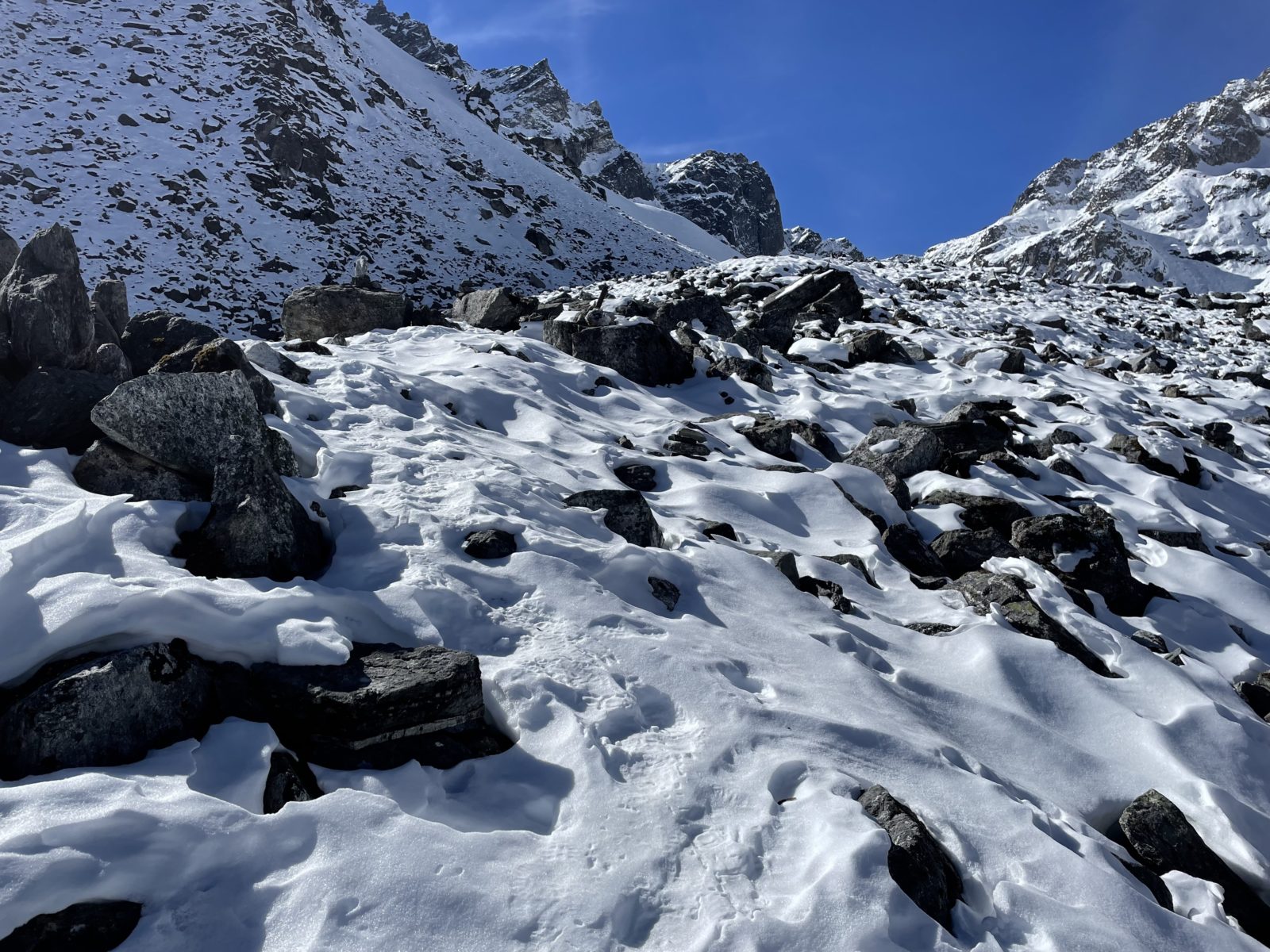 No ale prve si dám svačinu a pak uvidím. Jak dosvačím, tak se na to koukám znovu a říkám si, že to vlastně asi nějak půjde. Svah je relativně strmý, ale jsou v něm rozeseté balvany a skalky. Budu to směřovat tak, abych vždy mohl případně zabrzdit o skalku. A po skalce vždy slezu trochu níž a pak zase po sněhu k další skalce. Je 12 a vyrážím dolů. Trvalo mi to teda do sedla i se svačinou 5 hodin místo původně zamýšlených 4.