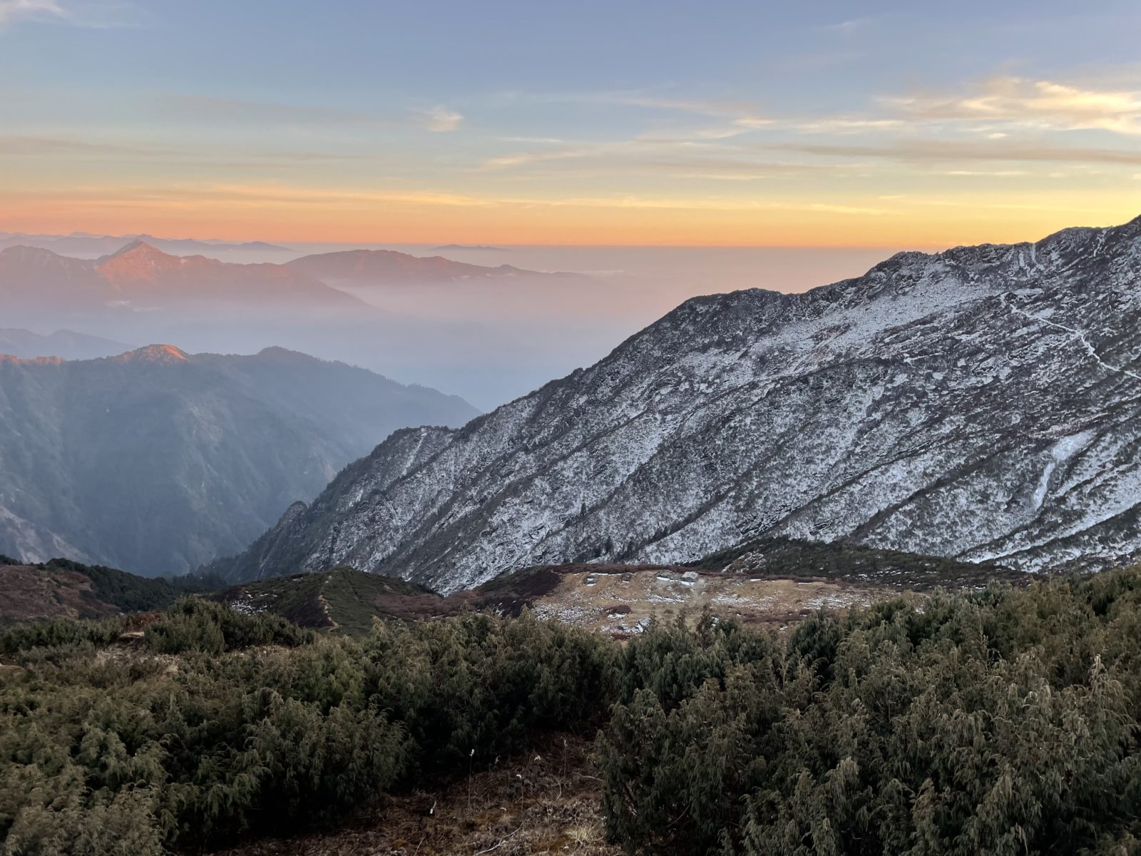 Pokračuju dál. Hory v dálce se barví do oranžova.