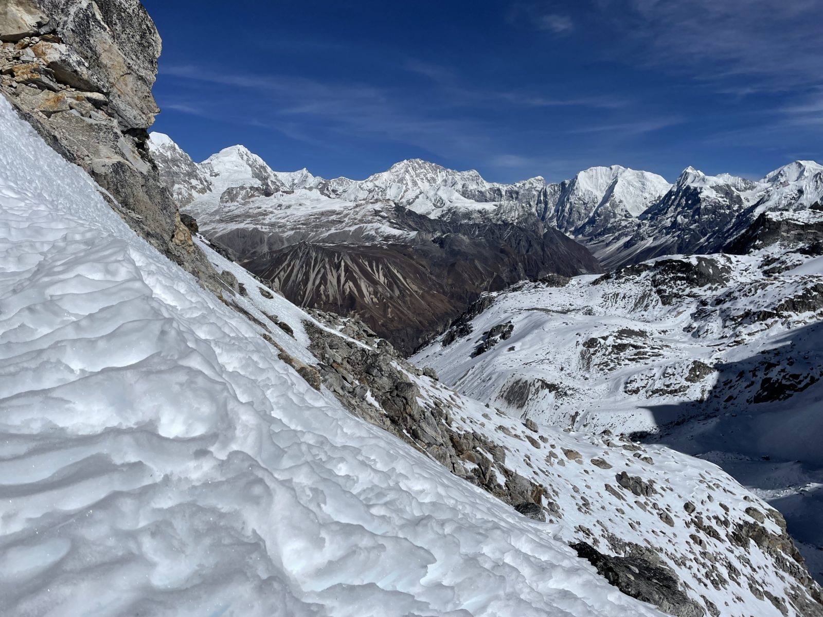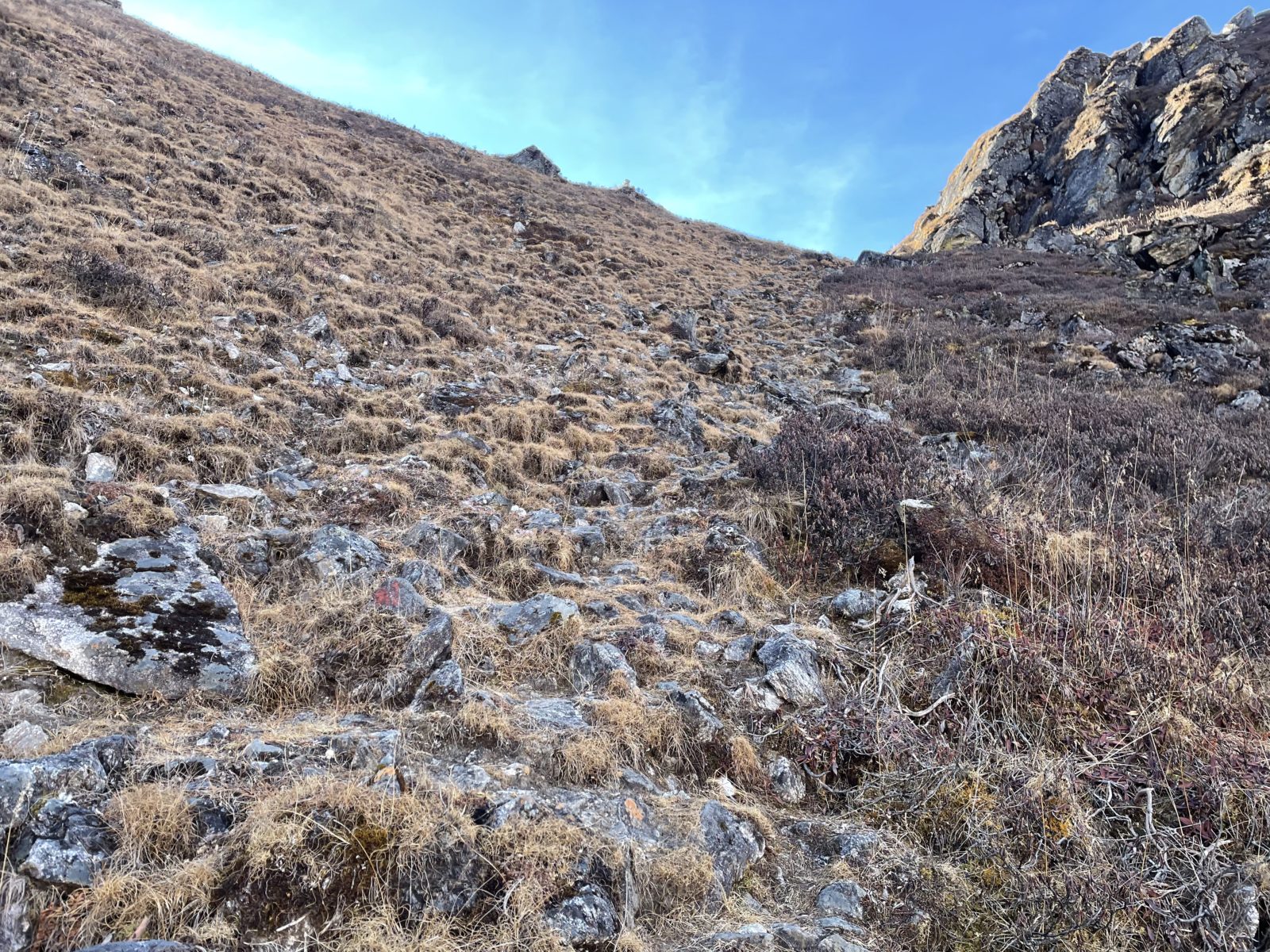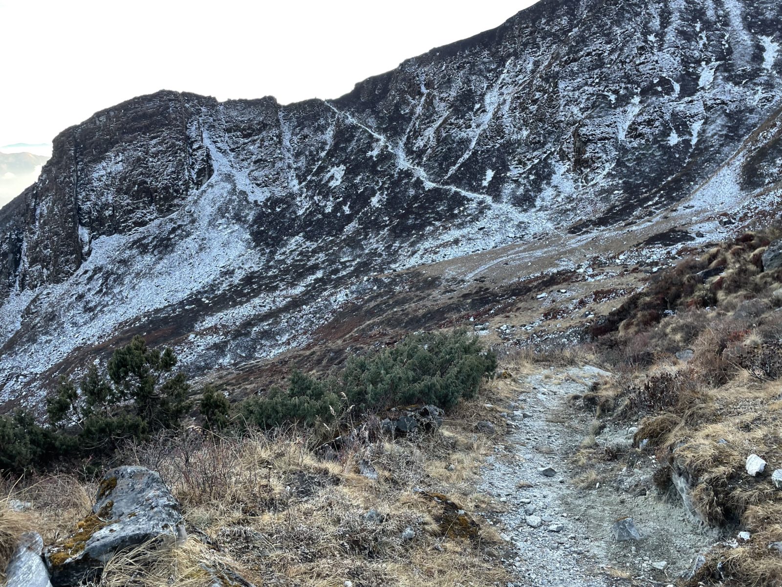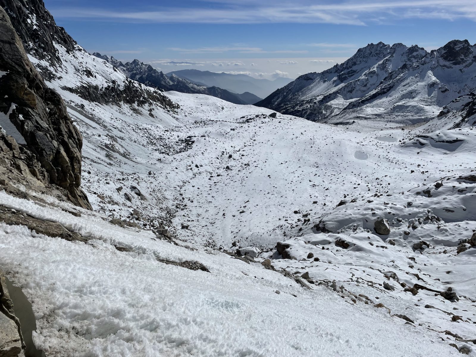 Aktualizace 11. 1. 2022: Po výměně několika emailů s Vojtou, který šel přes Ganja La na jaře 2018, vyšlo najevo, že normální cesta přes sedlo vede jinudy. Vyleze se po žebříku a pak se traverzuje doleva, až na hřeben do sedla. Já jsem místo toho šel směrem doprava. Vycházel jsem z toho, co je v OpenStreetMap, ale tam je to očividně blbě. Tím se taky vysvětluje, proč jsem měl takový problém při sestupu ze sedla na jih – na té správné cestě jsou zkraje serpentýny. Tak třeba příště…