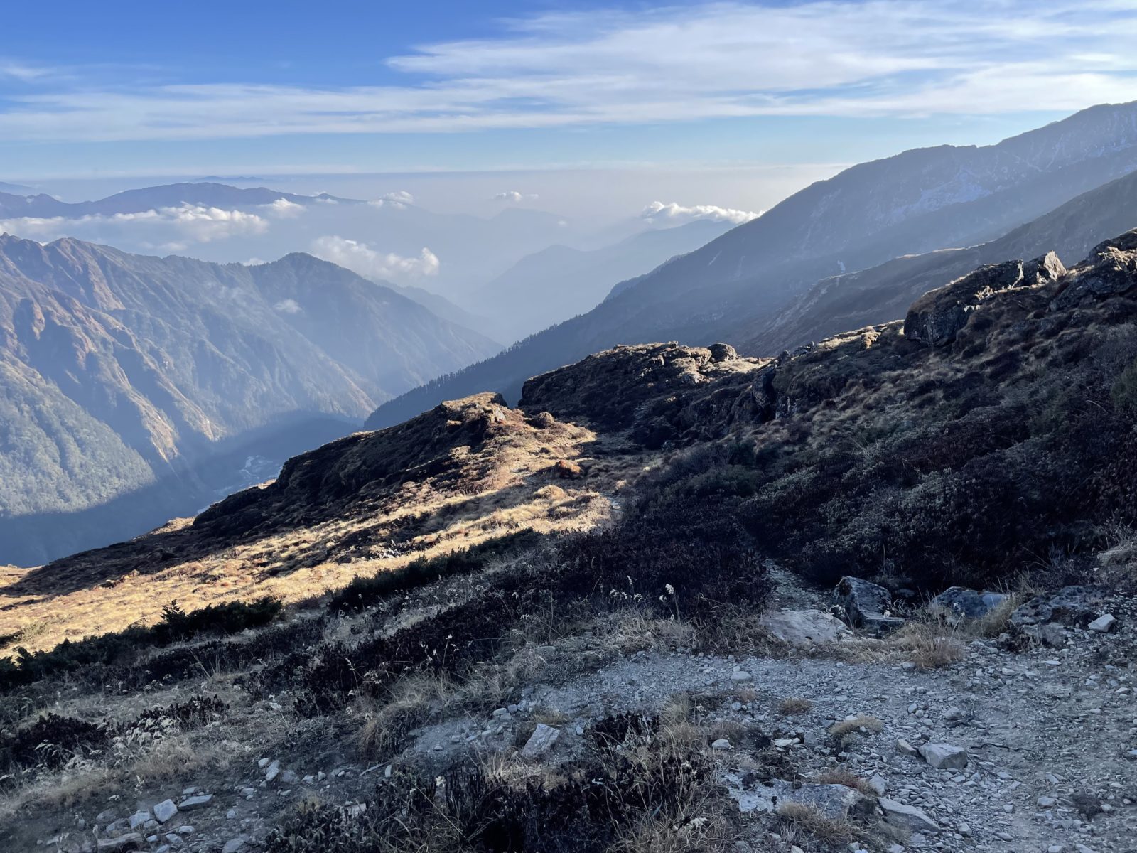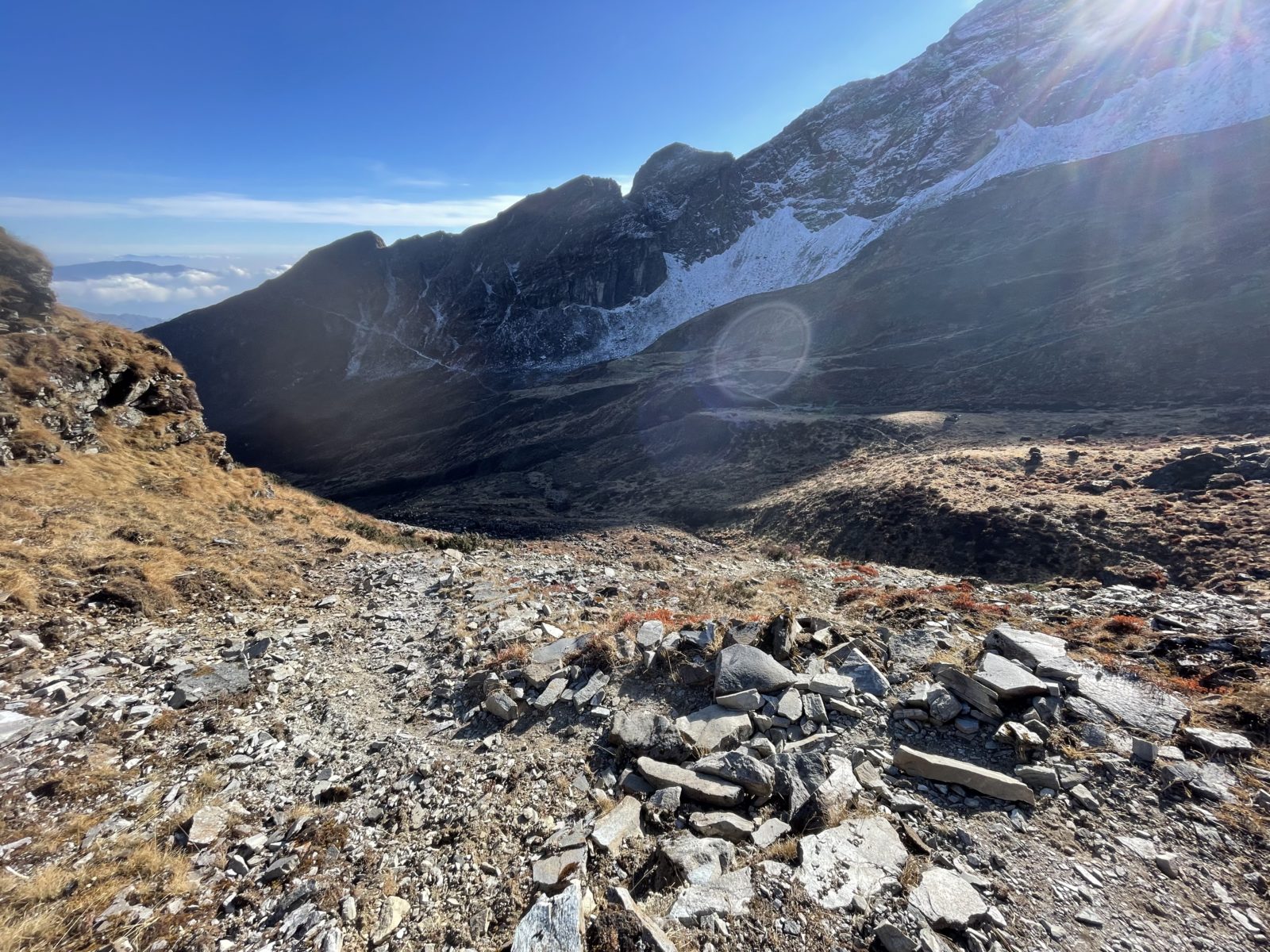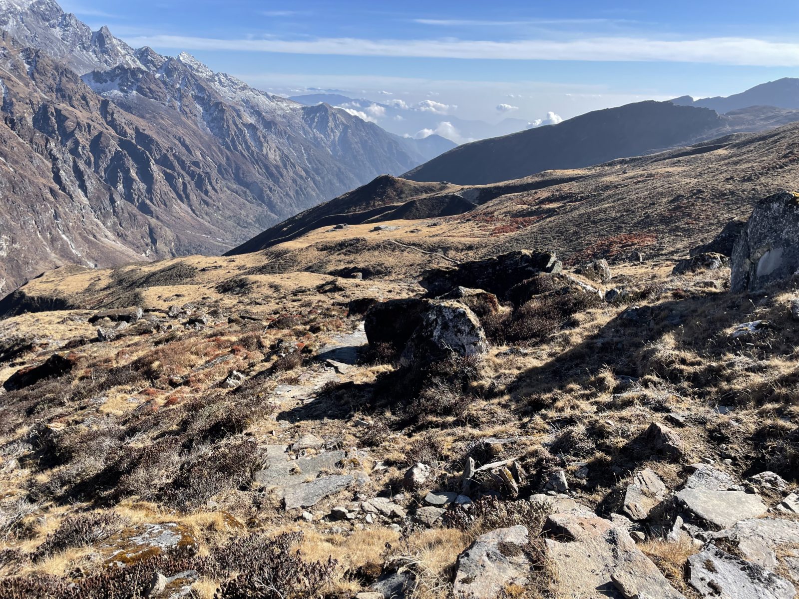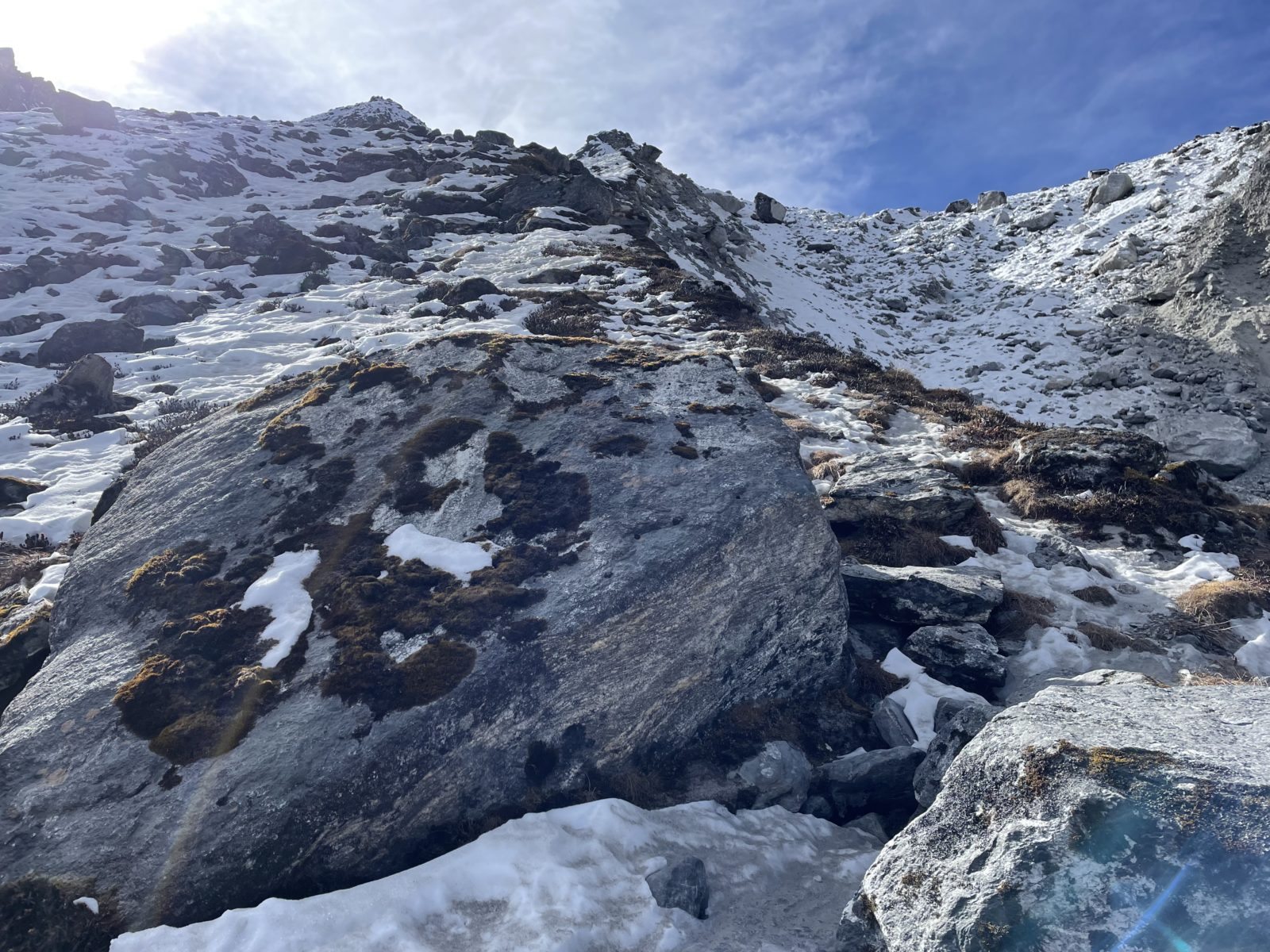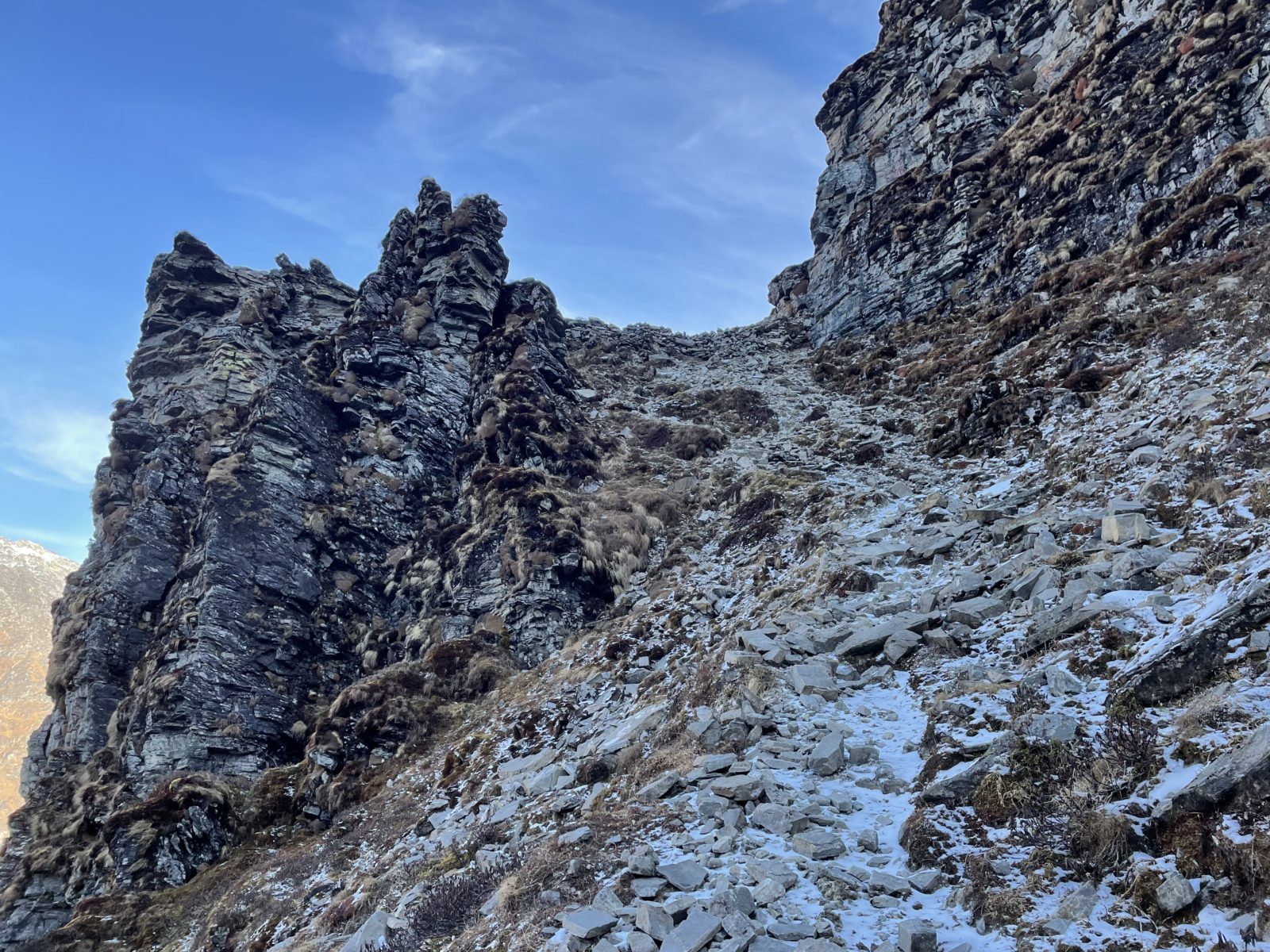 Aktualizace 11. 1. 2022: Po výměně několika emailů s Vojtou, který šel přes Ganja La na jaře 2018, vyšlo najevo, že normální cesta přes sedlo vede jinudy. Vyleze se po žebříku a pak se traverzuje doleva, až na hřeben do sedla. Já jsem místo toho šel směrem doprava. Vycházel jsem z toho, co je v OpenStreetMap, ale tam je to očividně blbě. Tím se taky vysvětluje, proč jsem měl takový problém při sestupu ze sedla na jih – na té správné cestě jsou zkraje serpentýny. Tak třeba příště…