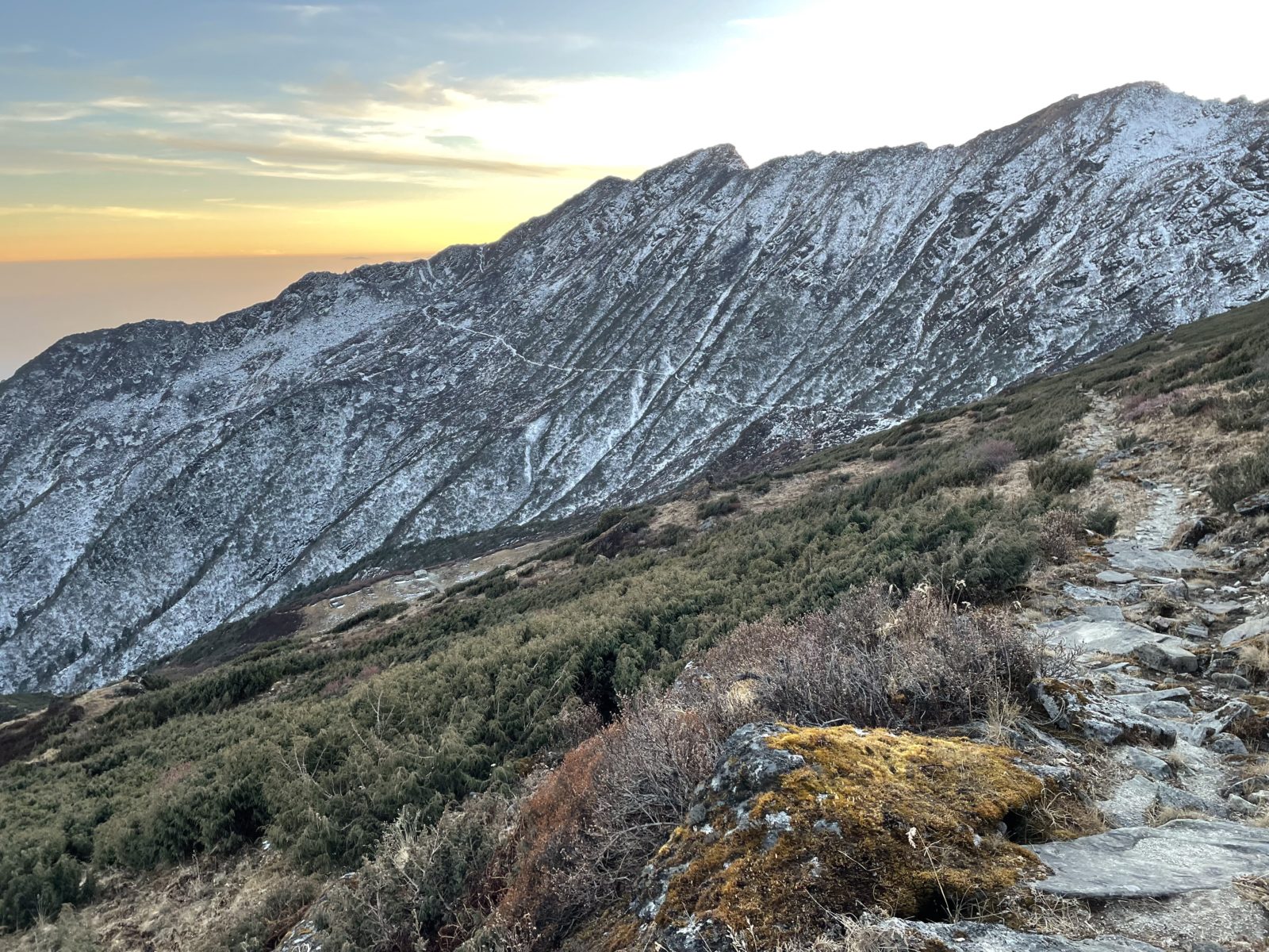 Po chvíli se dostanu nad nějaký šutr a taky už to není tak strmé. Uf, nejhorší mám za sebou. Teď už je to jen pár minut a jsem na hřebenu. Kouknu na druhou stranu a jsem v úžasu, ale taky trochu v úděsu. Všude jsou tuny sněhu. I místní mi včera říkali, že na druhé straně sníh nebude, je to přece jižní strana…