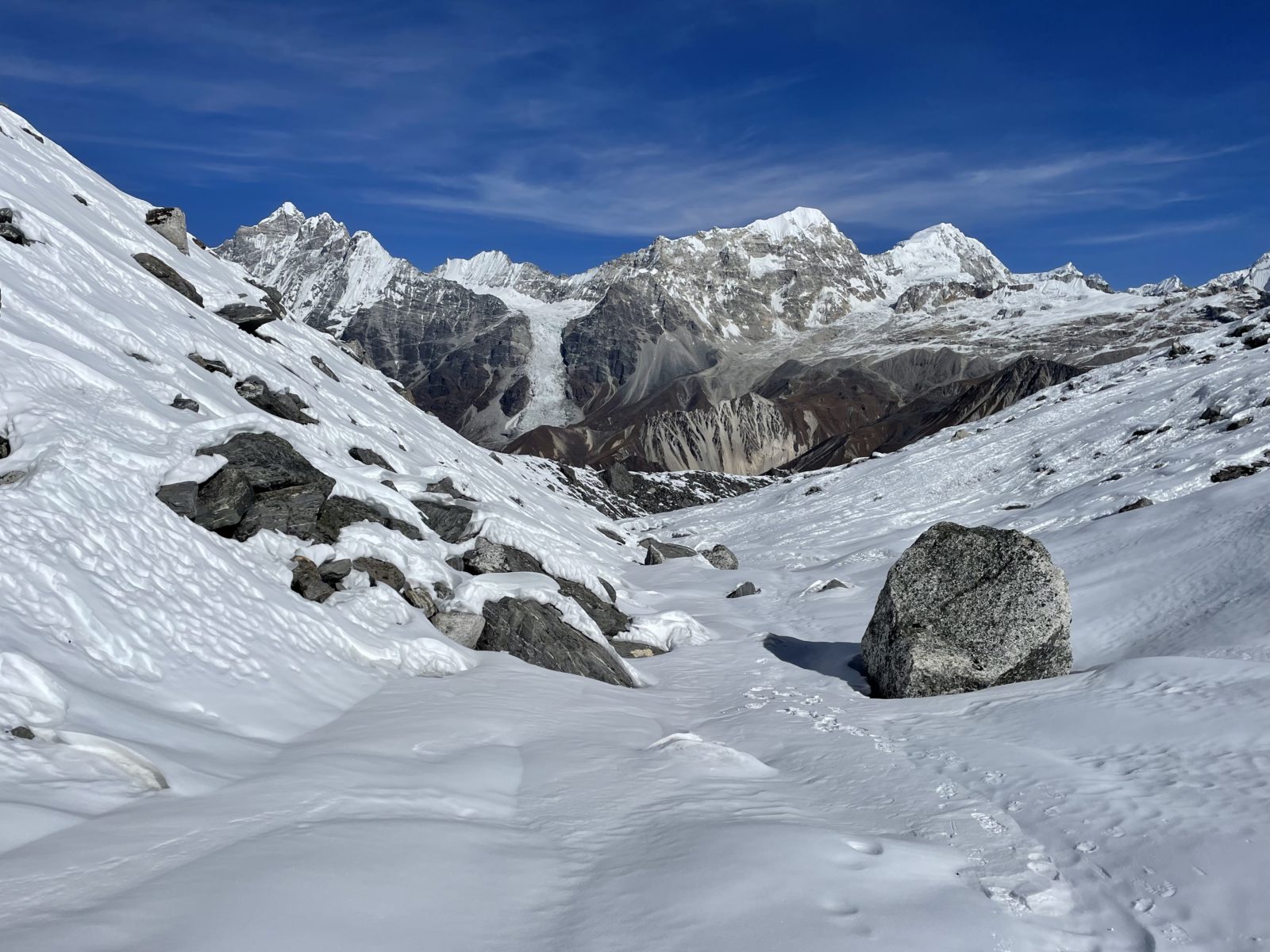 Asi tak v 9:30 začíná sníh. To teda brzo. Jsem teprv ve výšce 4700 m.