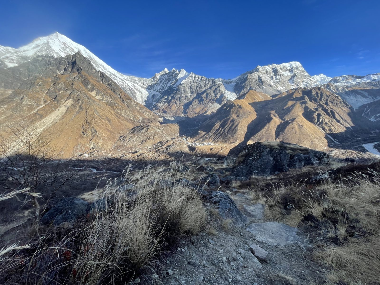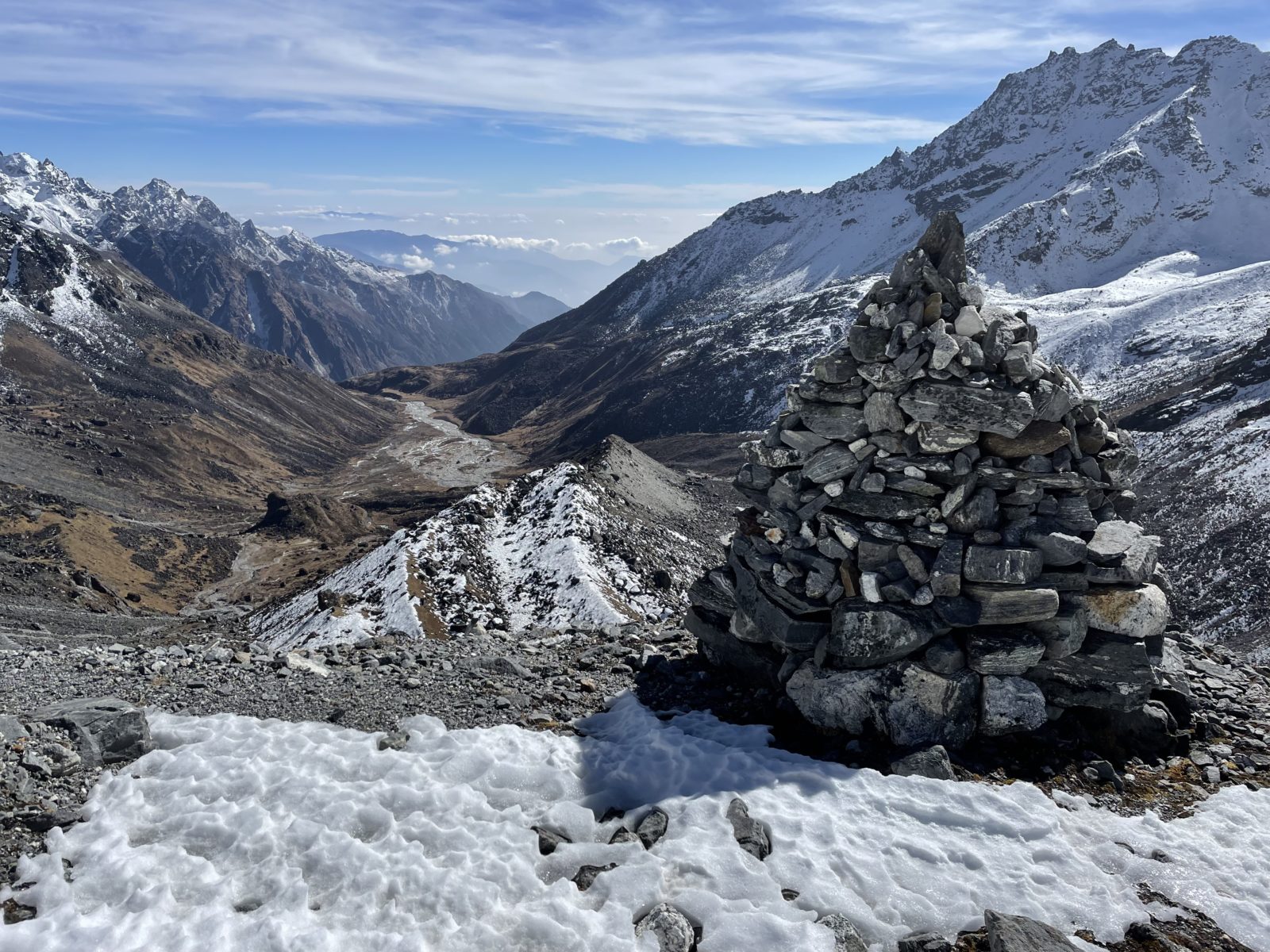 Jdu na to! Je to poctivé stoupání, není to zadarmo. Místy jsou schody. Je tu dost sněhu. Asi za 25 minut jsem na rozcestí – doleva vrchol, doprava Tarke Ghyang. Začíná sestup. Teď už jen 1100 výškových metrů dolů a je to! Jsem už celkem unavený, párkrát uklouznu, jednou si při tom trochu odřu ruku, až dole si všimnu zaschlé krve.
