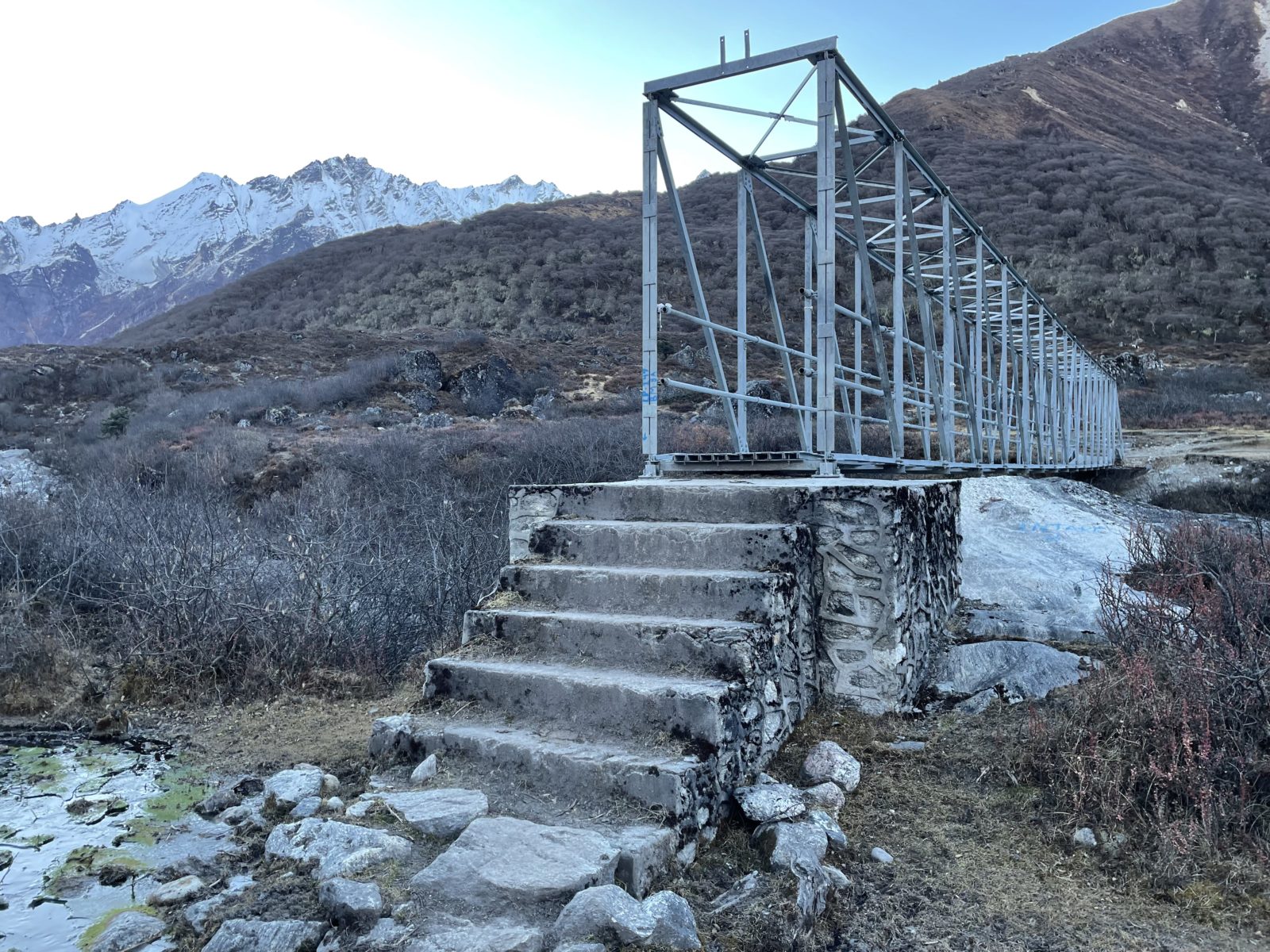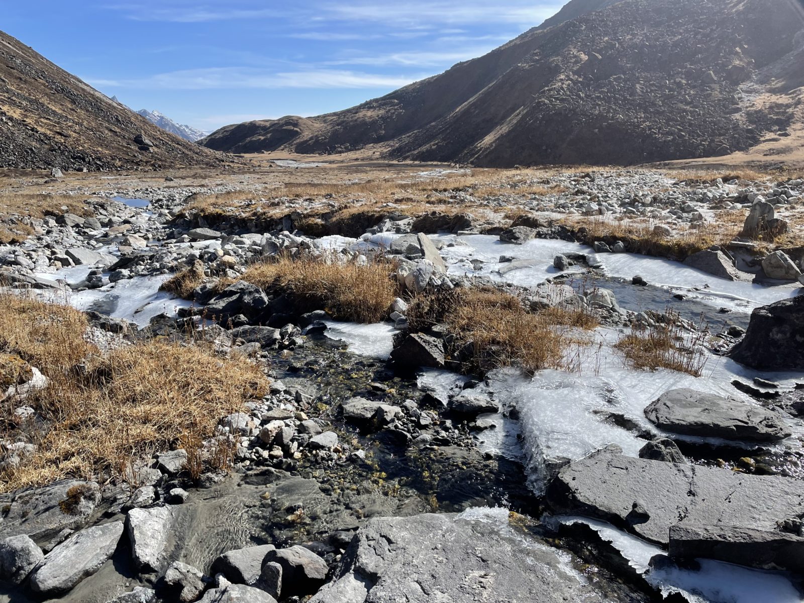Sundavám nesmeky a pádím dolů. Tak ve 13:40 jsem dole. Teda dole, pořád jsem ve výšce asi 4500 m. Dojdu k řece a přeskákám na druhou stranu.