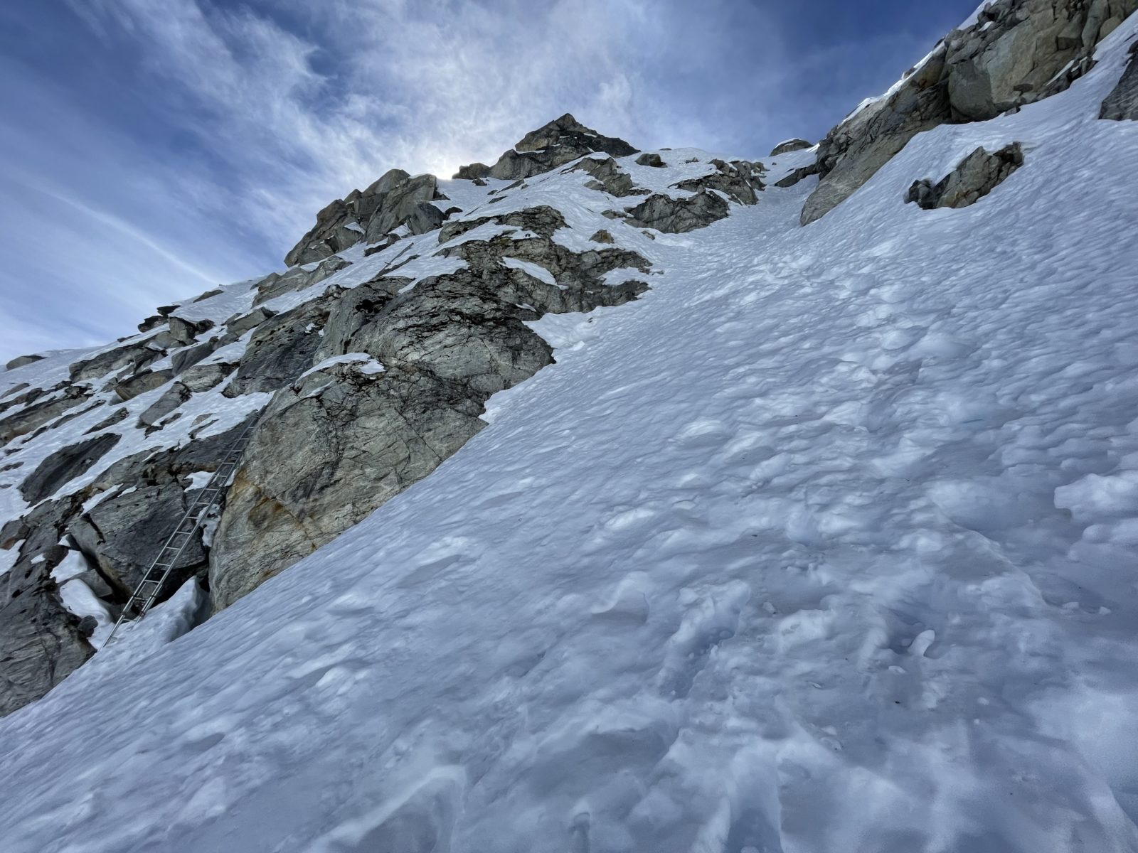 Stopy vedou přímo vzhůru po svahu, žebřík nechávají vlevo. Zatím dobrý. Ale když jsem v nejstrmějším úseku, tak stopy najednou končí. Hmm. Chvilku přemýšlím. Vrátím se o trochu níž a vydám se směrem doprava, vedou sem opět nějaké stopy. Jenže opět končí. Teď už mi nezbyde, než těch posledních 10-20 strmých metrů vylézt sám svou vlastní cestou. Kopu do sněhu, abych si udělal stup. Nedrží to, sype se to. Zapojím i ruce, abych rozložil váhu. Kop, kop, levá pravá noha; box, box, levá pravá ruka. A takto postupně nahoru. V této výšce je to velice vysilující.
