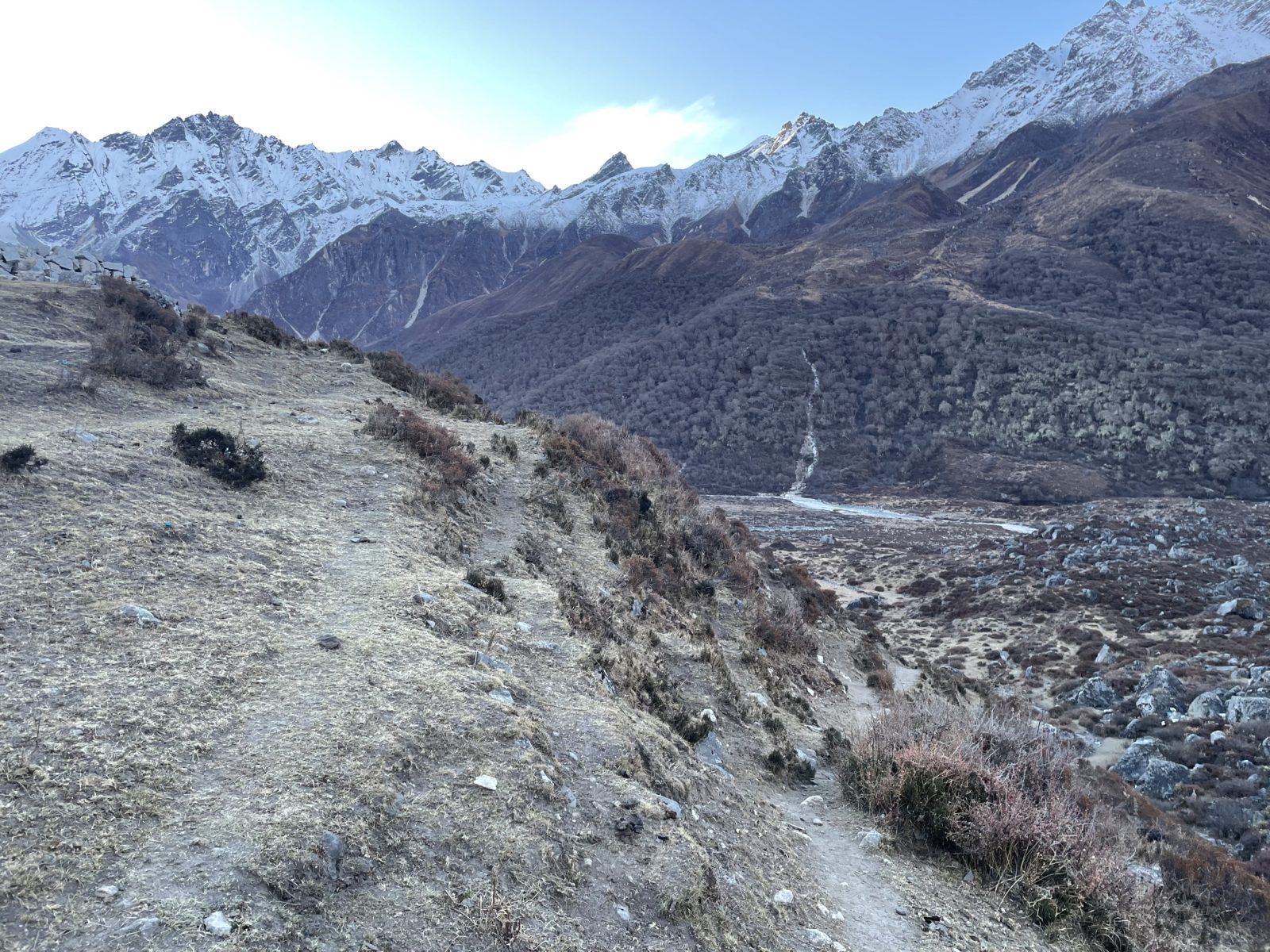 Sestupuju až do výšky 3450 m. Je tu les a v lese sníh. To jsou věci. Jsem v jakémsi sedle. Že by tu bylo výrazně tepleji, to teda ne. To bude tím sněhem. Problém je, že abych se dostal do vesnice, tak ještě musím vystoupat asi 200 m pod vrchol Ama Yangri. Dávám pauzu a přemýšlím o tom. Fakt už se mi nechce, už jsem dnes ušel 28 km a nastoupal 2100 m. No ale jednou jsem se dal do boje…