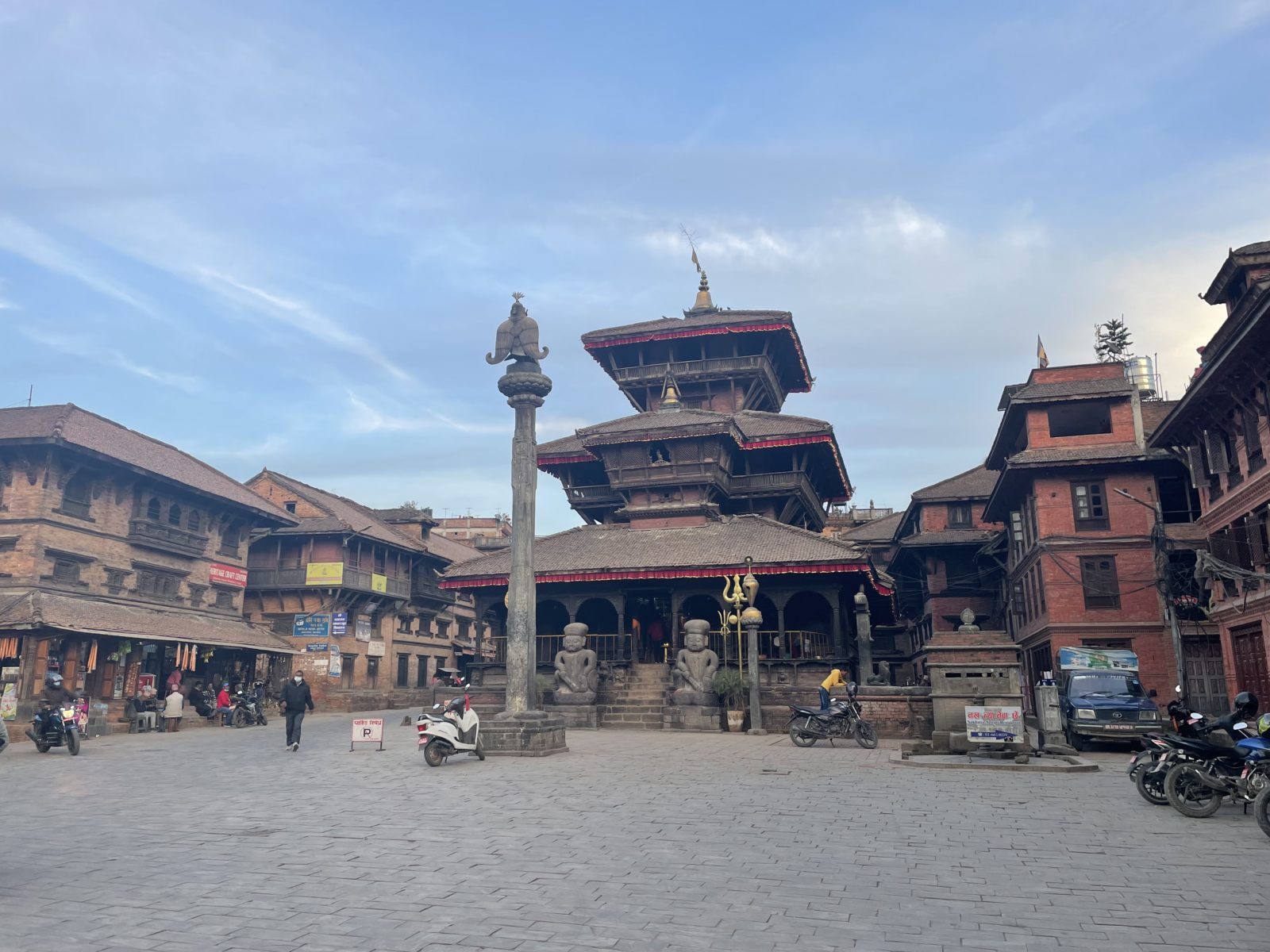 Potřebuju se dostat do Bhaktapuru, kde strávím poslední 3 noci. Už je to taková tradice, oblíbil jsem si to tam. Je tam totiž celkem klid a mají hezké historické centrum, které je v UNESCO. A je to stejným směrem jako letiště – na východ, jen o trochu dál. Takže když pak člověk odjíždí, tak je to snadné a už ani není třeba jezdit do Kátmandú. Sice bych tam mohl jet opět hromadnou dopravou, borec říká, že to není obtížné, ale už se mi to nechce absolvovat. Nechám si objednat odvoz. Stojí to 1300 Rs (260 Kč). Asi by to šlo i levněji.