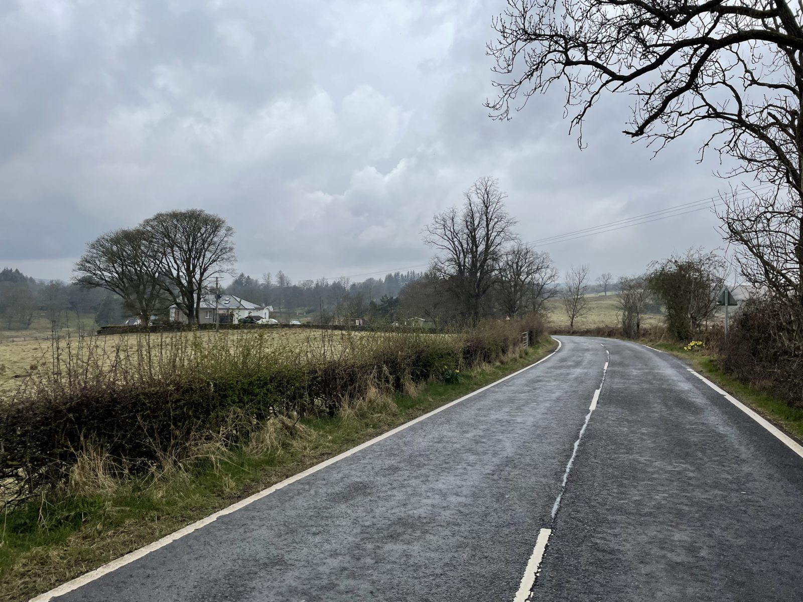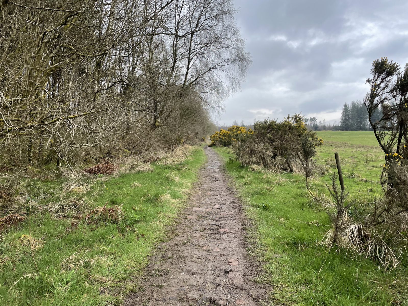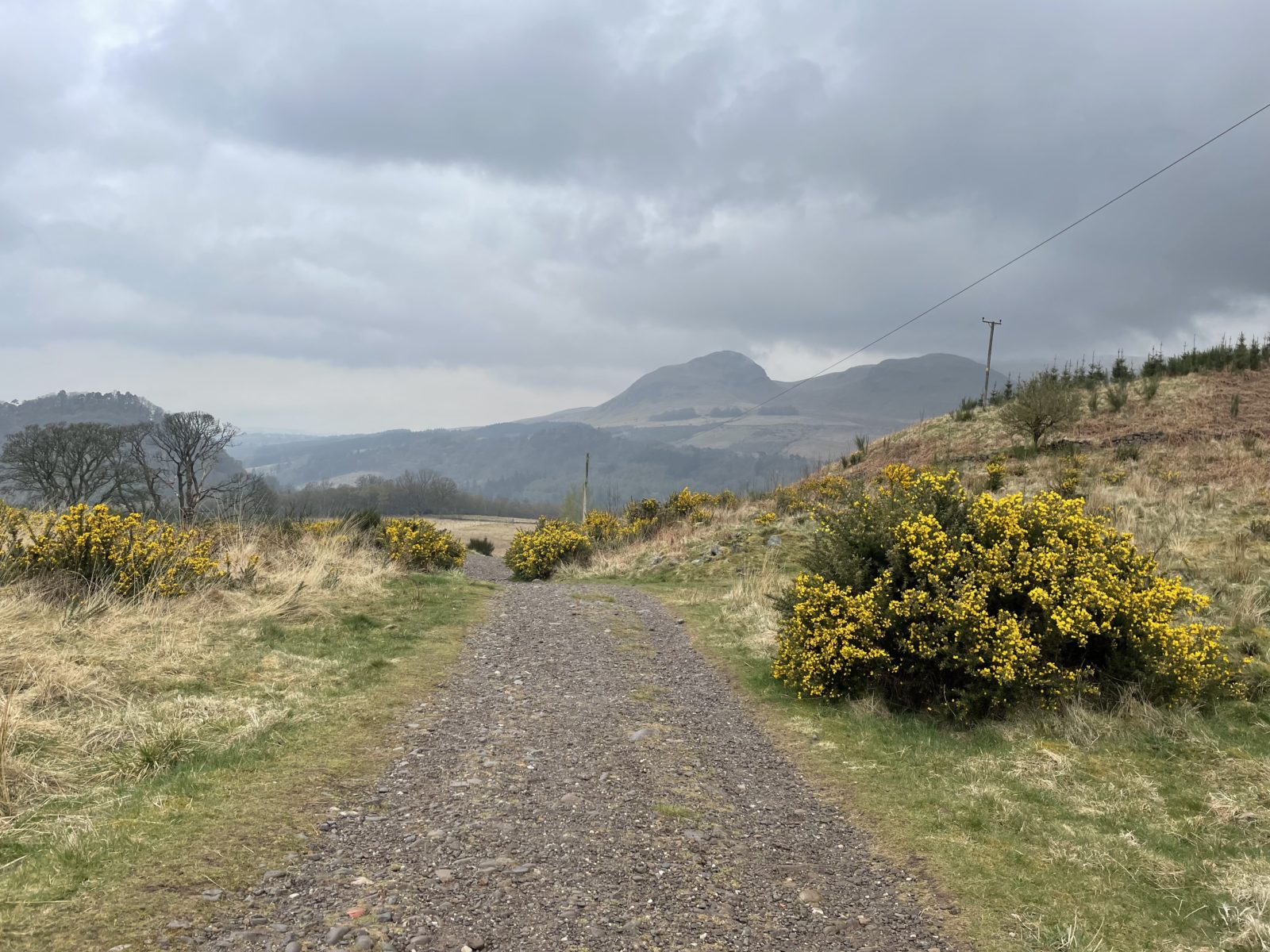 Někdy o čtvrt na čtyři se ocitnu na asfaltce, jdu po ní pár kilometrů. Po levé straně mám vesnici Drymen. Tady končí první etapa a hodně lidí tu první den končí. O půl hodiny později scházím z asfaltky zase na cestičku. Následuje ještě pár rovných úseků.