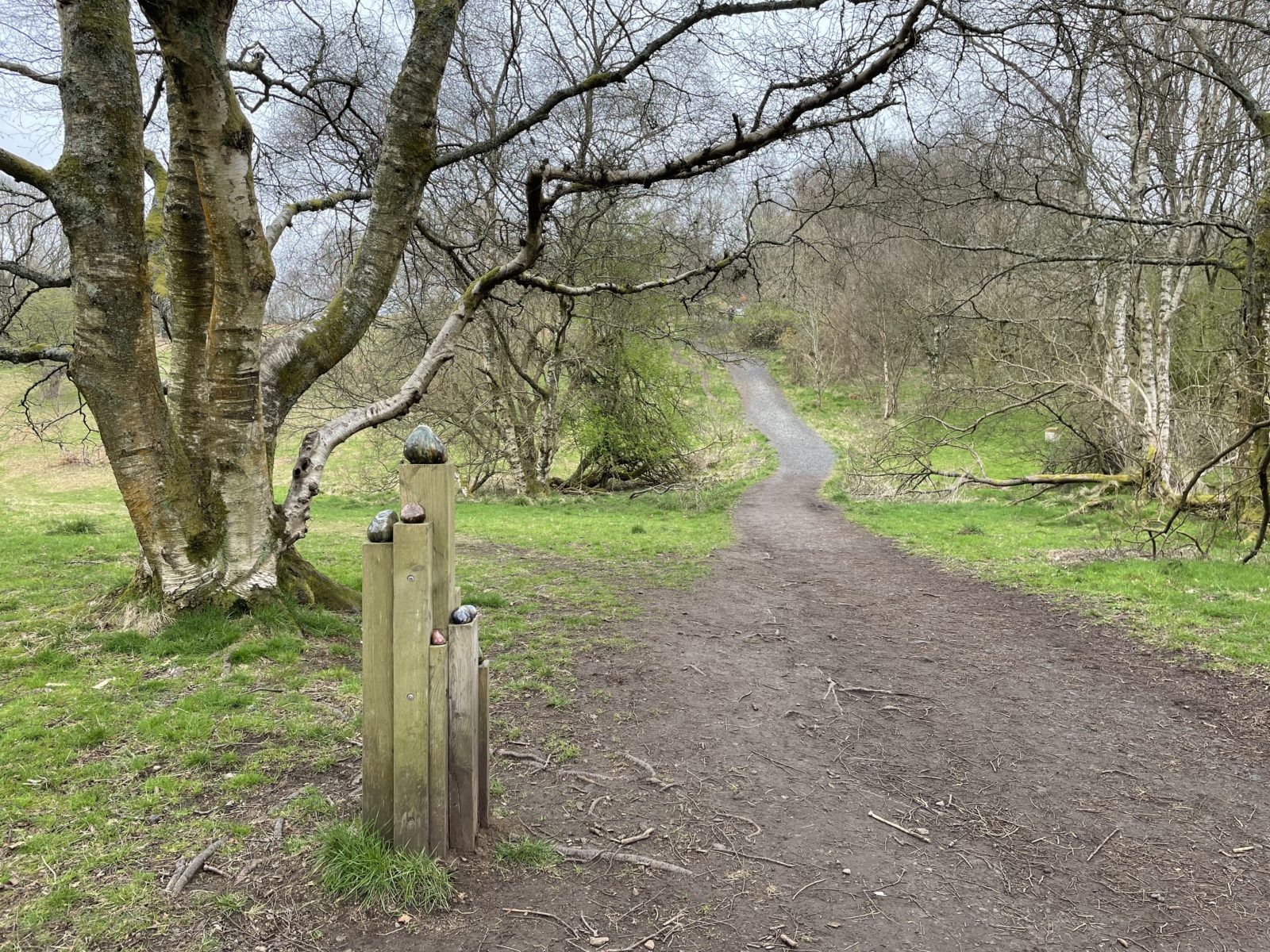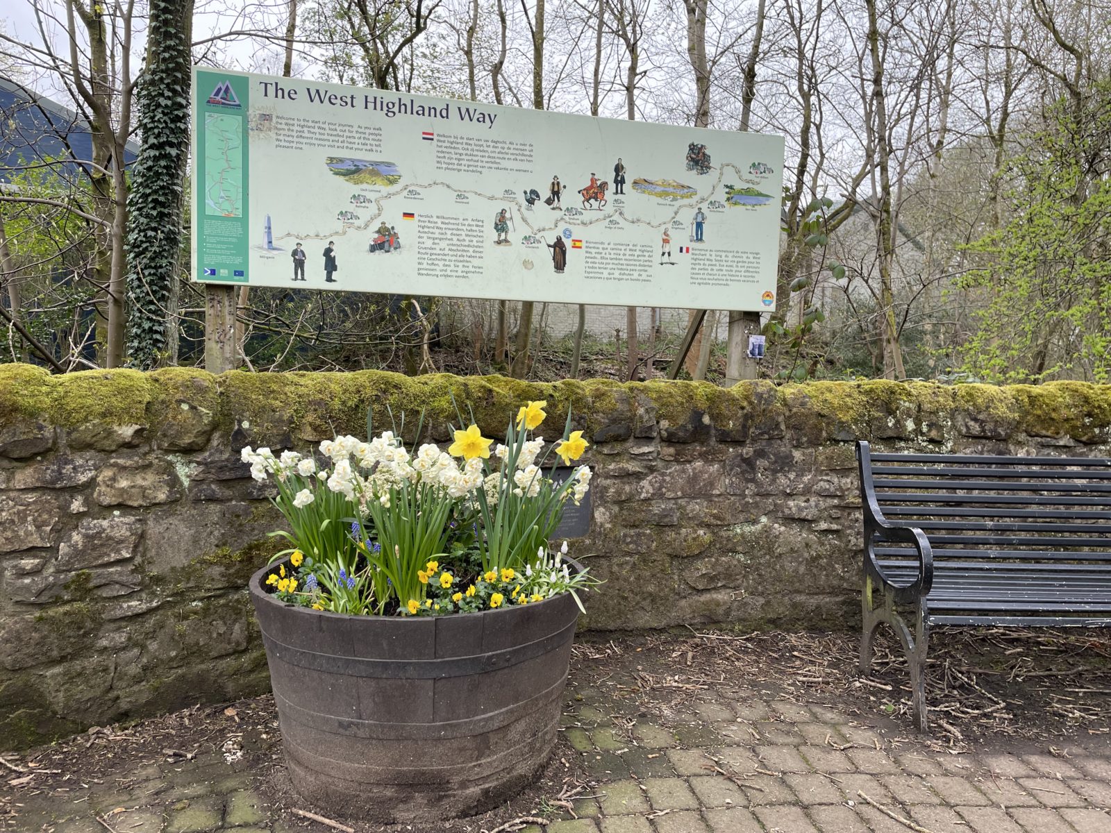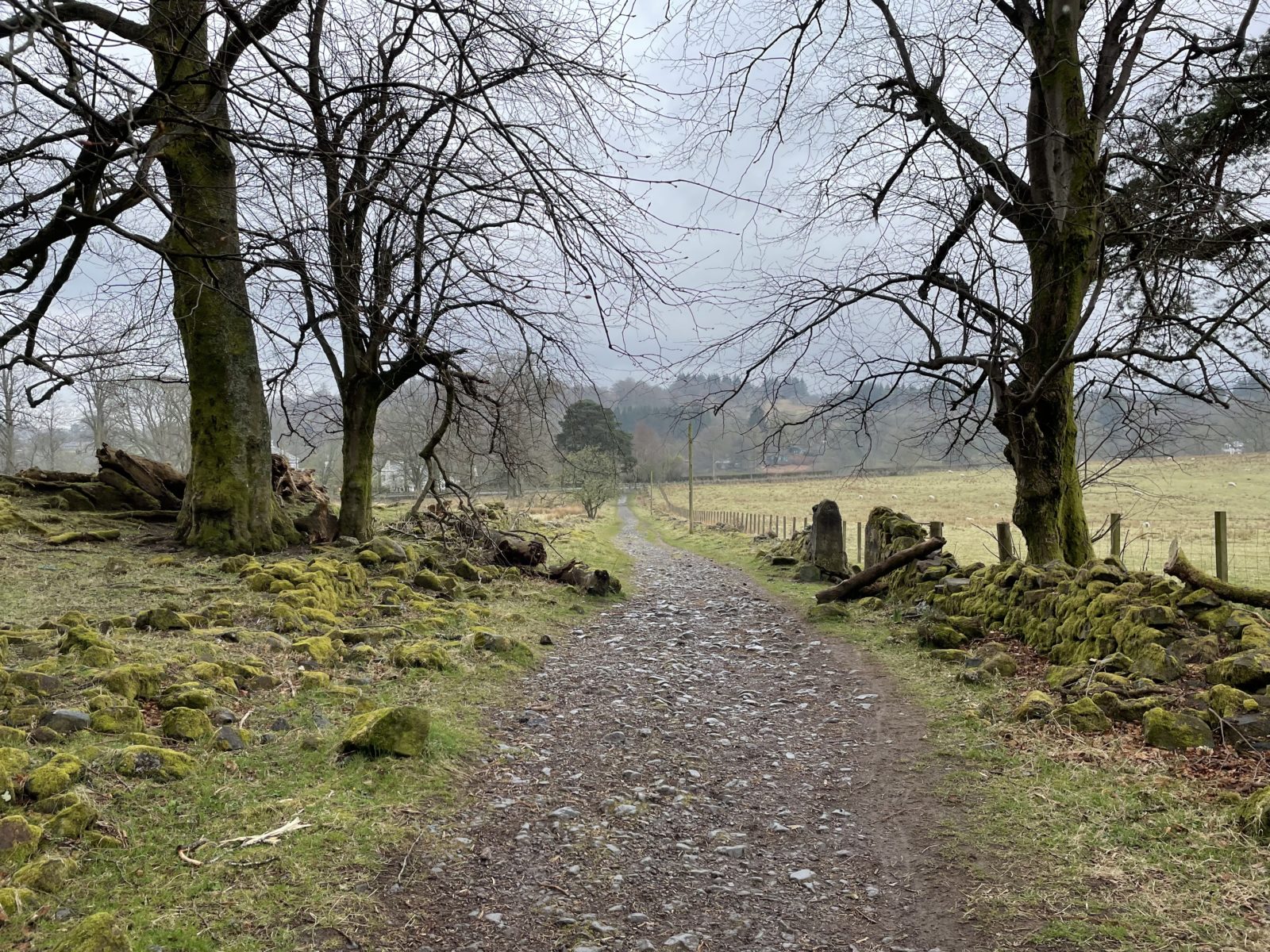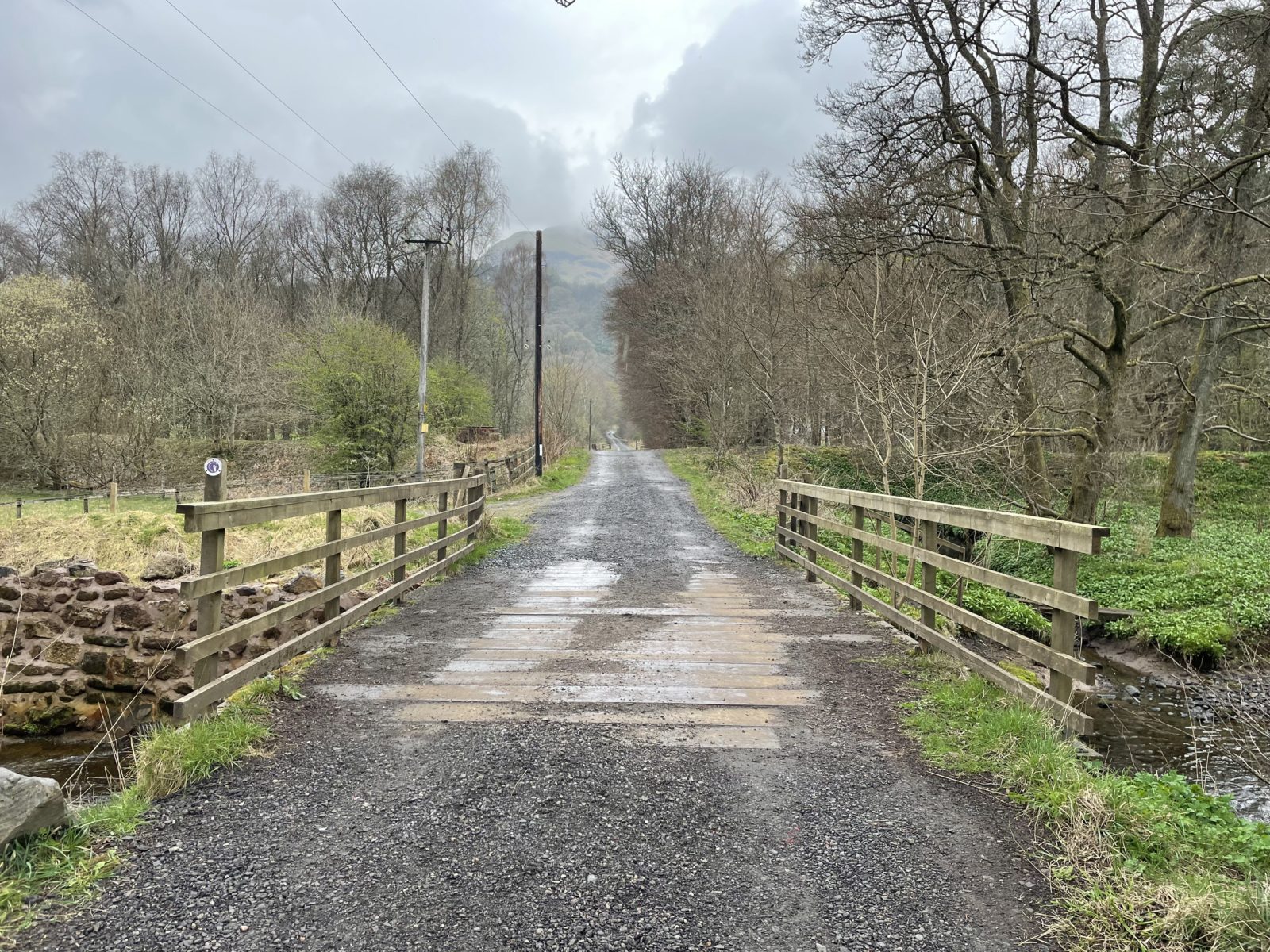 Někdy o čtvrt na čtyři se ocitnu na asfaltce, jdu po ní pár kilometrů. Po levé straně mám vesnici Drymen. Tady končí první etapa a hodně lidí tu první den končí. O půl hodiny později scházím z asfaltky zase na cestičku. Následuje ještě pár rovných úseků.