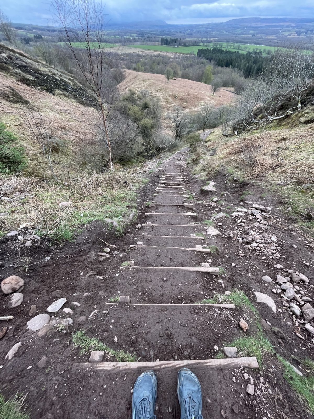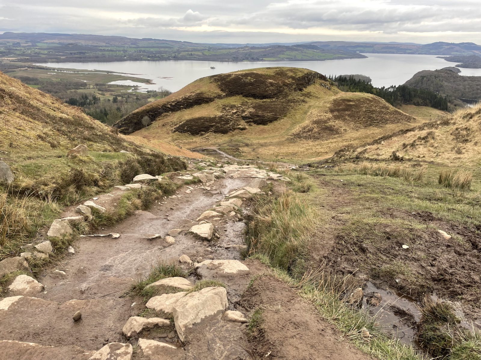 Zhruba v 5 konečně začíná zajímavý úsek. Začínám stoupat zezadu na kopec Conic Hill (358 m) nad jezerem Loch Lomond.