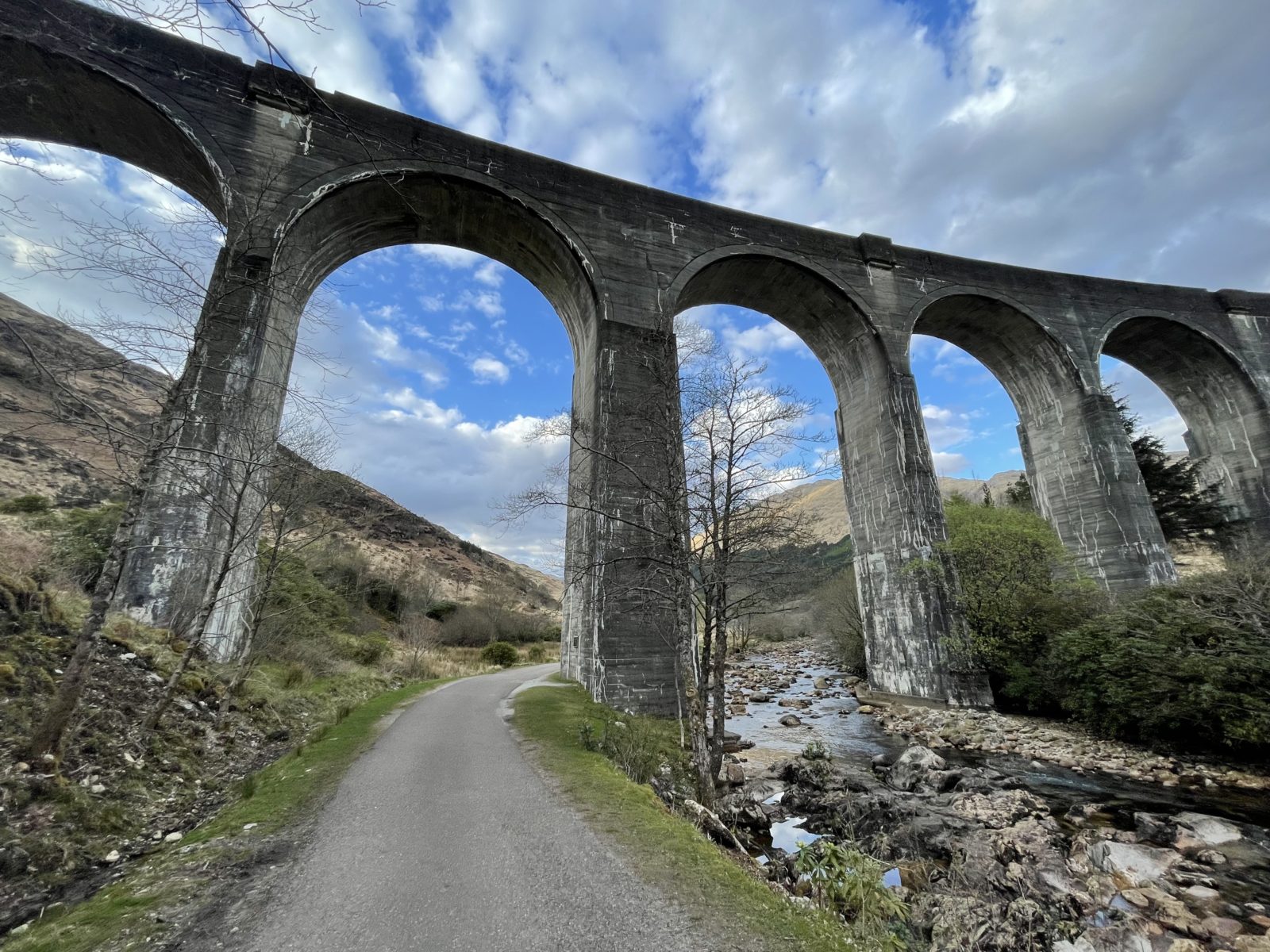 Za chvíli dojdeme do návštěvnického centra Glenfinnan. Je to známé hlavně tím, že je tu viadukt, kde se natáčel Harry Potter. Ten viadukt je zajímavý taky tím, že je z roku 1897 a je z betonu, což v té době bylo dost pokrokové.