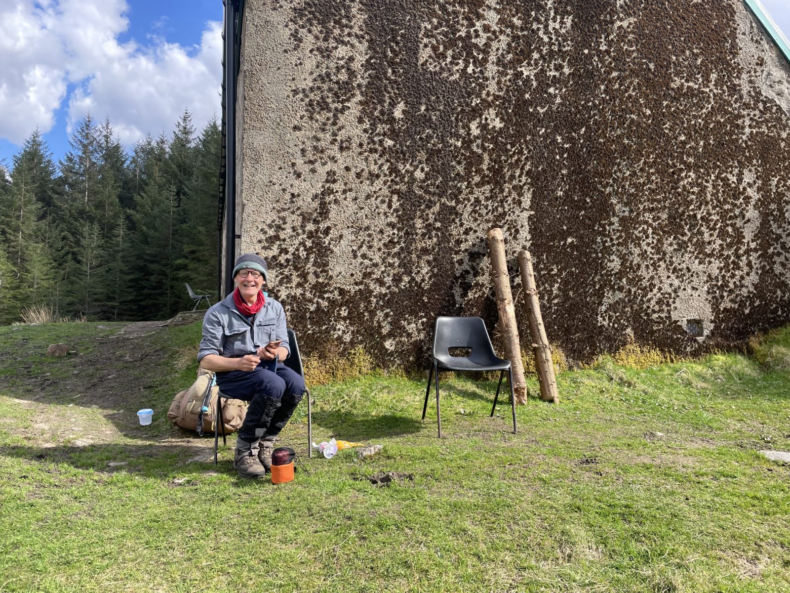 Cesta teď mírně stoupá. Je to ještě asi 4 km k další bothy. Docházím kolegu ze včerejška – staršího týpka, co jde už několik týdnů z domu. Řeknem si, co se stalo od včerejška, kdy jsme se viděli naposled, a pak jdu napřed. Pár minut po třetí hodině docházím k bothy. Je asi 50 m pod cestou a je na krásném místě – je tu hezký výhled. Svačím, už zase. Za chvíli přichází i kolega. Sluníčko svítí, nefouká tu, je to idyla. Zdržím se tu snad skoro hodinu!