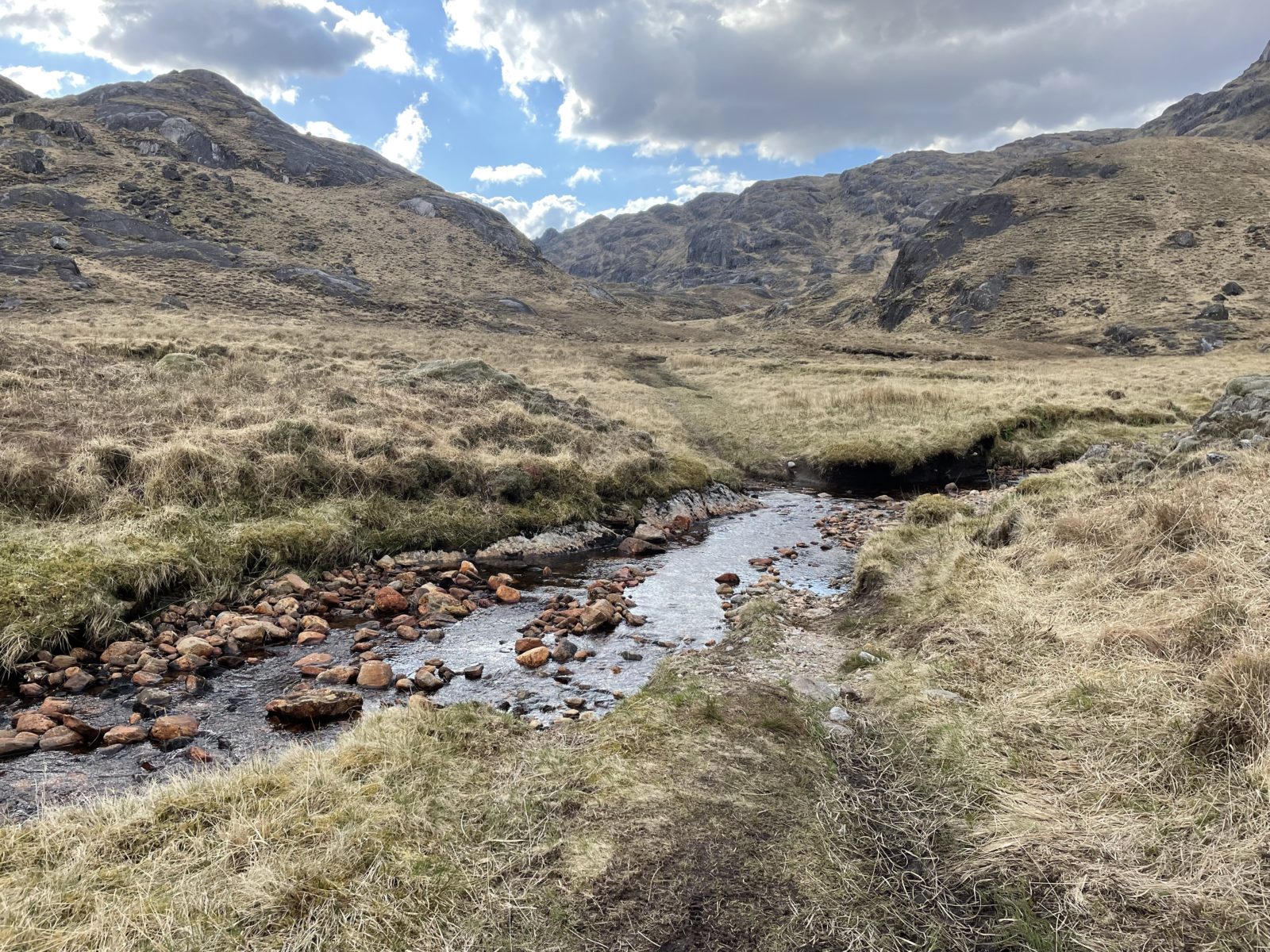 Zhruba ve 12:45 jsem v údolí na stezce, hurá! Je fajn být zase na normální stezce. I když teda místy jsou to trochu bažiny. Chvíli čekám na sluníčko a pak dávám pauzu na svačinu. Pak pokračuju dál.