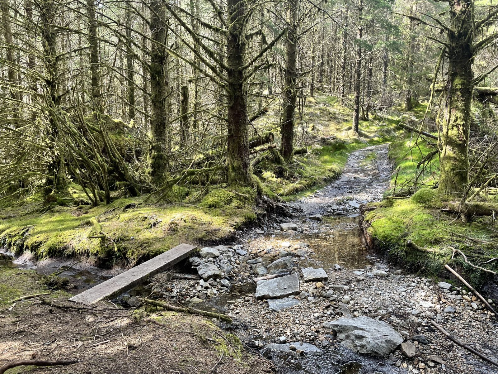 Dneska jsem spokojenej. Tím, že jsem si přidal tu hřebenovku, tak možná nestihnu dojít tak daleko, jak jsem původně myslel, ale to vůbec nevadí, mám z toho radost, bylo to moc hezký. Ale zároveň vnímám, že tahle stezka opravdu není lehká. Velmi často je to podmáčené a člověk se snaží tomu mokru vyhýbat, jak to jde, což stojí energii. Jak mi na WHW přišla široká cesta už trochu otravná a nudná, tak tady se z ní člověk raduje, když se objeví.