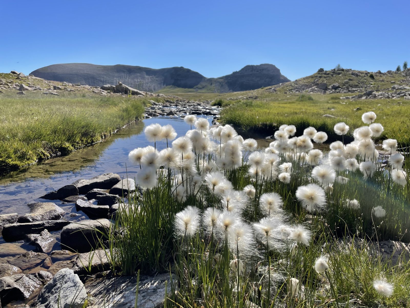 Pár minut po páté jsem konečně v sedle. Na druhé straně vidím krásné jezero a u něj pár stavení – to bude moje chata. Sednu si na šutr s krásným výhledem a ještě trochu úřaduju. Podaří se mi uploadovat včerejší aktivitu a pak i přidat fotky na Stravu.