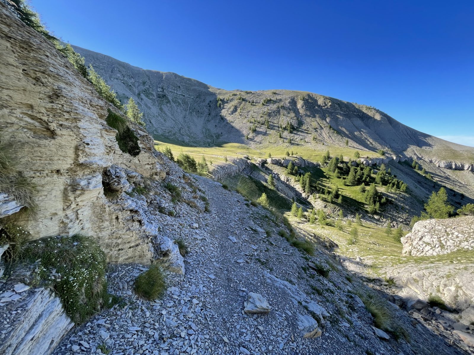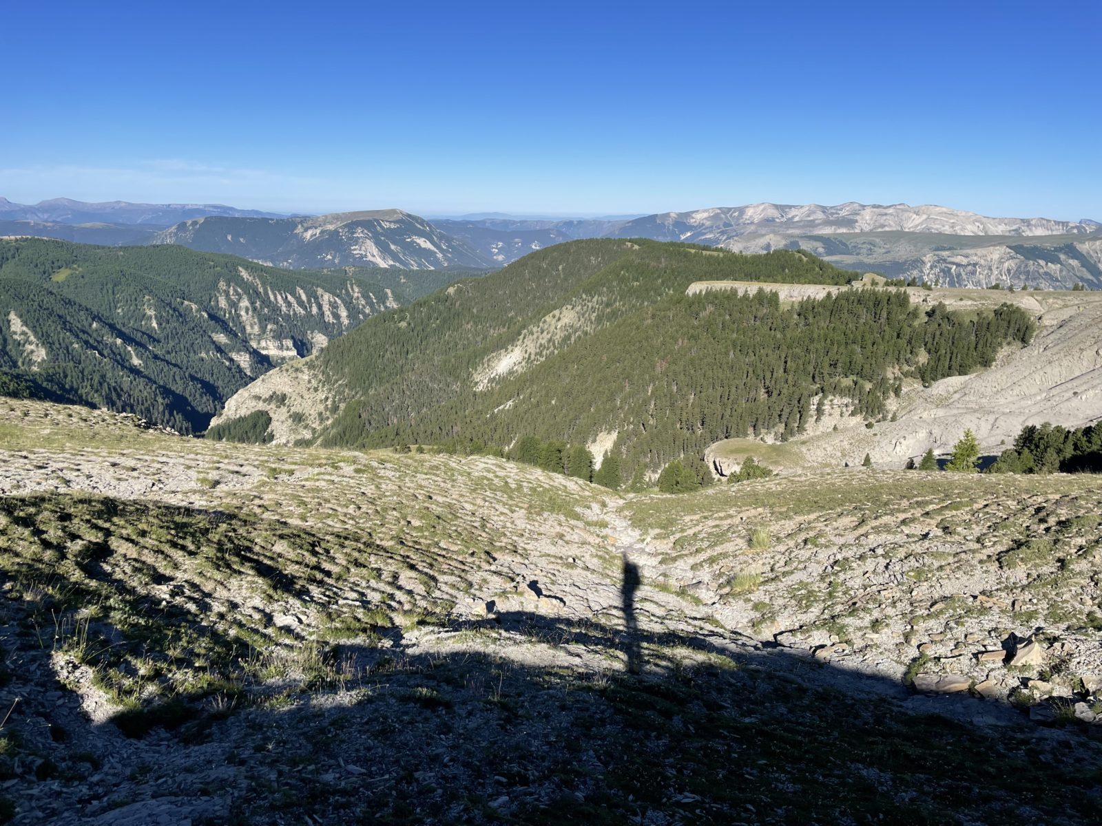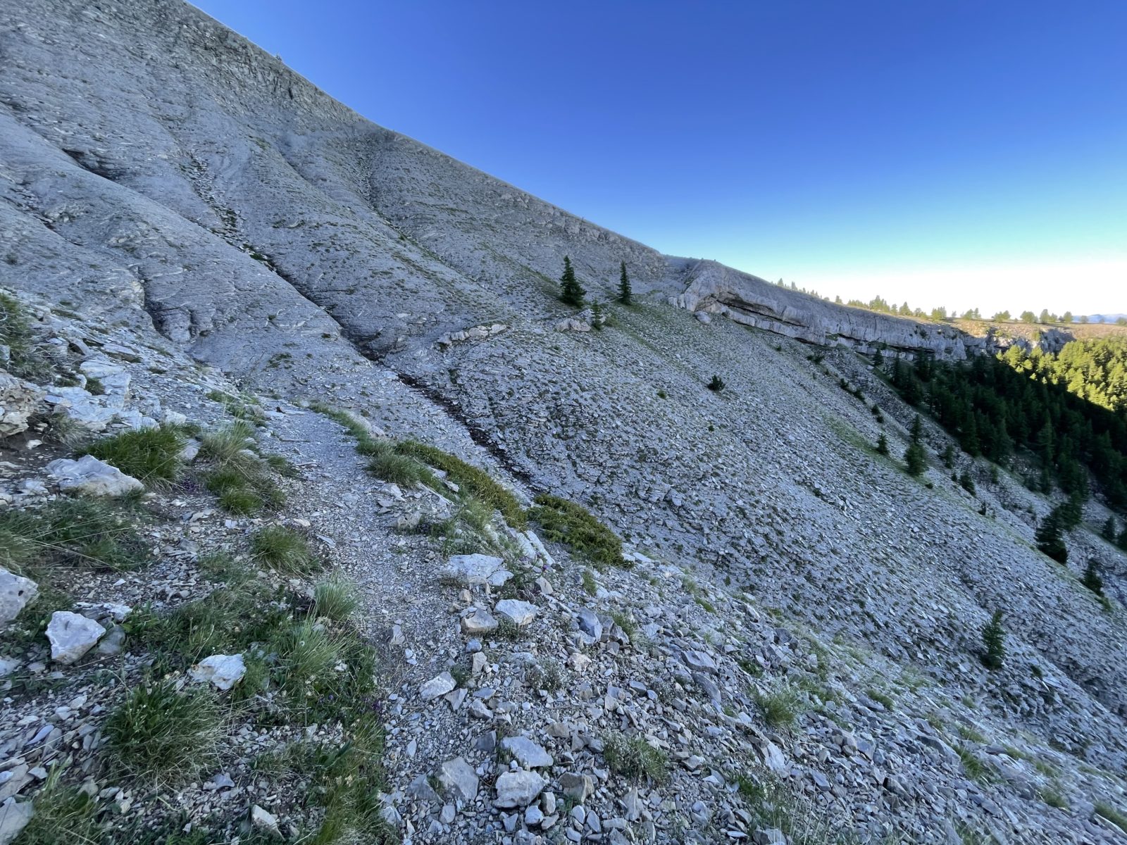 Na začátek mě čeká stoupání pár set metrů lesem. Chvilku po osmé se dostávám z lesa ven. Je to nádhera! Jsou tu taková obří skalní břicha. A k tomu to ranní slunko. Teď už je to spíš takový travers. Jsou tu krásné výhledy na hory v dálce.