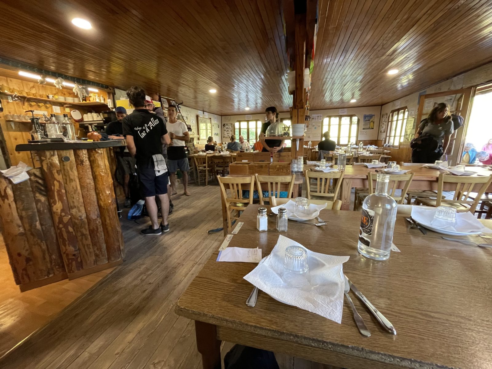 Přendám si věci a je akorát čas na večeři. Posadí mě vedle páru, co mi před chvílí blokoval sprchu. Dáme se do řeči. Jsou to učitelé. Ona učí tělocvik, on dějepis a zeměpis. Bavíme se o turistice a pak trochu o covidu. Na večeři je prve cizrnový krém a pak lasagne. Obojího je dost i na přidání. A pak dezert z listového těsta. Dám si k tomu dvě skleničky růžového vína, to je tu populární. Celkově je tu hodně živo. Prý je to sem od parkoviště jen asi 3/4 hodiny pěšky. Tím se to vysvětluje.