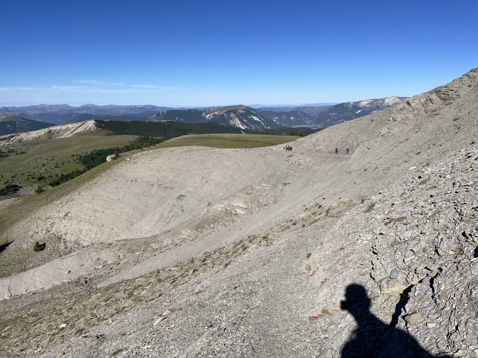 Jak se dostanu nad údolí, tak mám zase hezké výhledy. Stoupám, stoupám a pak začnu klesat až k silničce, co vede do sedla Col des Champs (2087 m). 5 minut po ní jdu a za tu dobu projede jedna motorka a 3 cyklisti.