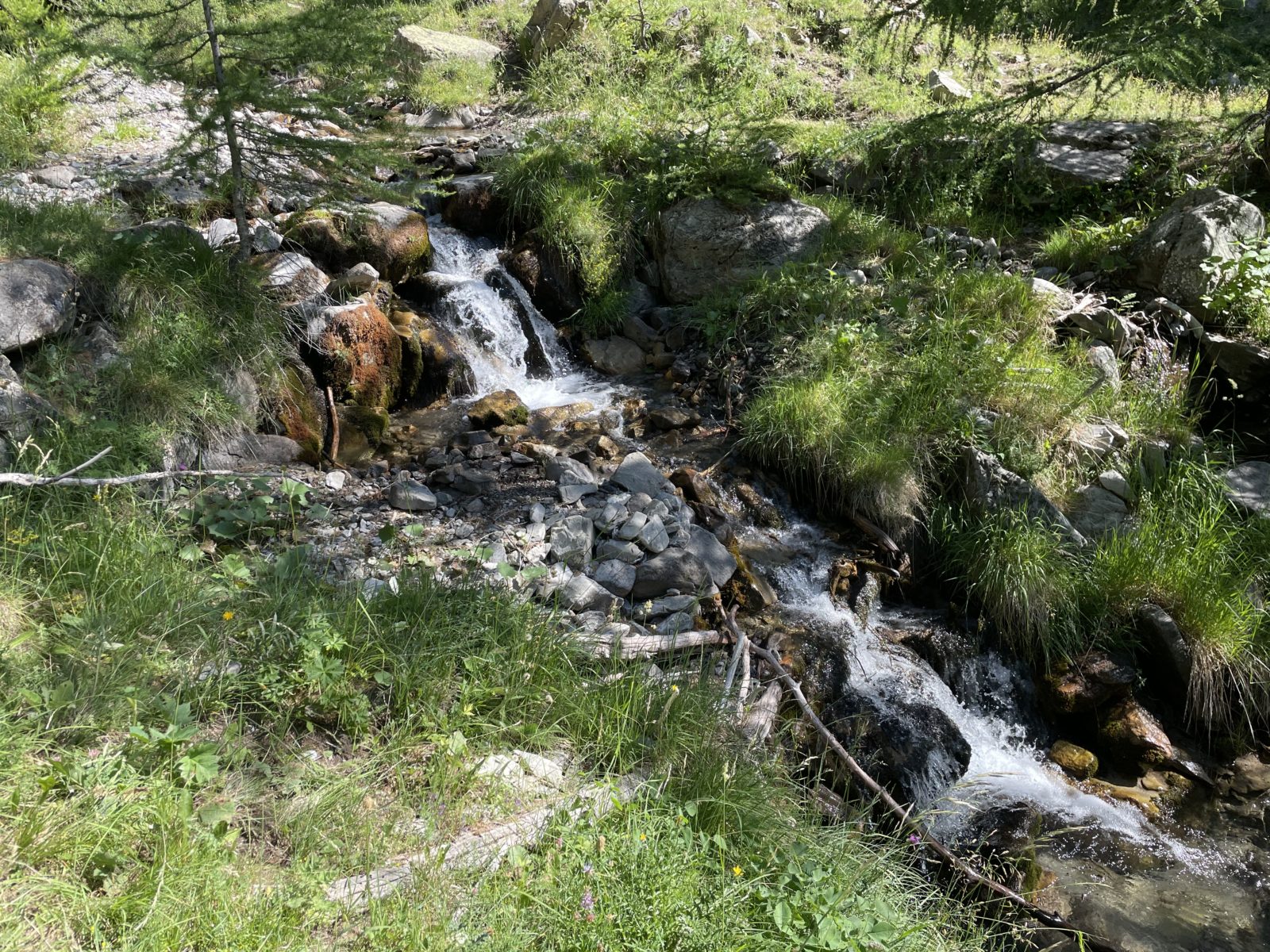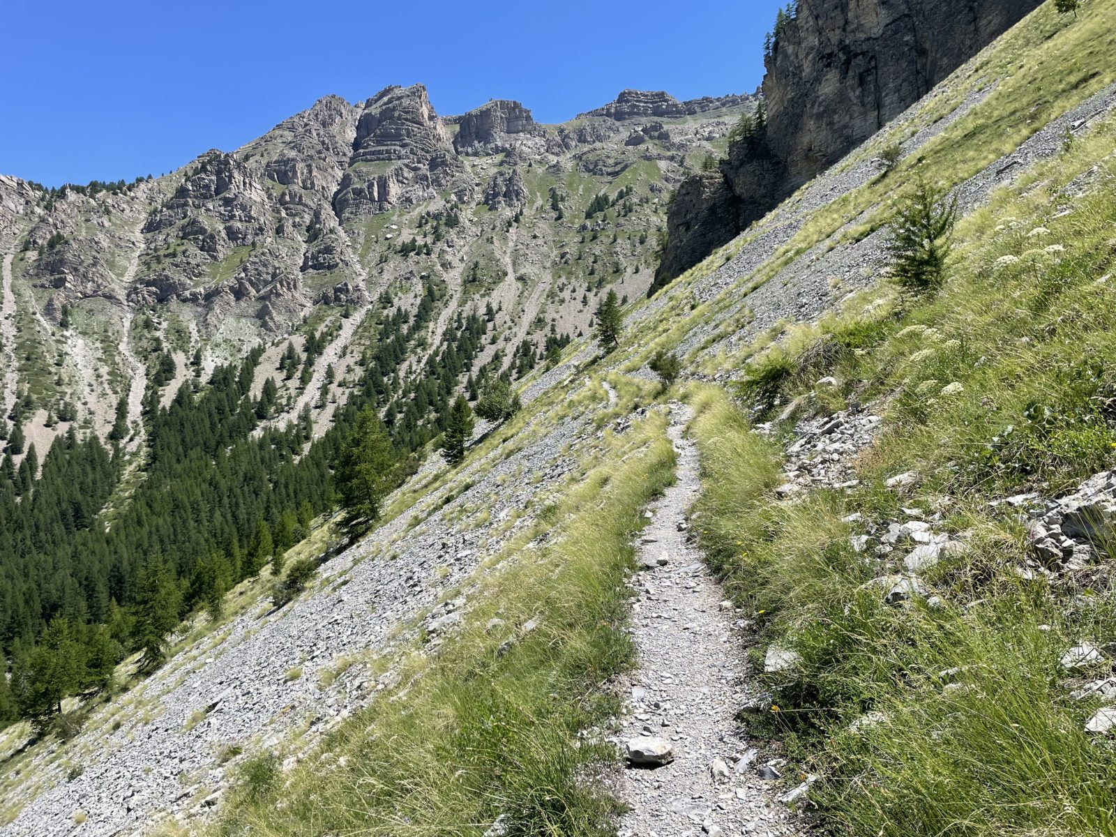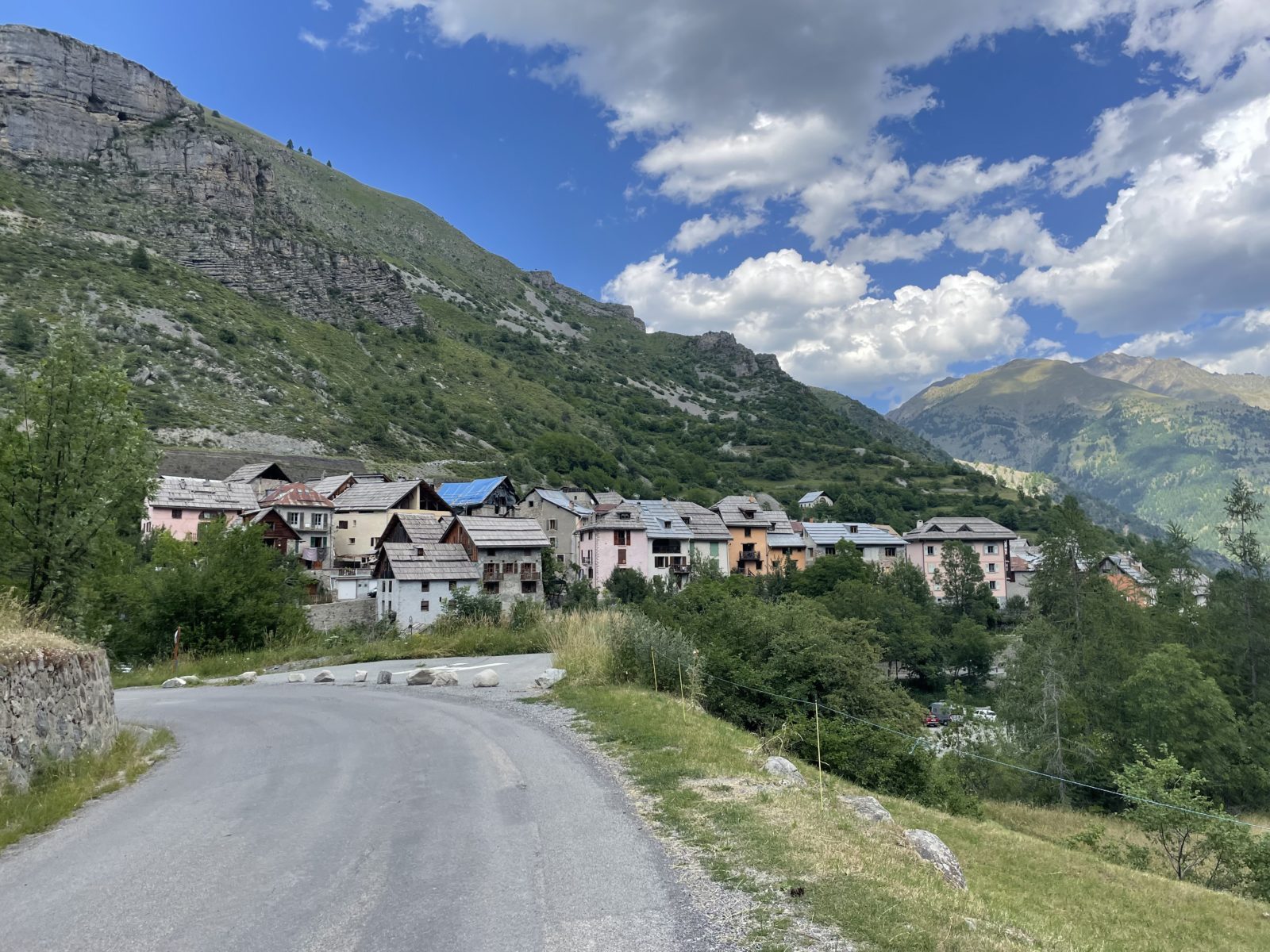 Teď už půjdu jen z kopce až do vesnice Saint Dalmas-le-Selvage (1500 m). Moc mě to na tom slunku neba. Po pár km prochazím kolem malé chaty. V mapě je to refuge, čekal jsem tedy něco většího. Je to zavřené a polehává u toho pár lidí. Ani se nezastavuju a pokračuju dál. Brzo začíná kamenitá cesta. Ta mě dovede až do vesnice ještě dalších 5 km.