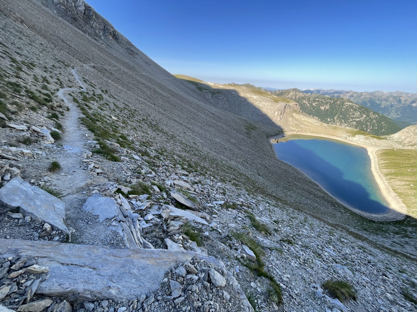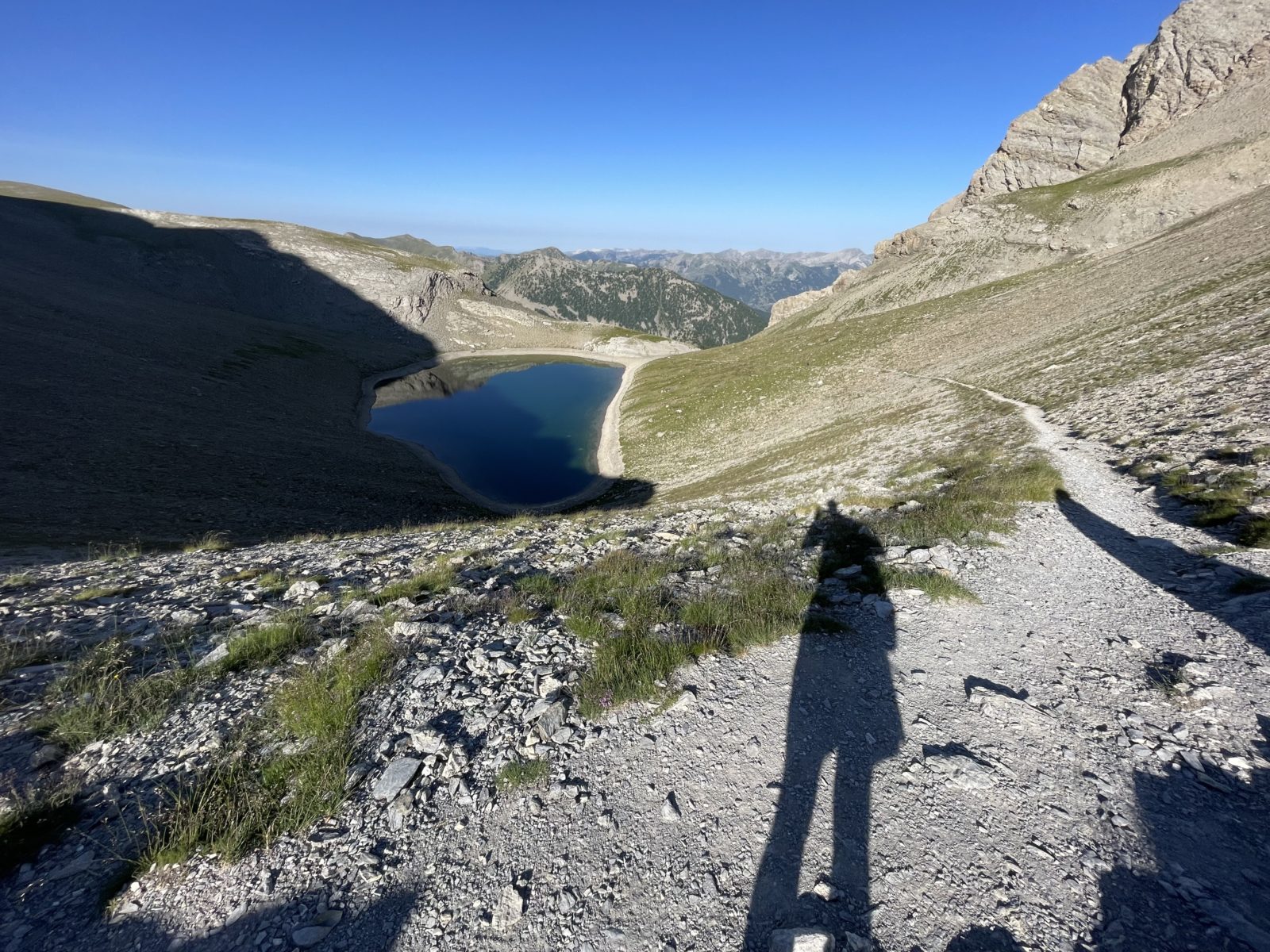 Popojdu 100 metrů na výhled zpět na jezero, u kterého jsem nocoval. Pak se vracím zpět k sedlu a zahajuju sestup do údolí. Je to moc hezká cestička. Celkem si to užívám.
