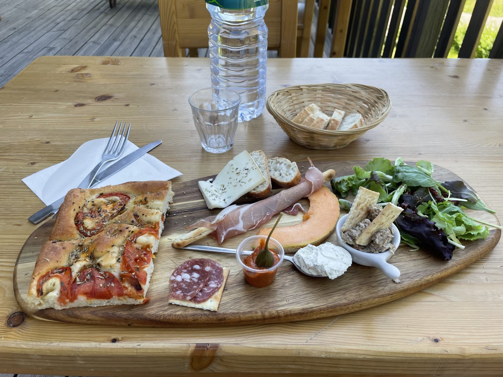 Sejdu skrz několik serpentýn až k restauraci. Vejdu dovnitř a ptám se na jídlo. Oběd bude až ve 12, ale můžu dostat nějaké studené jídlo. OK, lepší než nic. Na prkýnku mi donesou kousek buchtoidní pizzy a pečivo a sýr a salsu a pár dalších věcí. Celkem jsem si pochutnal.
