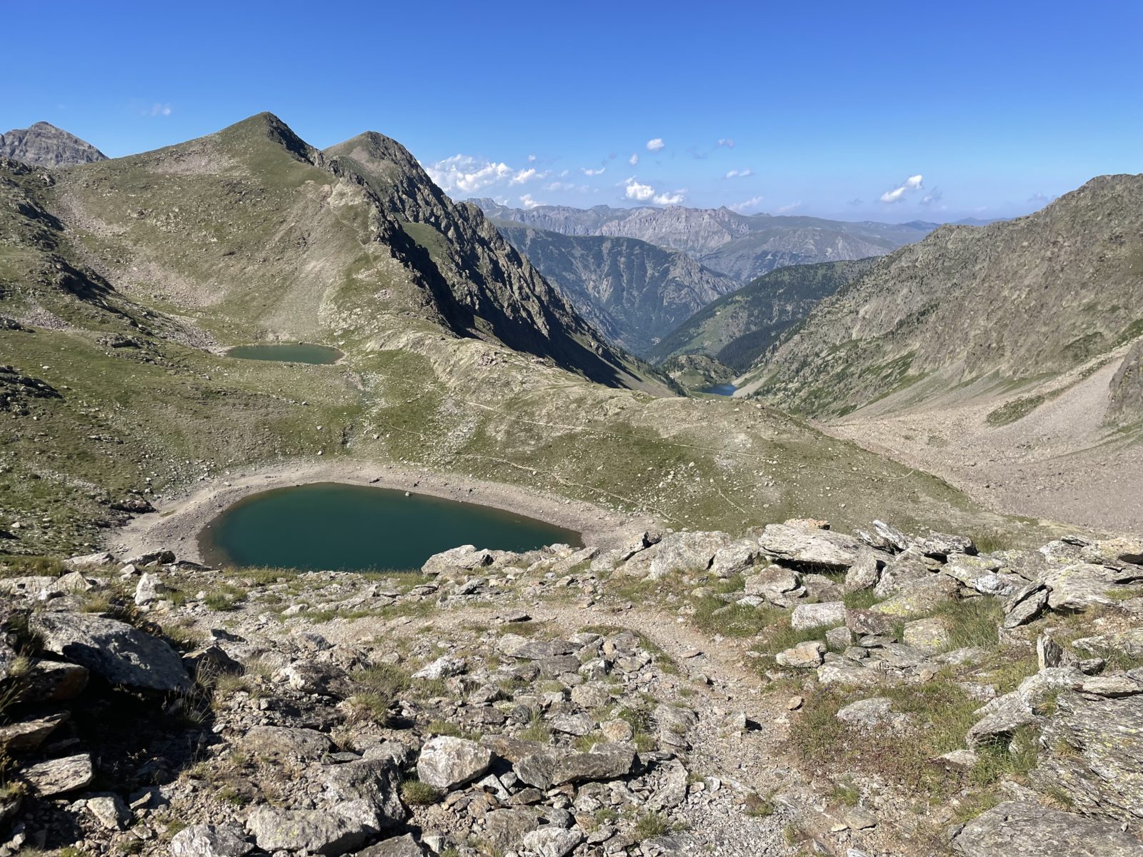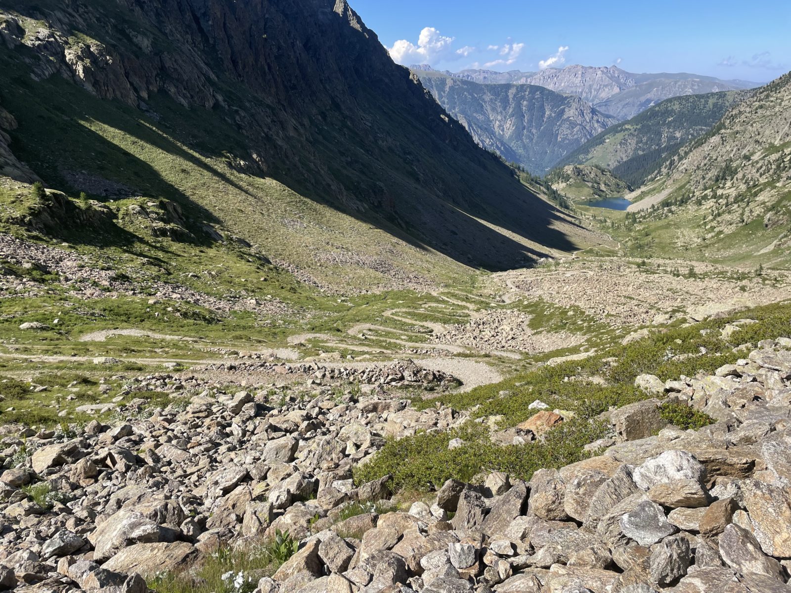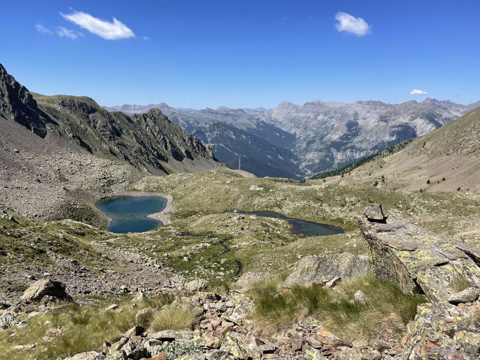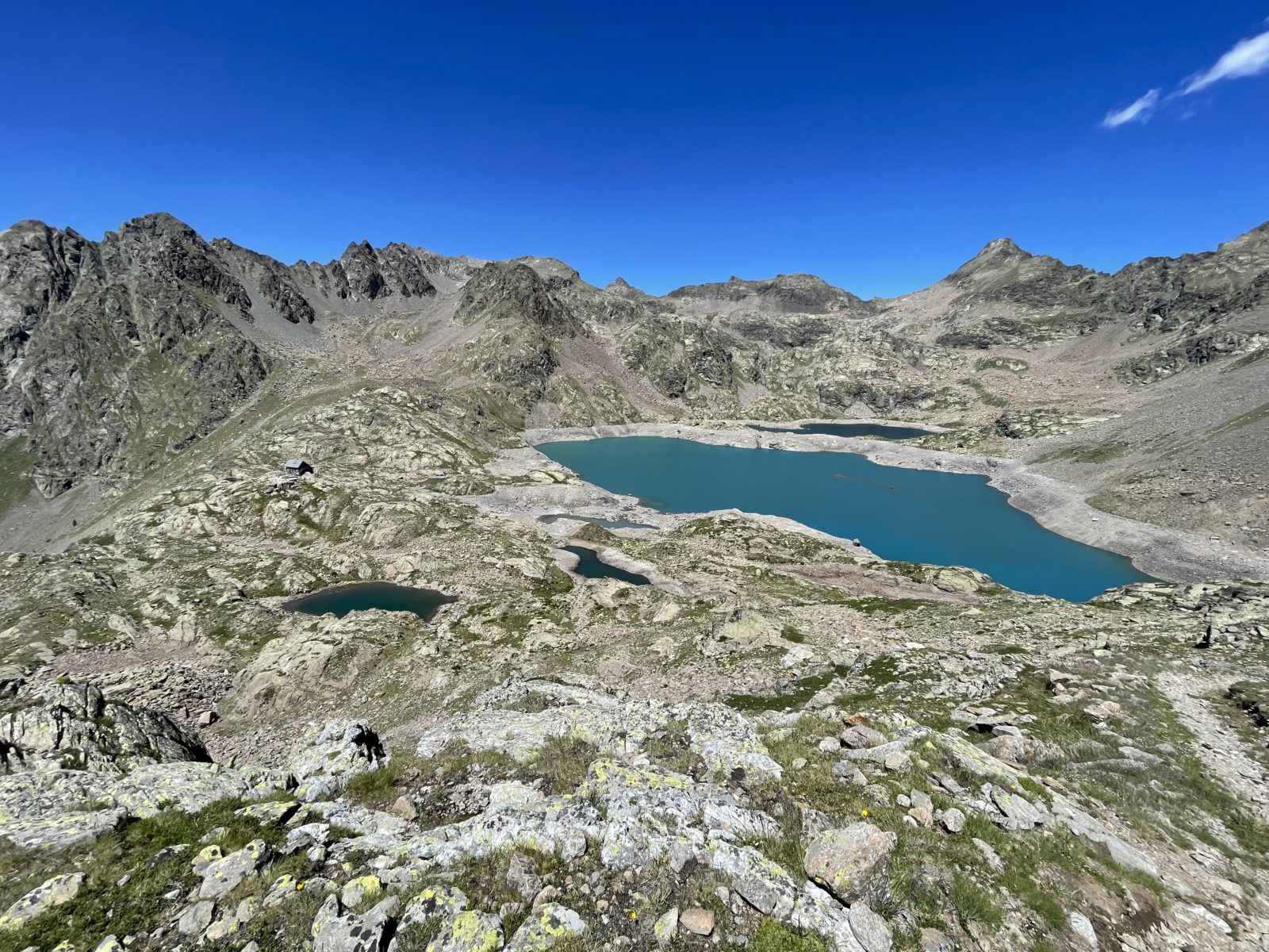 Cesta pokračuje v podobném duchu jako doteď. Chvíli jdu po hřebeni a pak začnu klesat. Je to náročné. Pak dojdu k jezeru. A pak dalšímu. A ještě dalšímu. A pak kolem většího jezera dojdu až na chatu Refuge de Rabuons (2523 m). Je 14 hodin. Kluci od včerejší večeře už sedí na lehátkách před chatou, šli nejkratší cestou. Prohodíme pár slov, svačím a pak asi ve 14:20 vyrážím. Je nejvyšší čas. Chci dojít do další chaty a ta je 16 km daleko. A nějakých skoro 600 výškových metrů. Světlo je dlouho, ale večeře se většinou podává v 7 a to nesmím zmeškat!