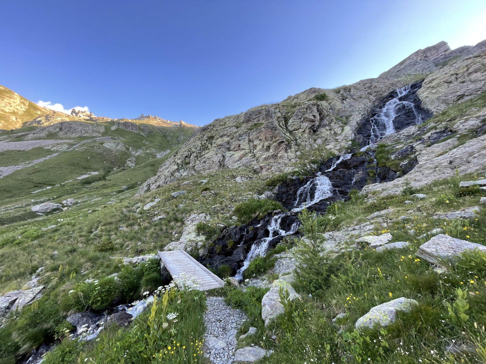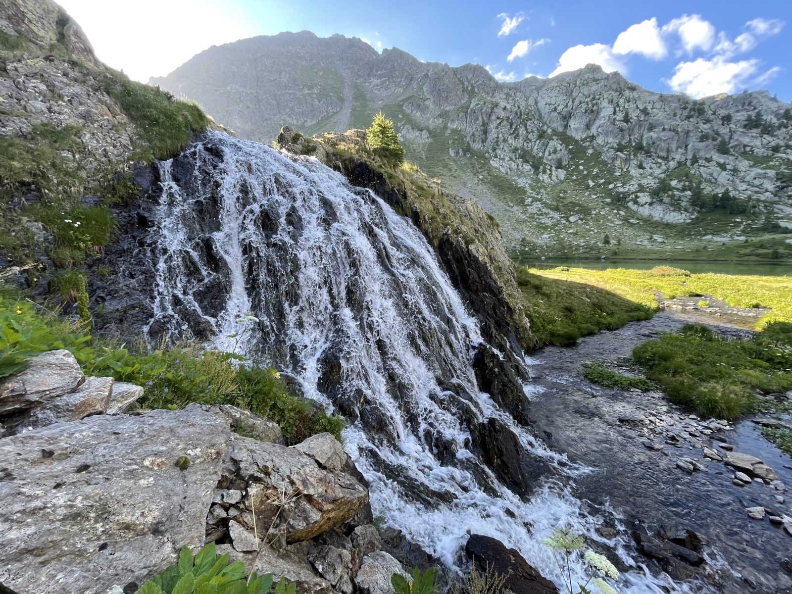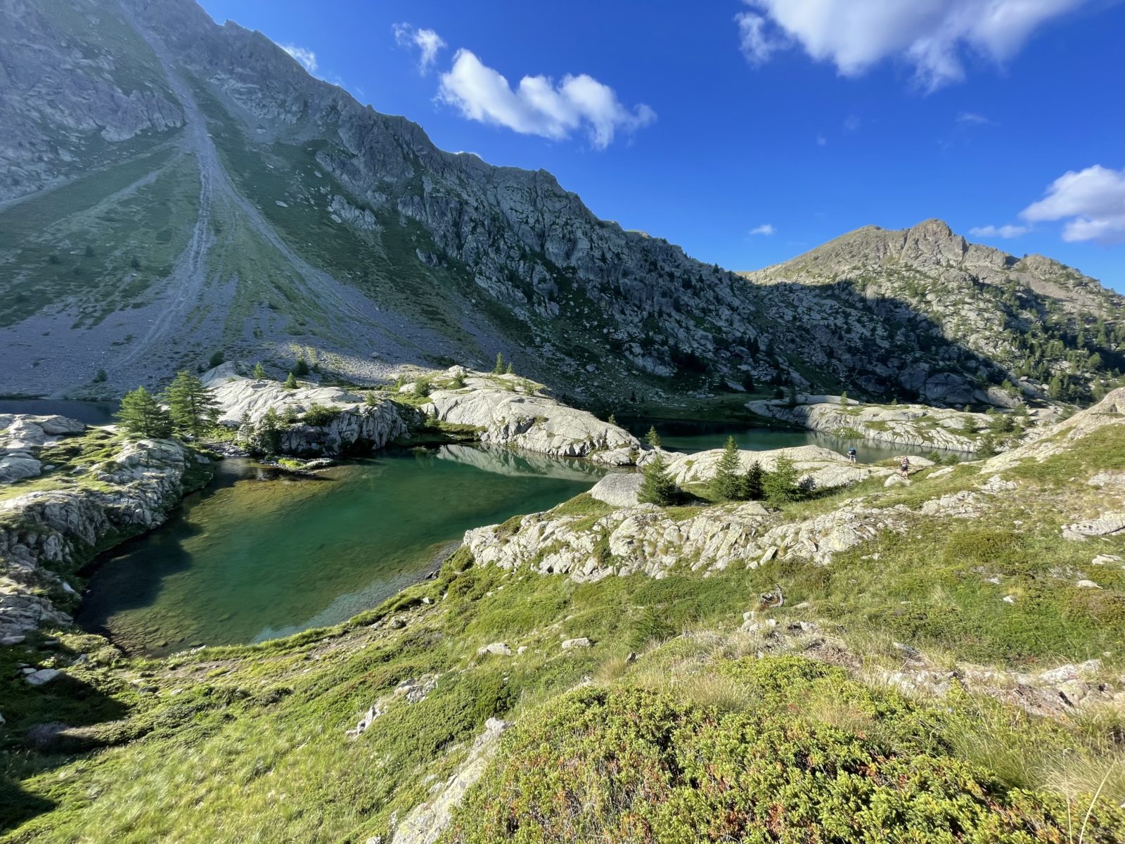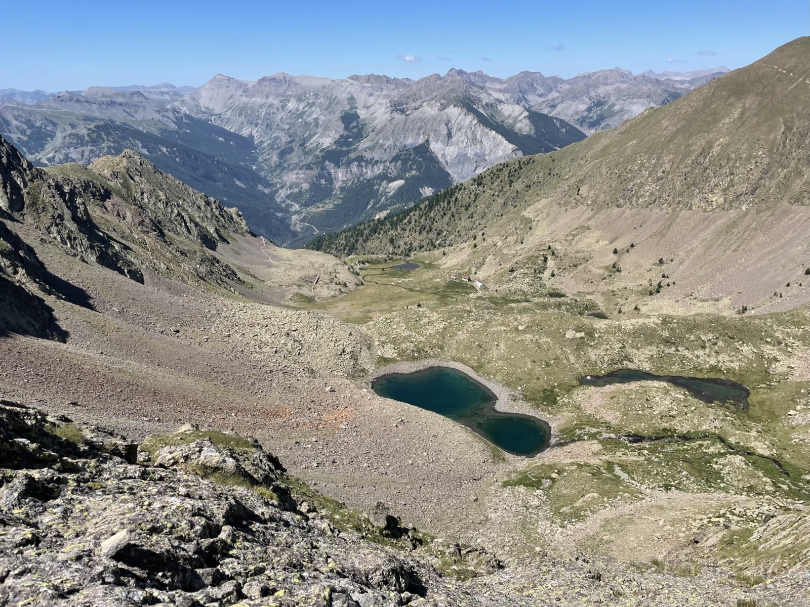 Cesta pokračuje v podobném duchu jako doteď. Chvíli jdu po hřebeni a pak začnu klesat. Je to náročné. Pak dojdu k jezeru. A pak dalšímu. A ještě dalšímu. A pak kolem většího jezera dojdu až na chatu Refuge de Rabuons (2523 m). Je 14 hodin. Kluci od včerejší večeře už sedí na lehátkách před chatou, šli nejkratší cestou. Prohodíme pár slov, svačím a pak asi ve 14:20 vyrážím. Je nejvyšší čas. Chci dojít do další chaty a ta je 16 km daleko. A nějakých skoro 600 výškových metrů. Světlo je dlouho, ale večeře se většinou podává v 7 a to nesmím zmeškat!