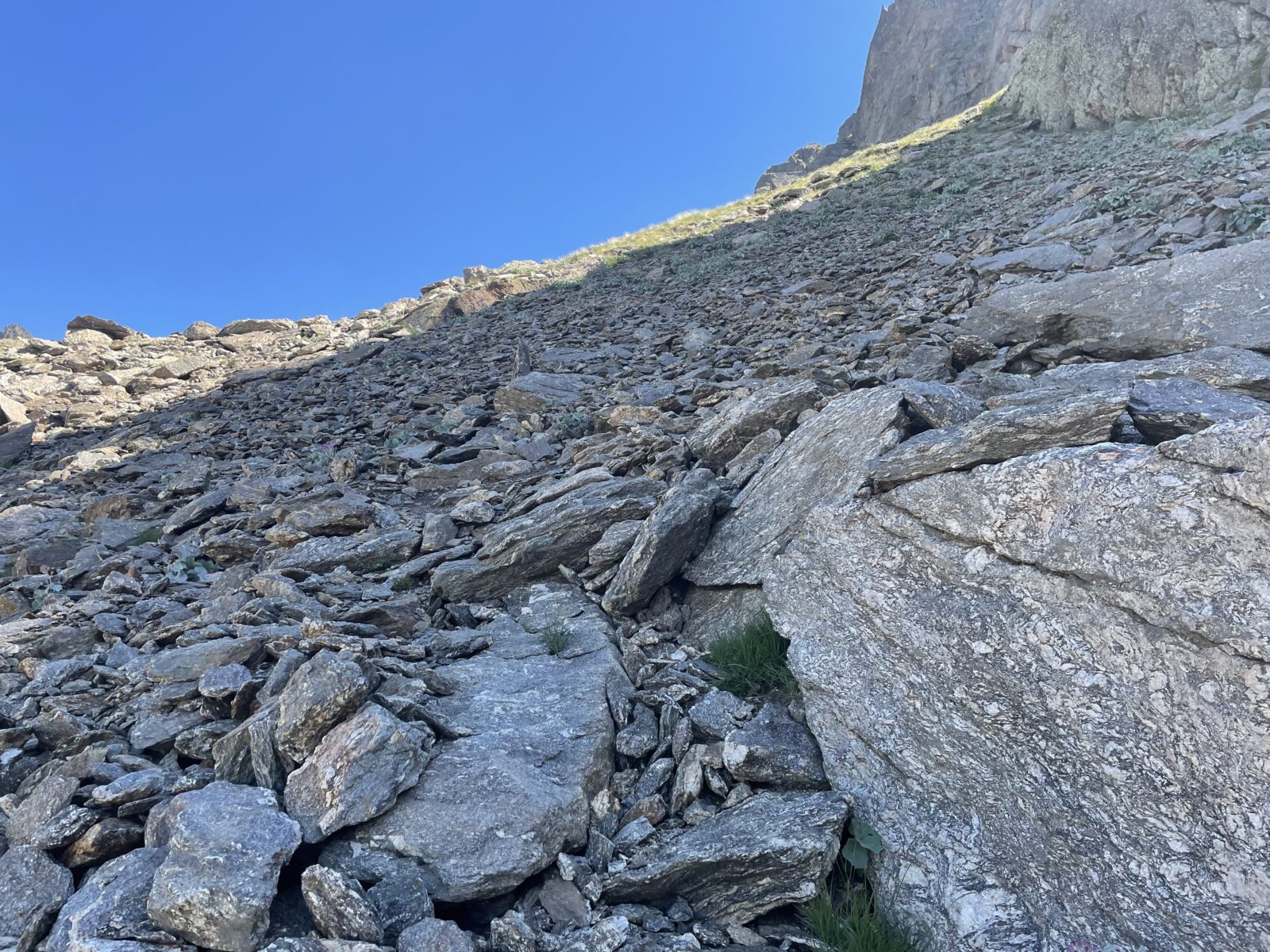 Prve potřebuju dojít k dalšímu jezírku o kus výš. Cesta se ztrácí a teď jdu po šutrech strmě nahoru, naštěstí jsou tu kamenní mužíci. Když dojdu k jezírku, tak přetraverzuju doprava na cestičku. Po té jdu prve kousek dolů, ale pak odbočím nahoru doleva. Teď začne hlavní stoupání asi 500 m. První úsek je ještě celkem OK, jsou to strmé serpentýny a stezka je zřetelná. Ale postupně už jsou to pak jen šutry a je to čím dál náročnější. Předcházím skupinku ve středních letech. Jsou celkem rychlí, ale dělají pauzy.