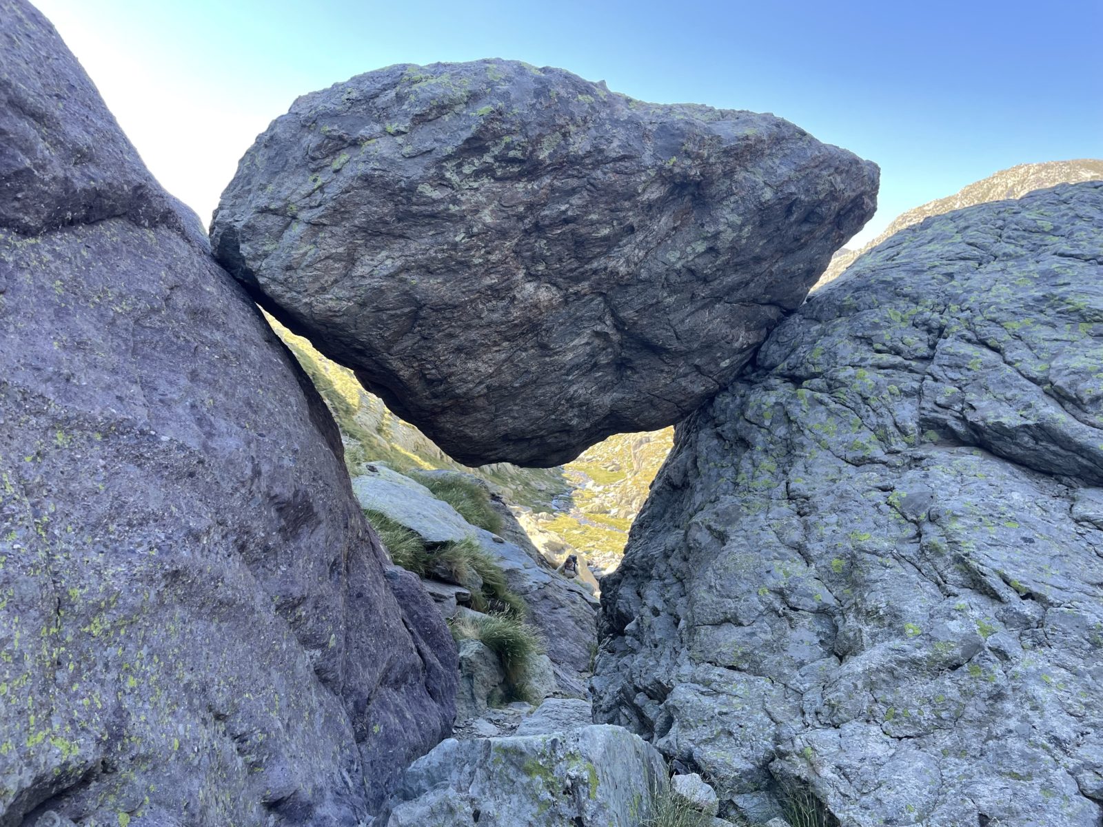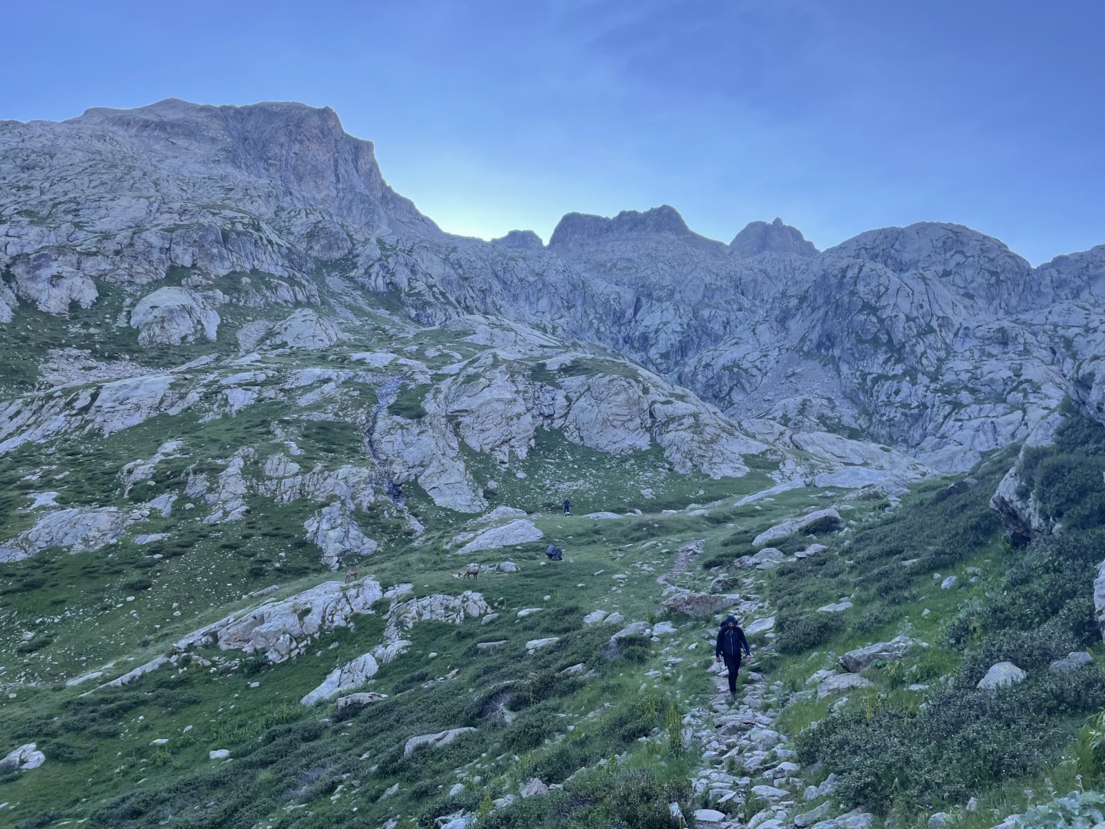 Vyrážím v 7:12. Začínám stoupat do prvního sedla. Začátek je hezký. Je to můj oblíbený typ alpského terénu – relativně oblé kameny a mezi tím tráva. Po cestě potkávám celkem dost stanů.
