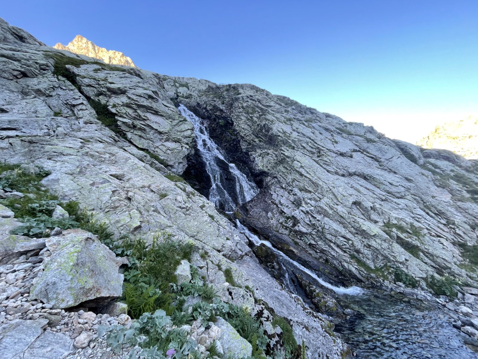 V 9:54 dojdu k chatě Refuge des Merveilles (asi 2130 m). U chaty nevidím vůbec žádné lidi, ale je otevřeno a taky už jsem potkal pár lidí jít proti mně, ti nejspíš spali v této chatě. Sedám si na pohodlnou sedačku vedle chaty a svačím. Moje vyhlídky zatím nejsou nic moc. Terén byl přes toto první sedlo dost náročný a průměrnou rychlost mám sotva 3 km/h.