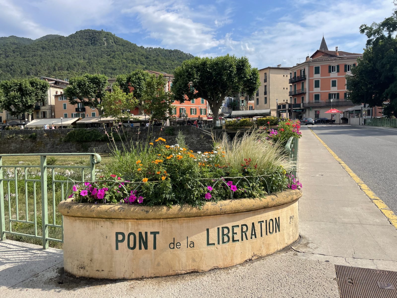 Pak se dostanu na silnici a pak už je to jen pár minut a v 16:43 jsem u řeky v Sospelu (asi 350 m). Díky zkratce to sem bylo jen 38 km. Je pěknej hic. Teď se potřebuju hlavně najíst a napít. Jdu do supermarketu. Jsem fakt celkem dehydrovanej, od rána jsem vypil jen kolem 2 l tekutin. Kupuju pivo, colu, vodu a nějaké dobré jídlo – salát a taky dezert a další věci. Sednu si na lavičku u řeky a pustím se do konzumace.