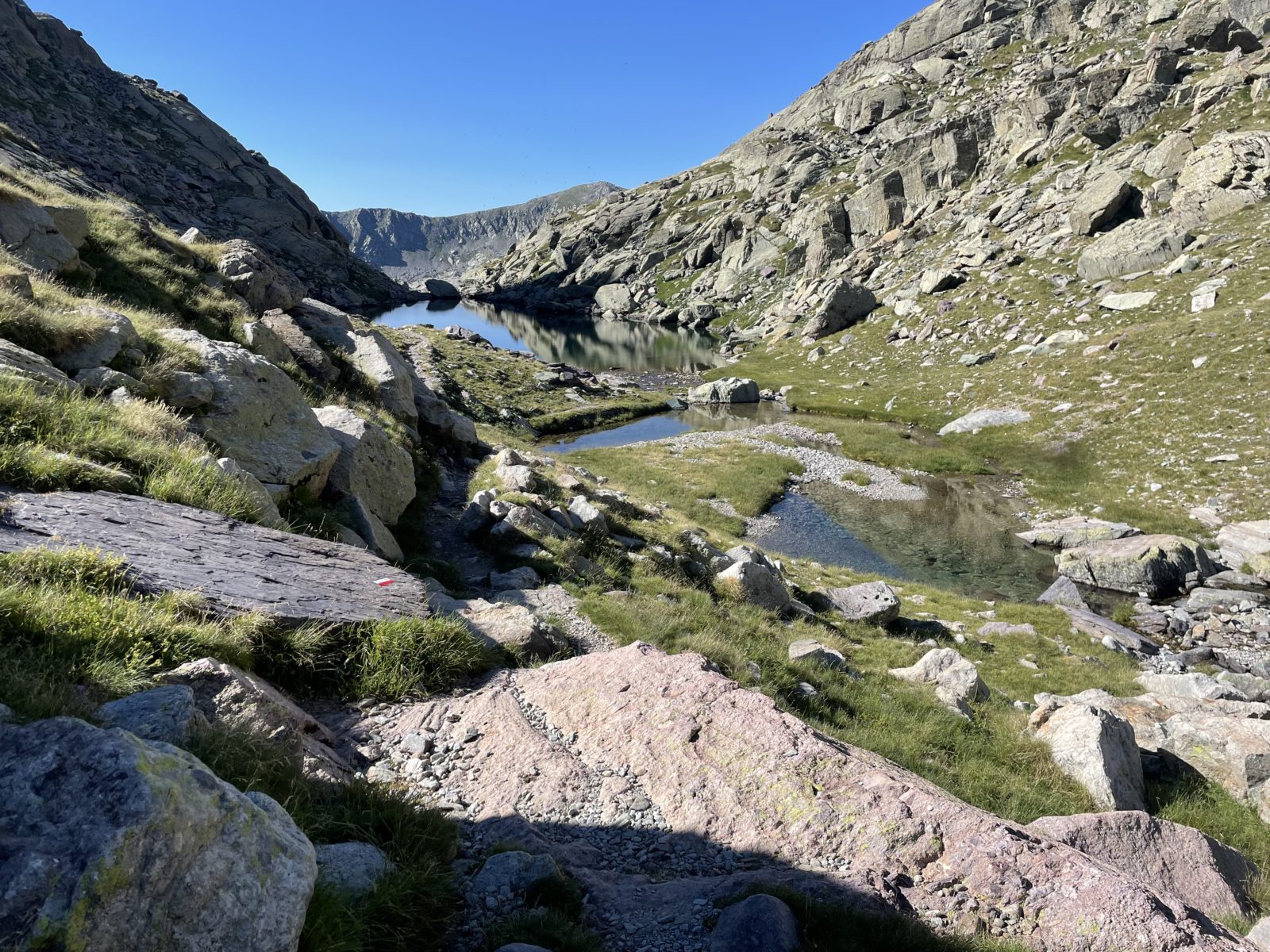 V sedle Baisse de Valmasque (2549 m) jsem v 9:02. Vstupuju jsem do oblasti, kde je speciální ochrana, nesmí se tu stanovat. Byly tu nalezené pozůstatky nějaké dávné civilizace. Sestupuju dolů. Je to tu moc hezké.