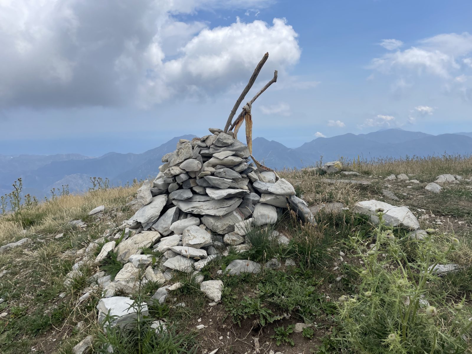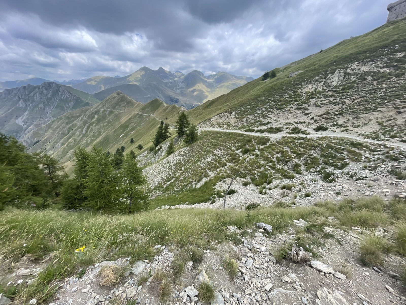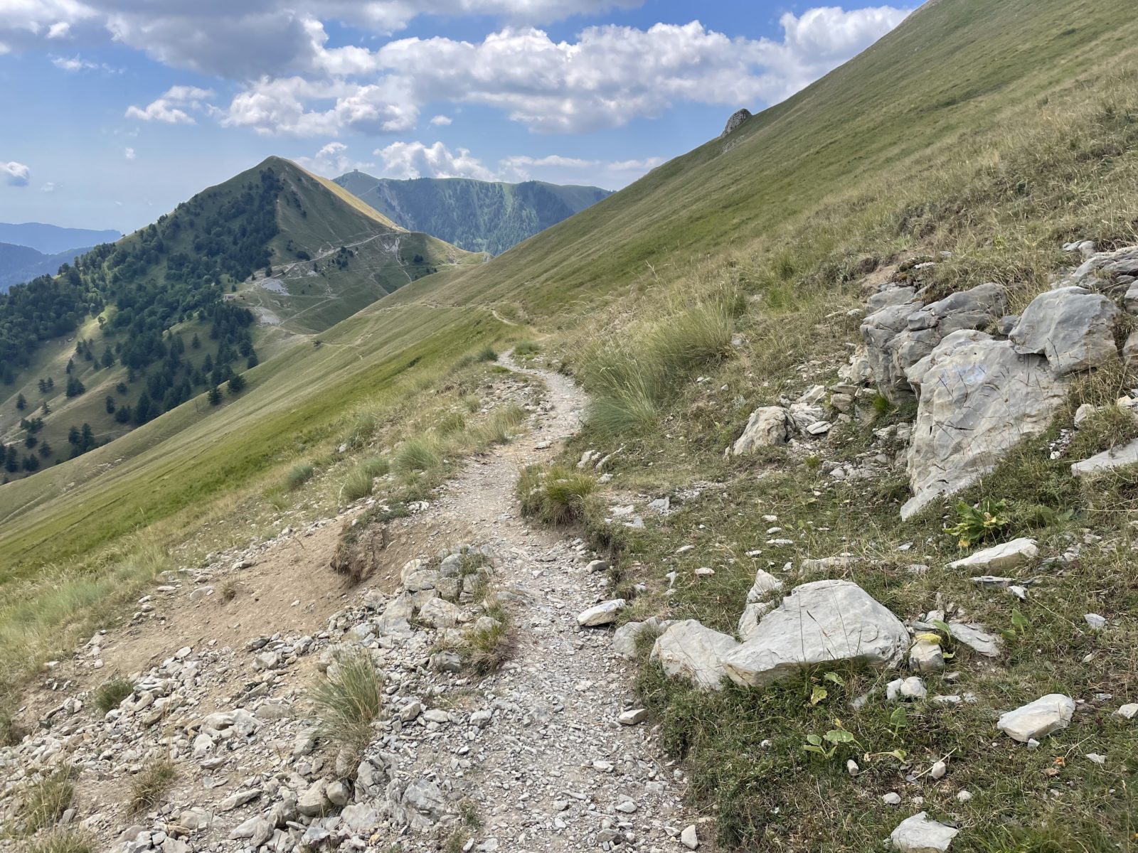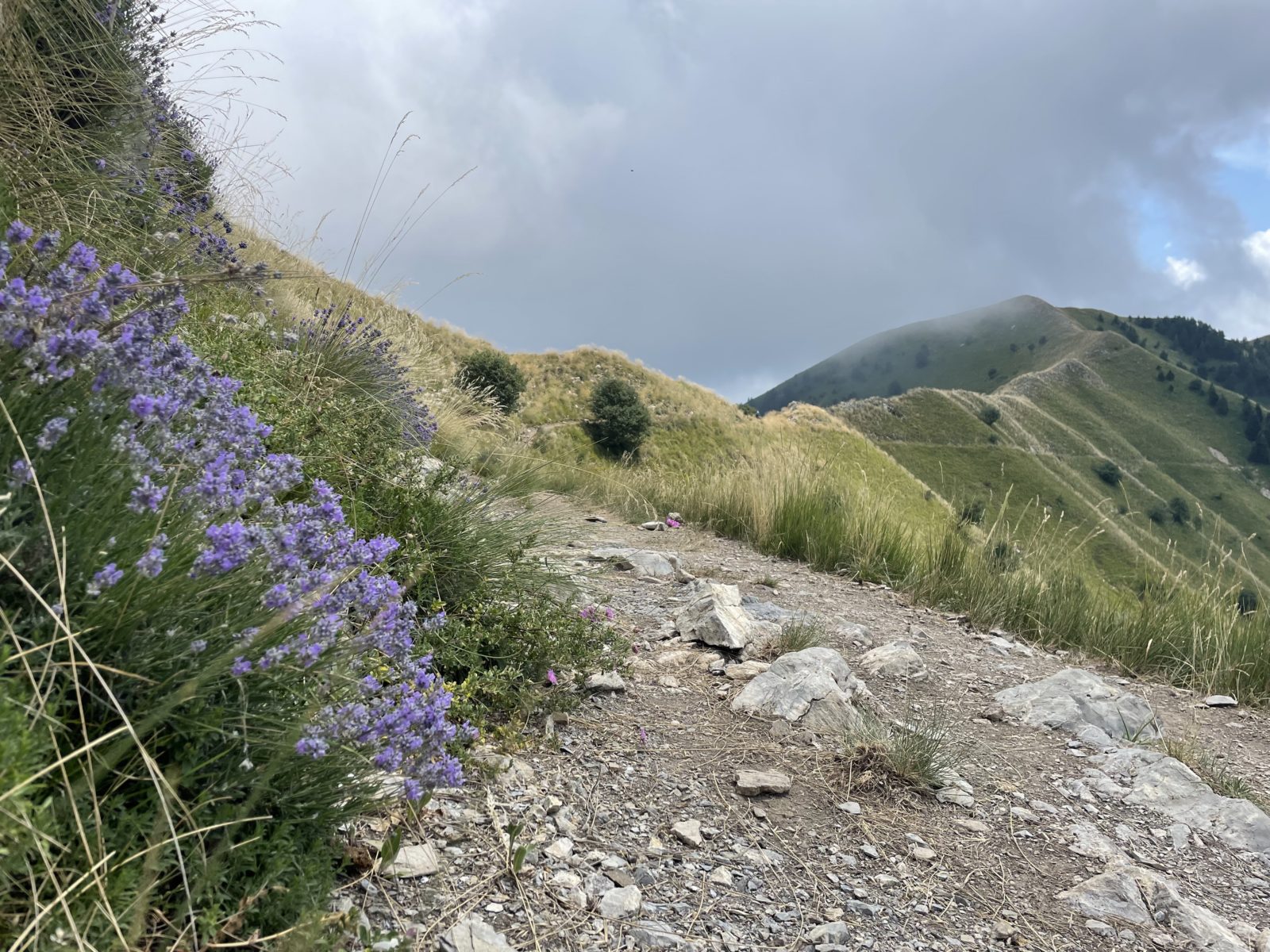 Pak pokračuju dál. Někdy po půl druhé se napojuju na hlavní stezku. Je tu hezká cestička. Kopíruju hřeben, ale nejdu přímo po něm. Cesta je prve zařezaná z jedné strany svahu a pak z druhé. Pořád jsem ve výšce okolo 1800 m. Kdy už začne hlavní klesání? Ještě výstup na poslední vrcholek na hřebeni – Mangiabo (1821 m) – a sestup může začít.