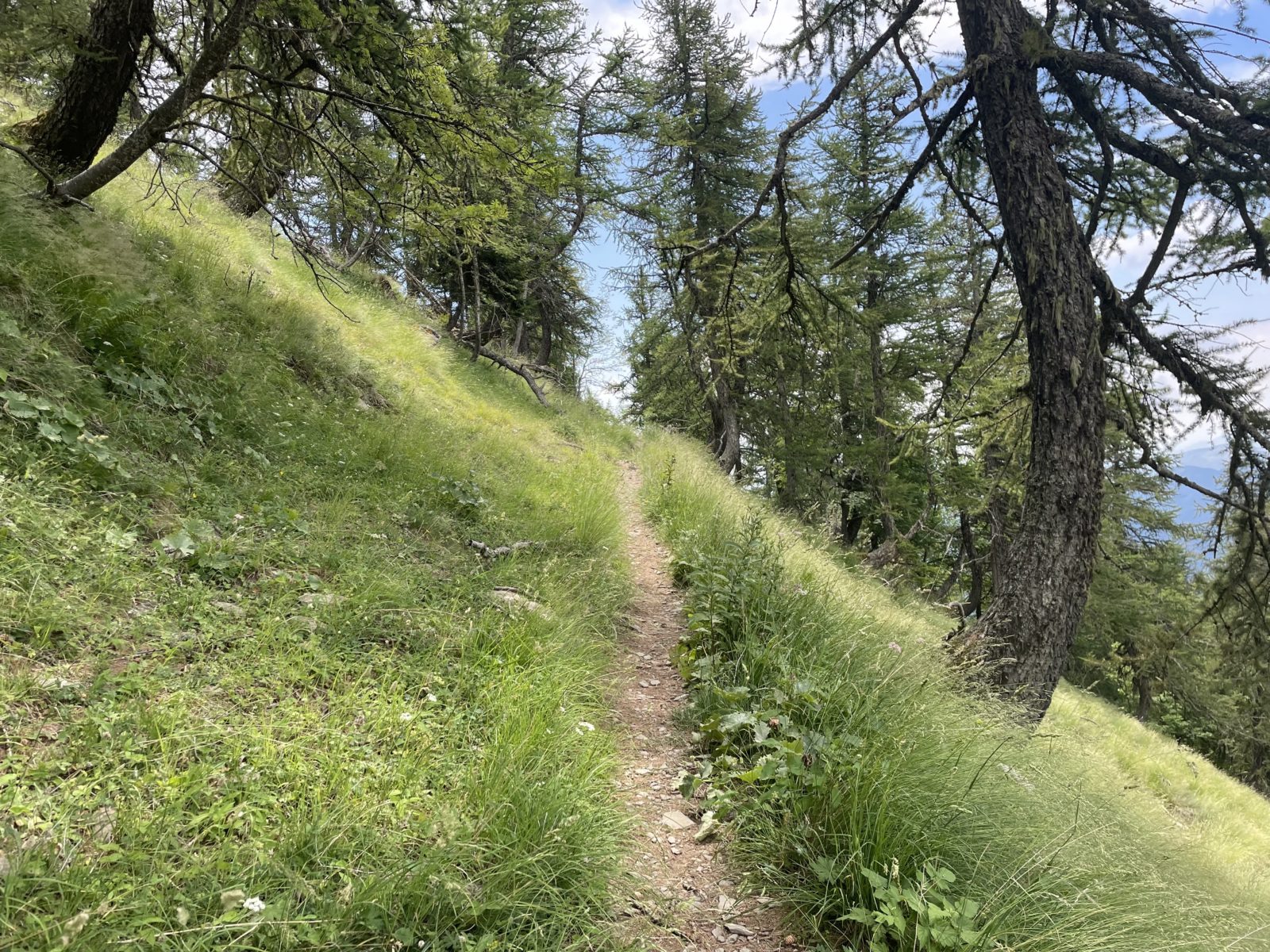 Je to dálnice! Rychlost stoupá! Potkávám docela dost lidí. Terén je mírně zvlněný, ale převažuje klesání. Ve 12:28 dojdu do místa zvaného Pointe des Trois Communes (2078 m) tady cesta zatáčí doprava na západ a vede až k chatě. Cesta pak pokračuje zase zpět na východ kousek jižněji. Zkoumám mapu a nacházím zkratku – vůbec tam nepotřebuju chodit a ušetřím takové 4 km. Akorát teda vody moc nemám, ale to zvládnu.