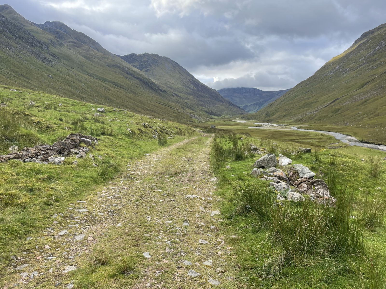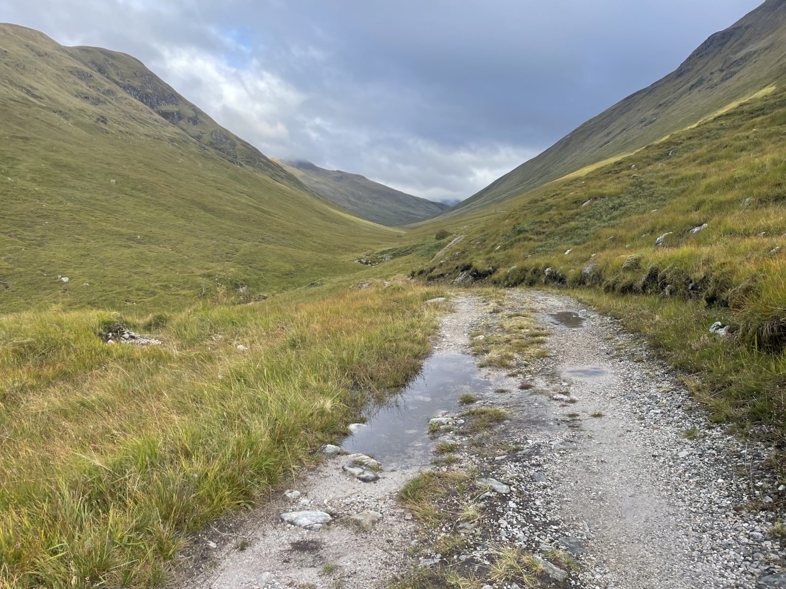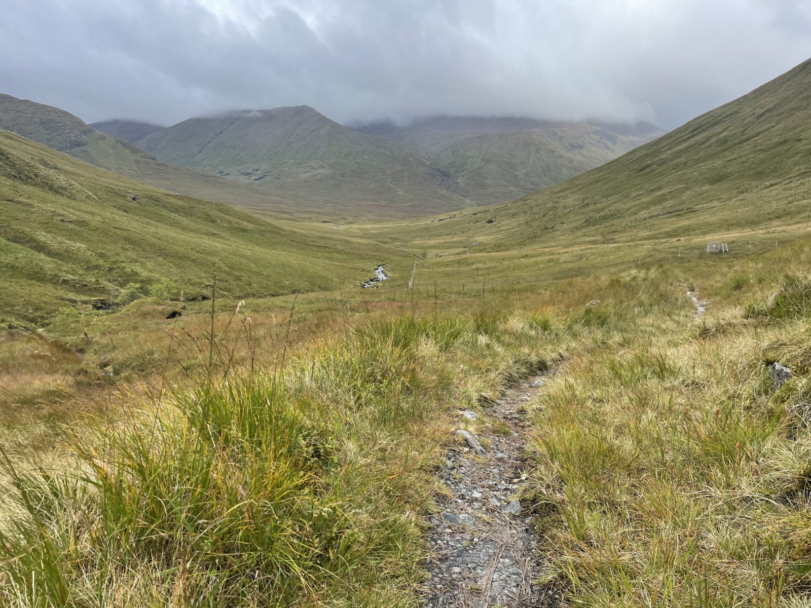 Znovu vyrážím ve 13:25. Prve jsem zamýšlel, že bych zkusil dnes dojít až do jedné bothy. Jenže to by bylo celkem tak 33 km a to už dnes není reálné. Takže místo odbočky doprava, kterou bych vynechal Morvich, se rozhoduju pokračovat rovně údolím až do Morvichu. Třeba se mi poštěstí sehnat hostel (nepoštěstí).