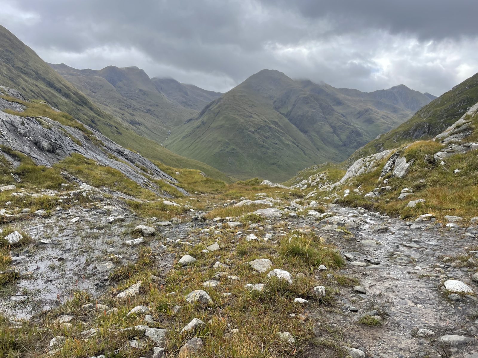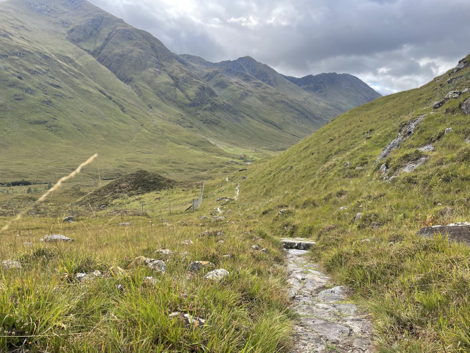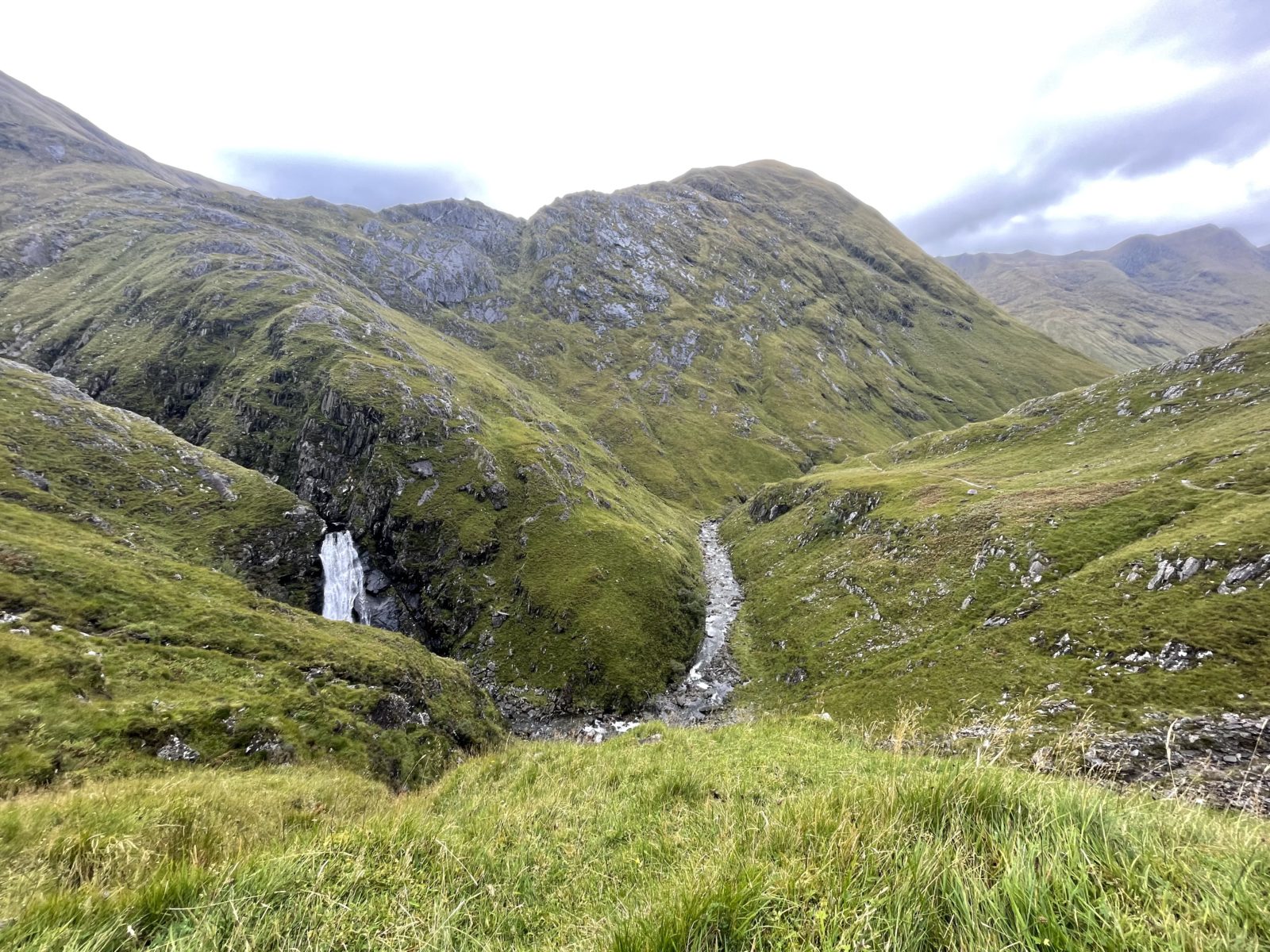 Znovu vyrážím ve 13:25. Prve jsem zamýšlel, že bych zkusil dnes dojít až do jedné bothy. Jenže to by bylo celkem tak 33 km a to už dnes není reálné. Takže místo odbočky doprava, kterou bych vynechal Morvich, se rozhoduju pokračovat rovně údolím až do Morvichu. Třeba se mi poštěstí sehnat hostel (nepoštěstí).