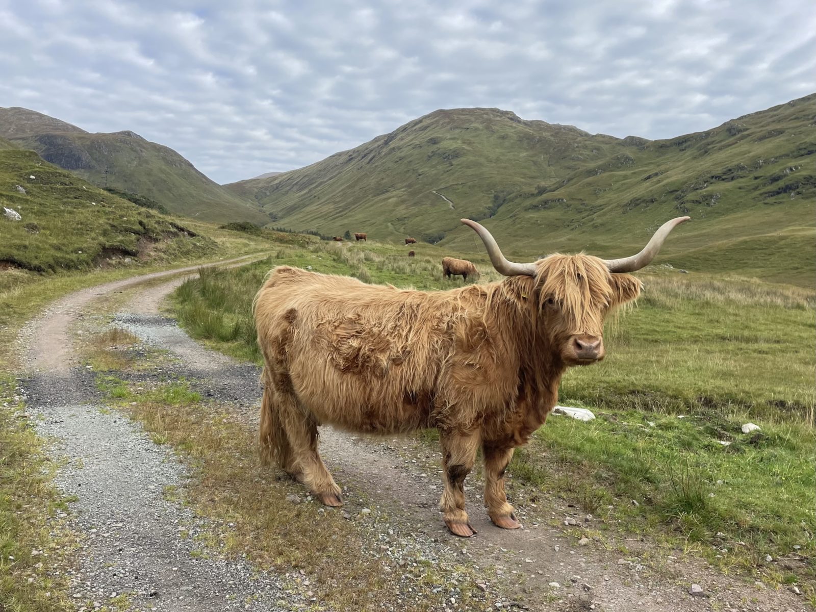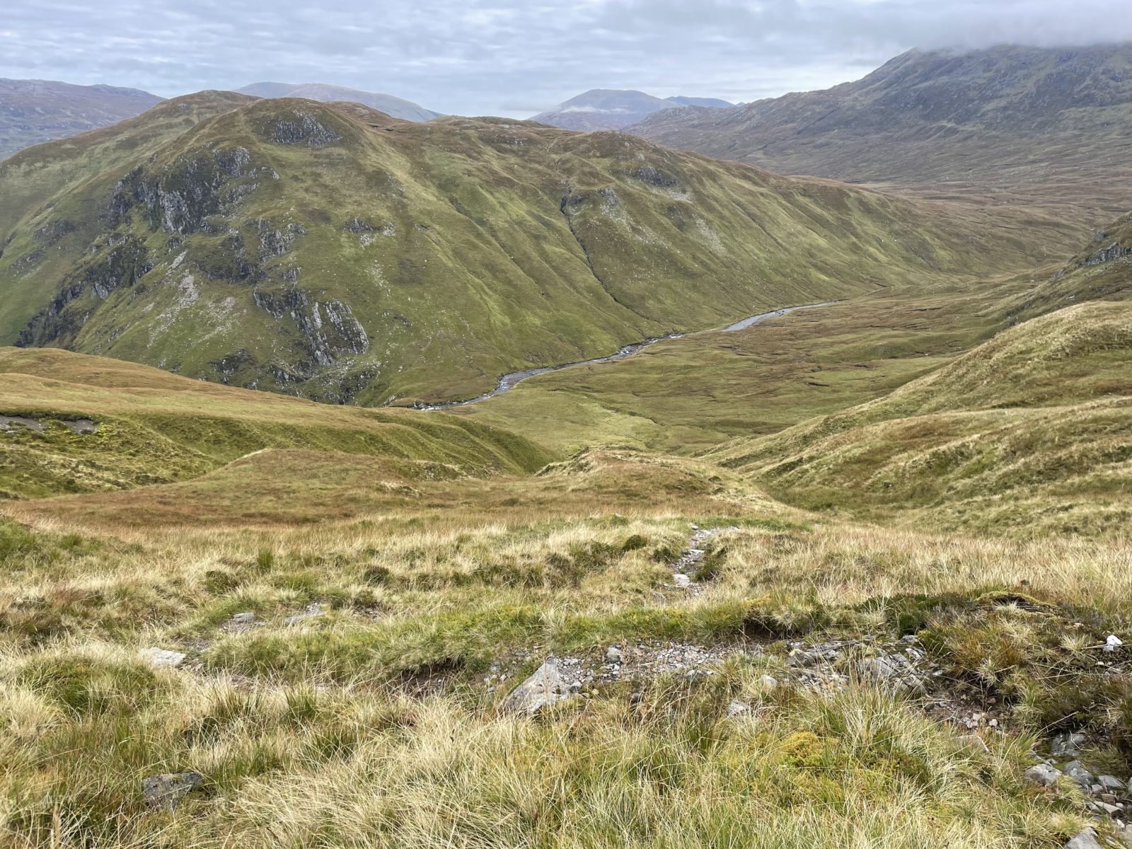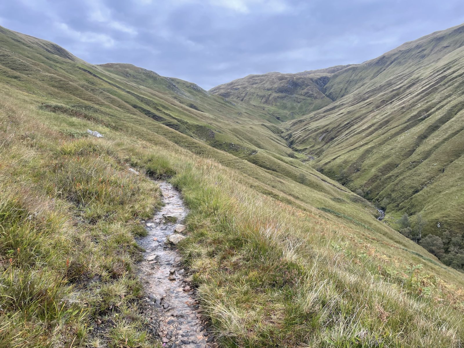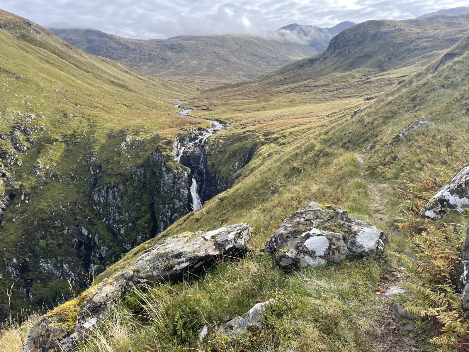 Naštěstí když dojdu na nejvyšší místo zhruba v půlce, tak dál už pokračuje cesta, která je čím dál lepší. No a pak se dostanu na stěrkovou cestu a mám vyhráno. Teď je to tak 6 km až dolů do dalšího údolí, kde je bothy. Už se mi moc nechce, ale to už dojdu.