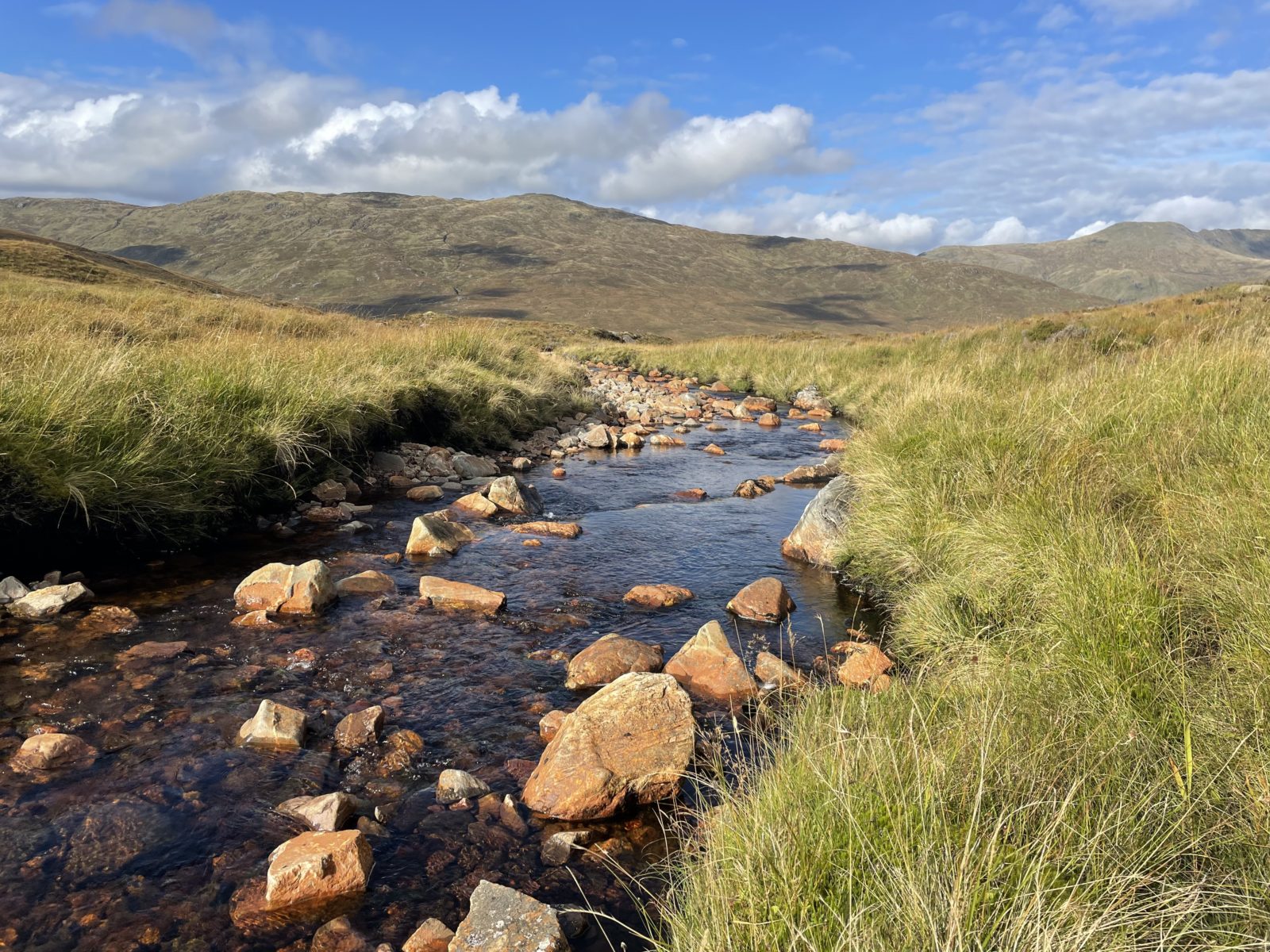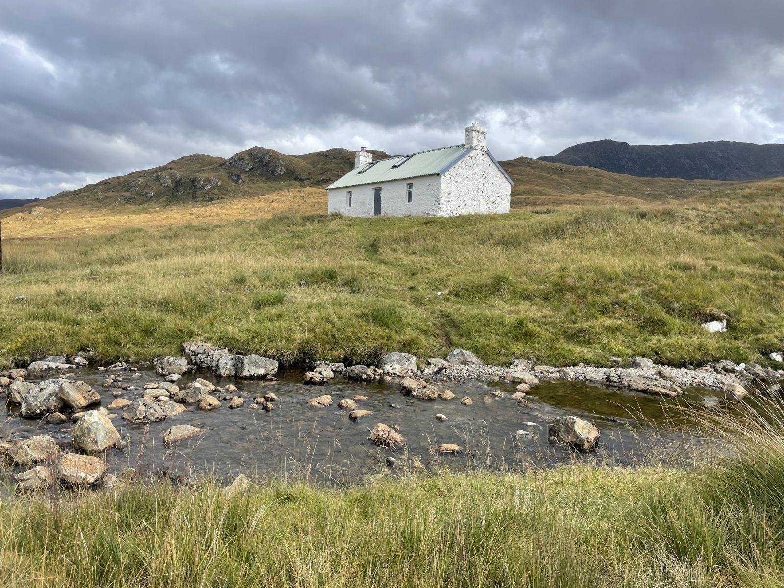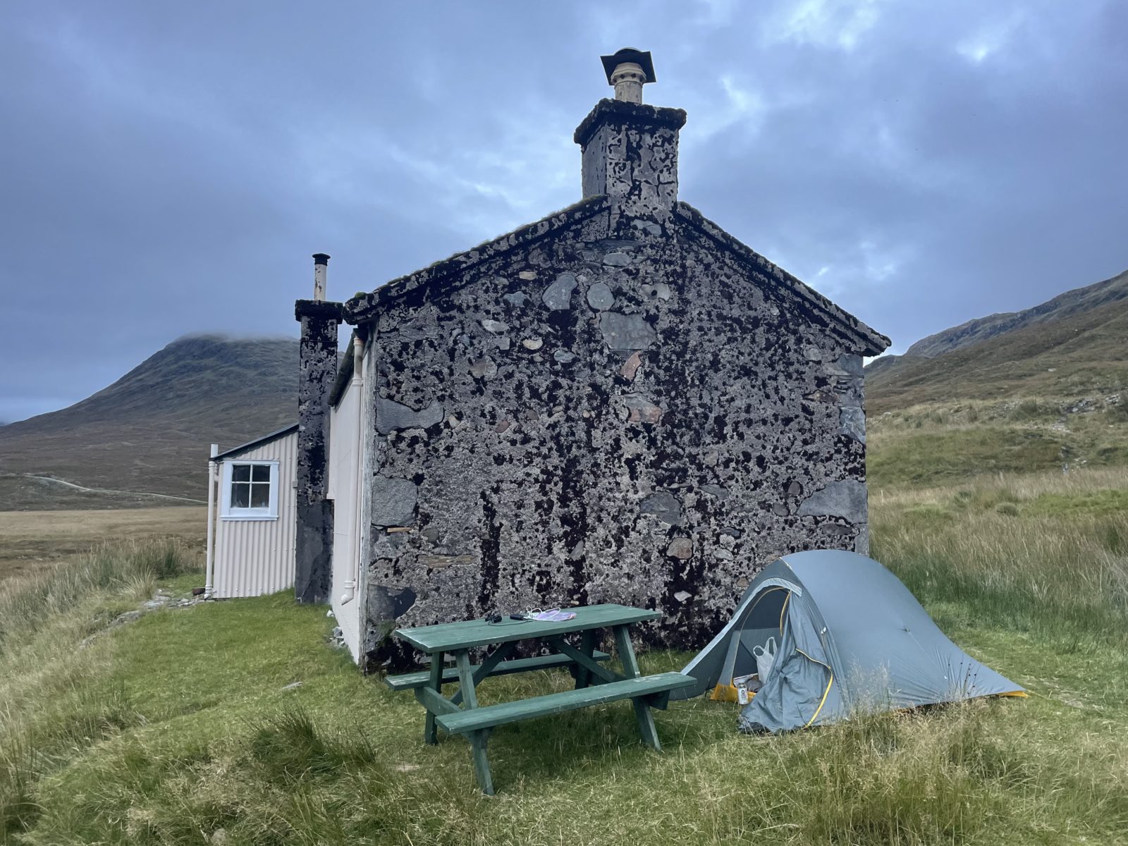 V 15:35 jsem dole. Přejdu potok a jsem u Maol Bhuide Bothy. Chata je hezká a venku je krásně. Dávám pauzu a suším stan.