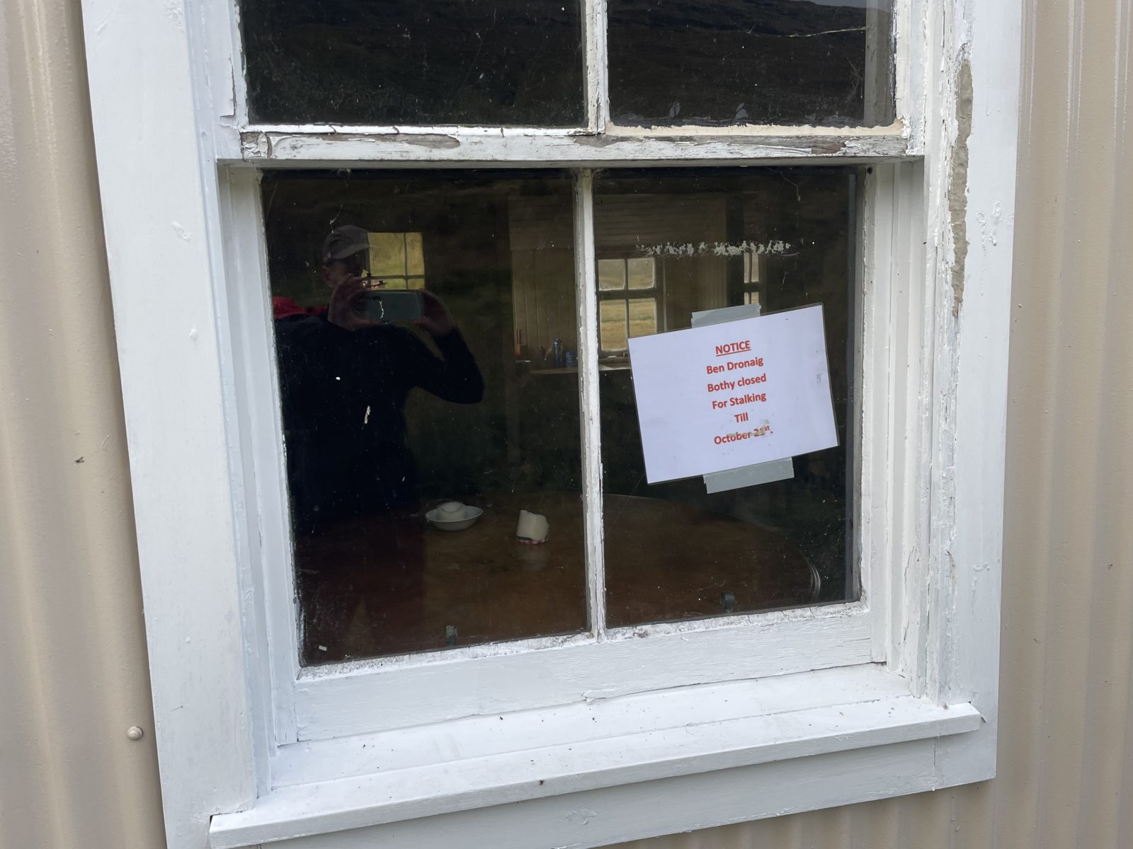 Dojdu ke dveřím. Na okně je cedule, že chata je zavřená do 24. října kvůli honitbě. Zamčeno. Nééé!!!