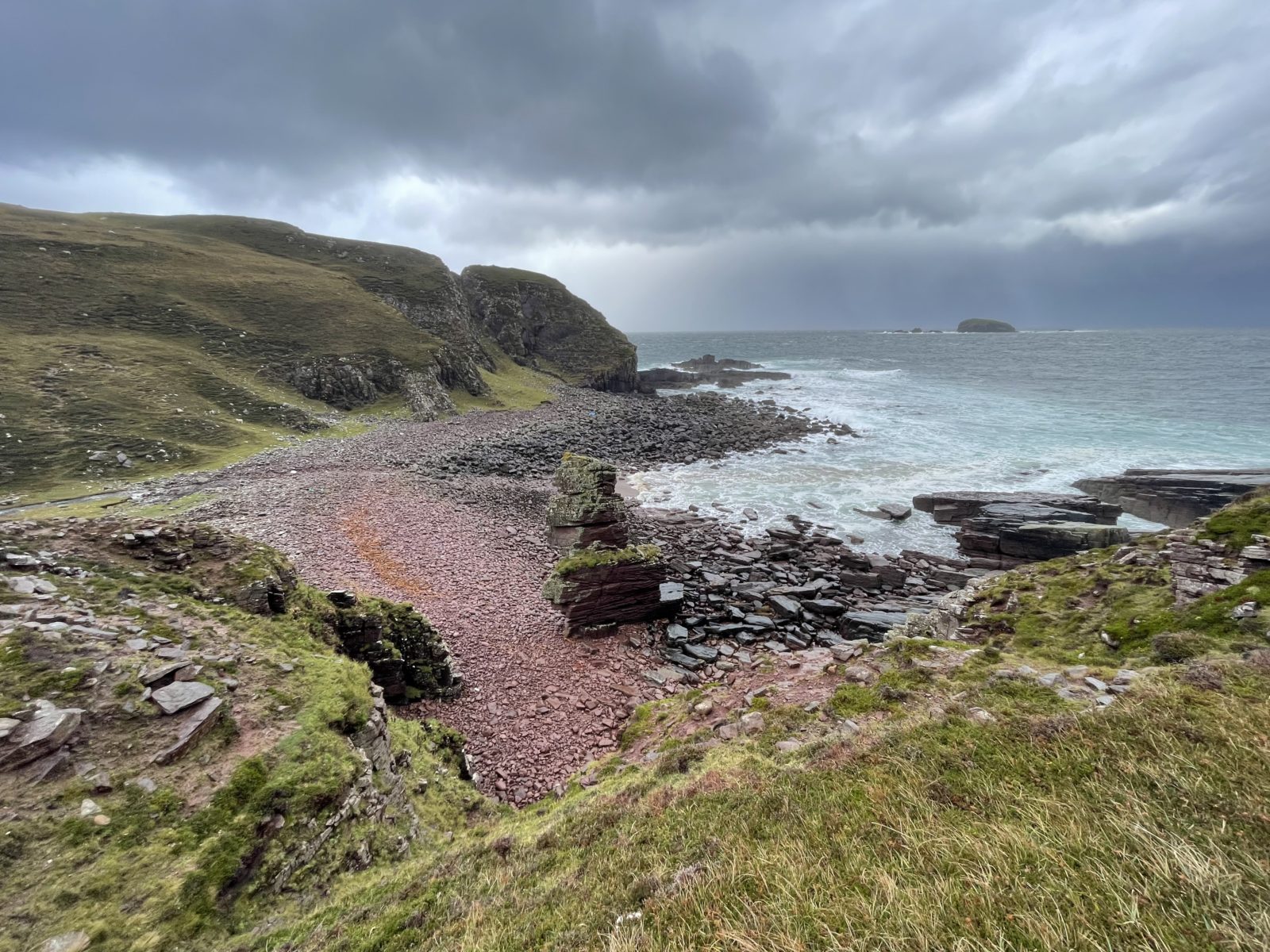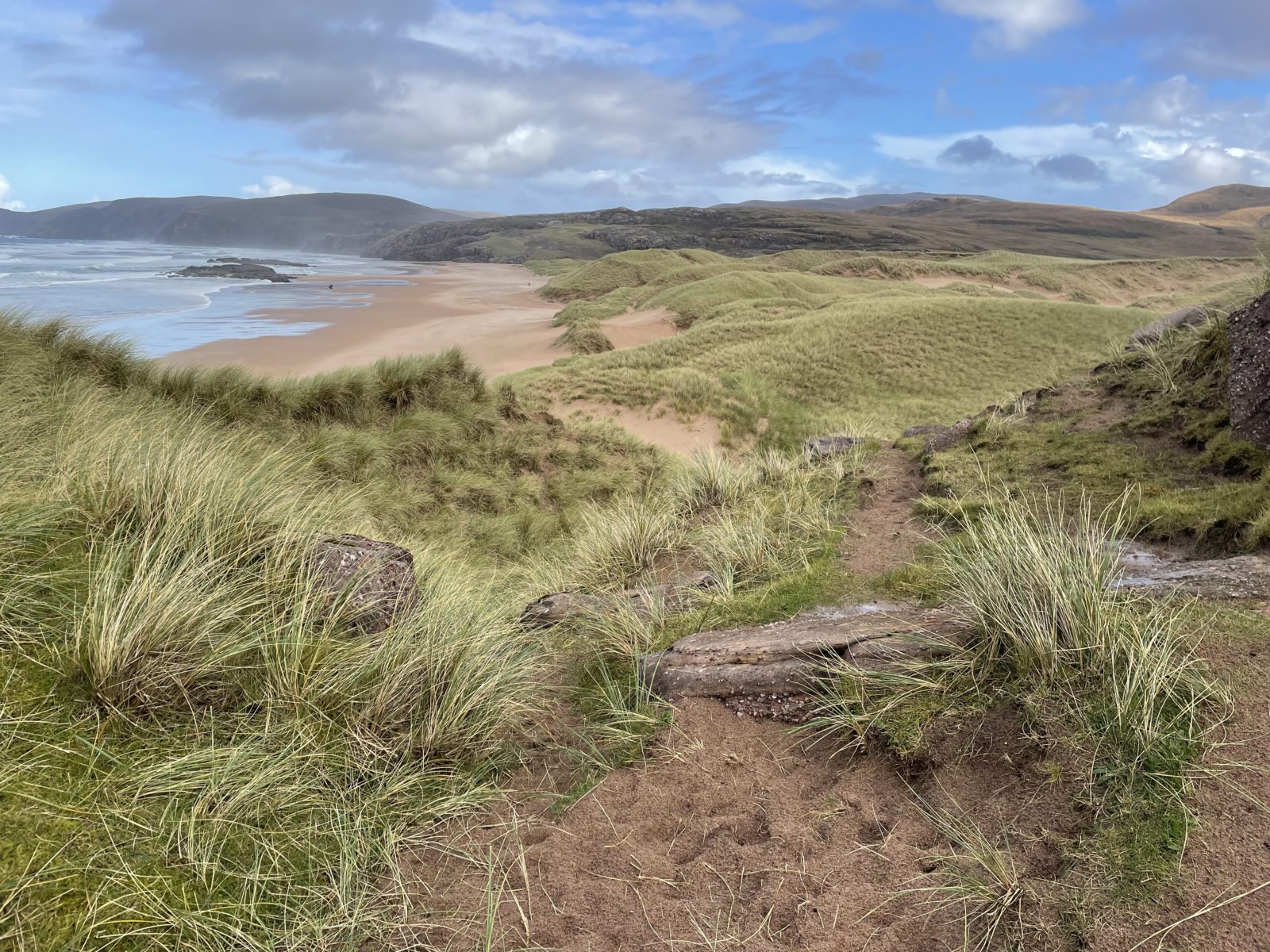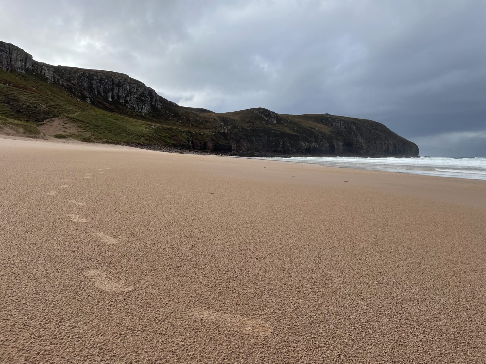 Když je asi 13 hodin, tak se počasí najednou umoudří. Svítí slunko a skoro nefouká. Tak toho musím využít a dávám pauzu. Už mám na dohled pláž. A taky v dálce vidím maják na Cape Wrath.