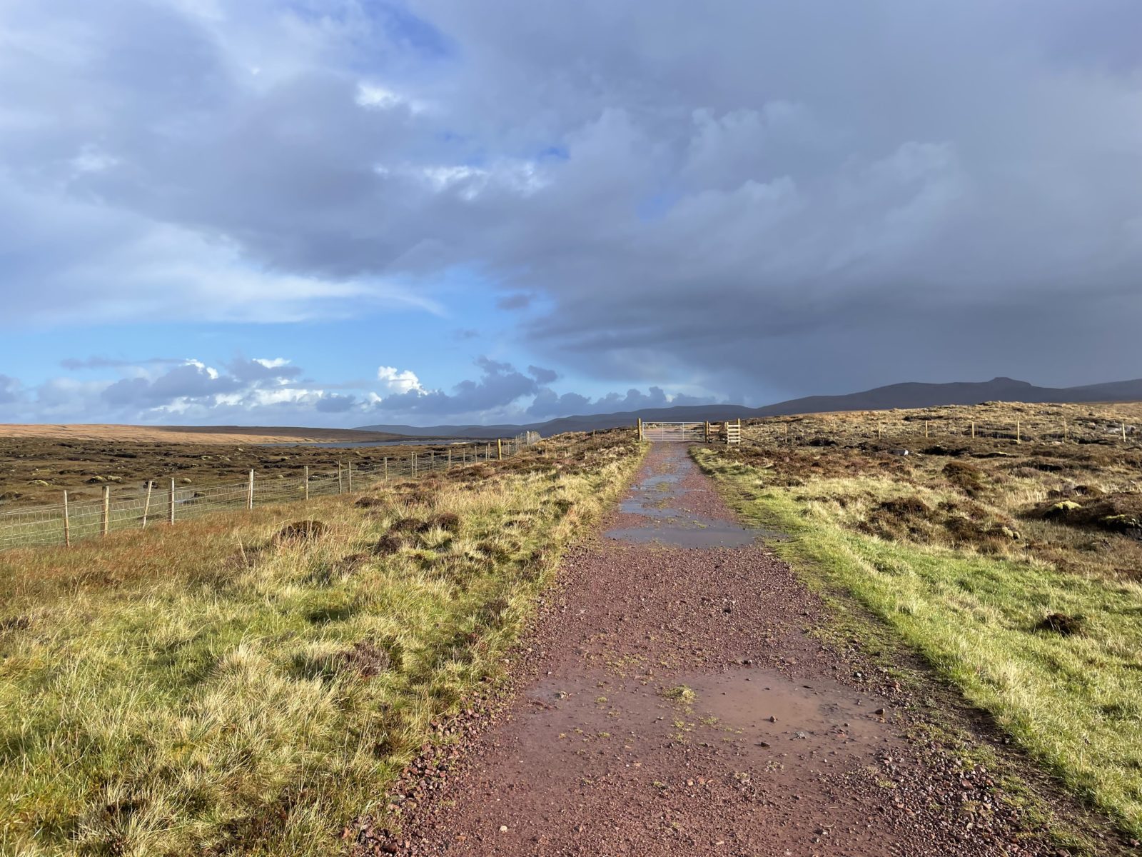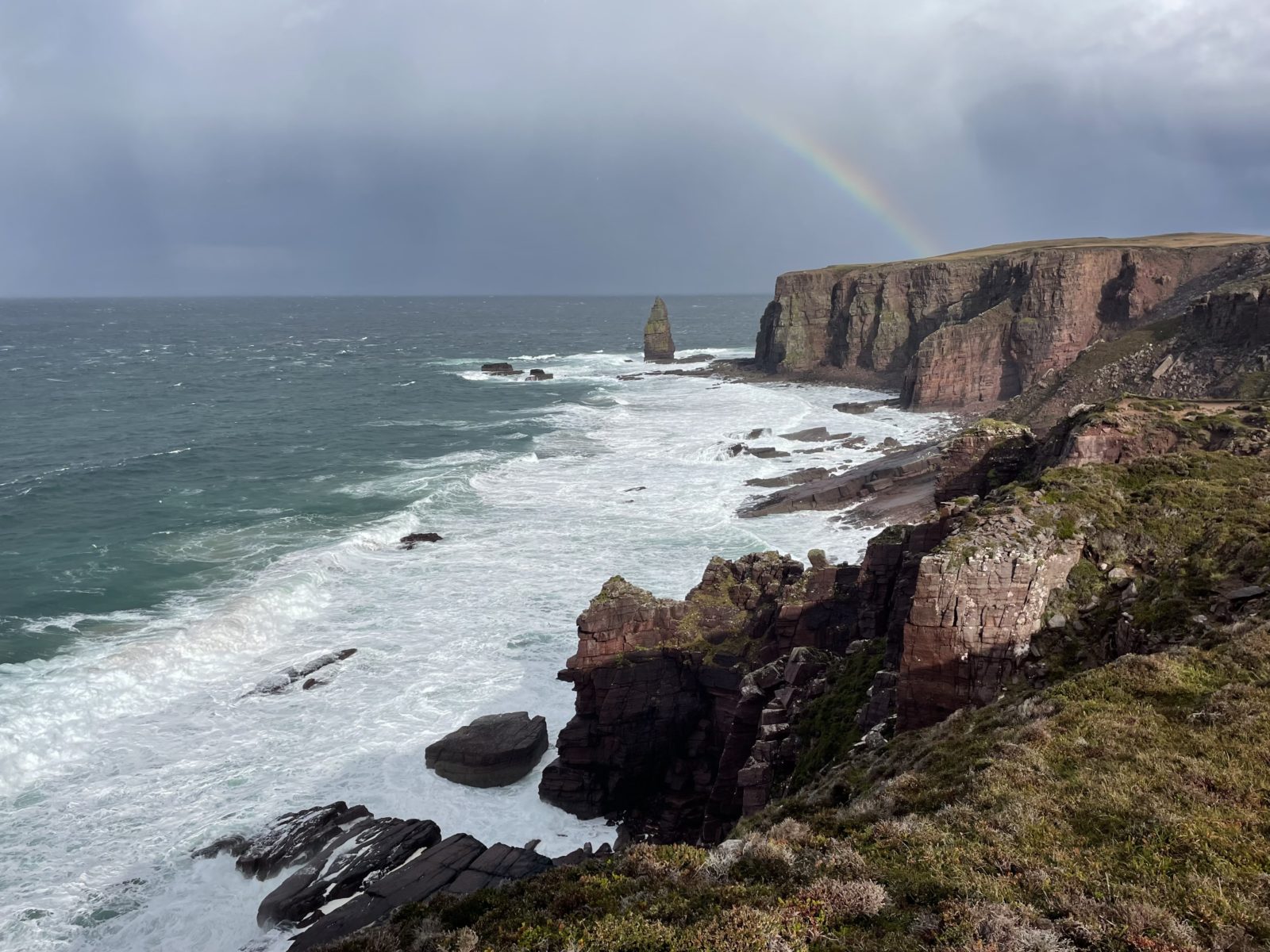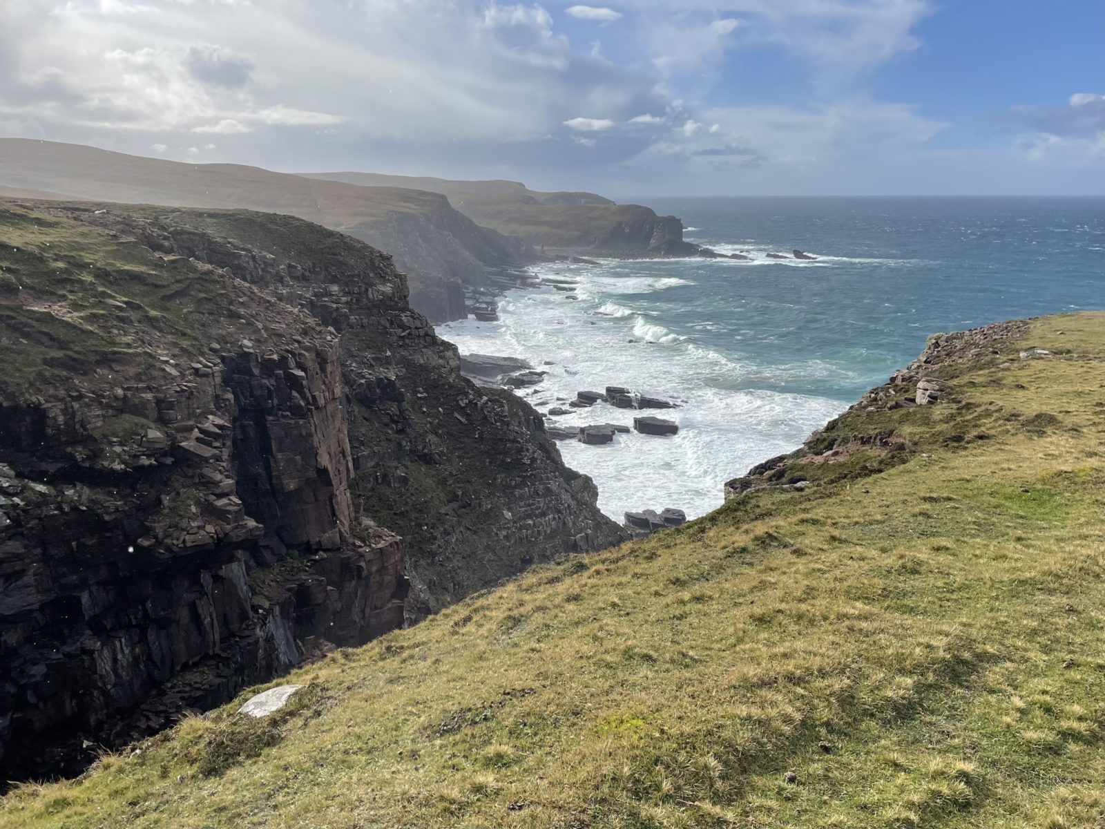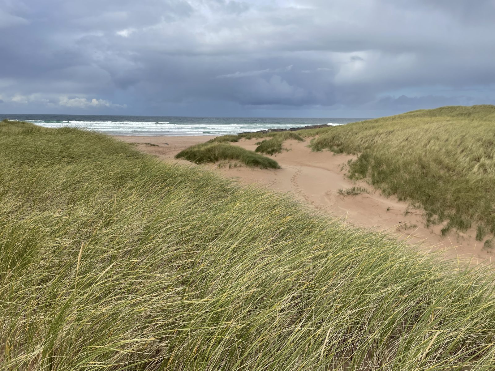 Když je asi 13 hodin, tak se počasí najednou umoudří. Svítí slunko a skoro nefouká. Tak toho musím využít a dávám pauzu. Už mám na dohled pláž. A taky v dálce vidím maják na Cape Wrath.