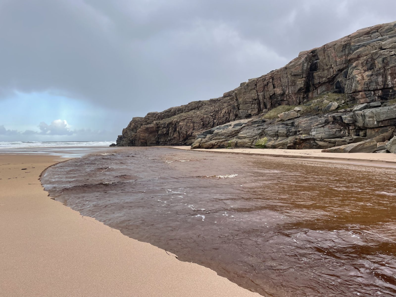 Chvilku uvažuju nad koupáním. Ale asi na to kašlu. Projdu se až na konec pláže k řece, kterou bych musel přebrodit, kdybych pokračoval až na mys. Když jsem u řeky, tak zrovna začíná slejvák. Tak se otočím a vydám se zpět.
