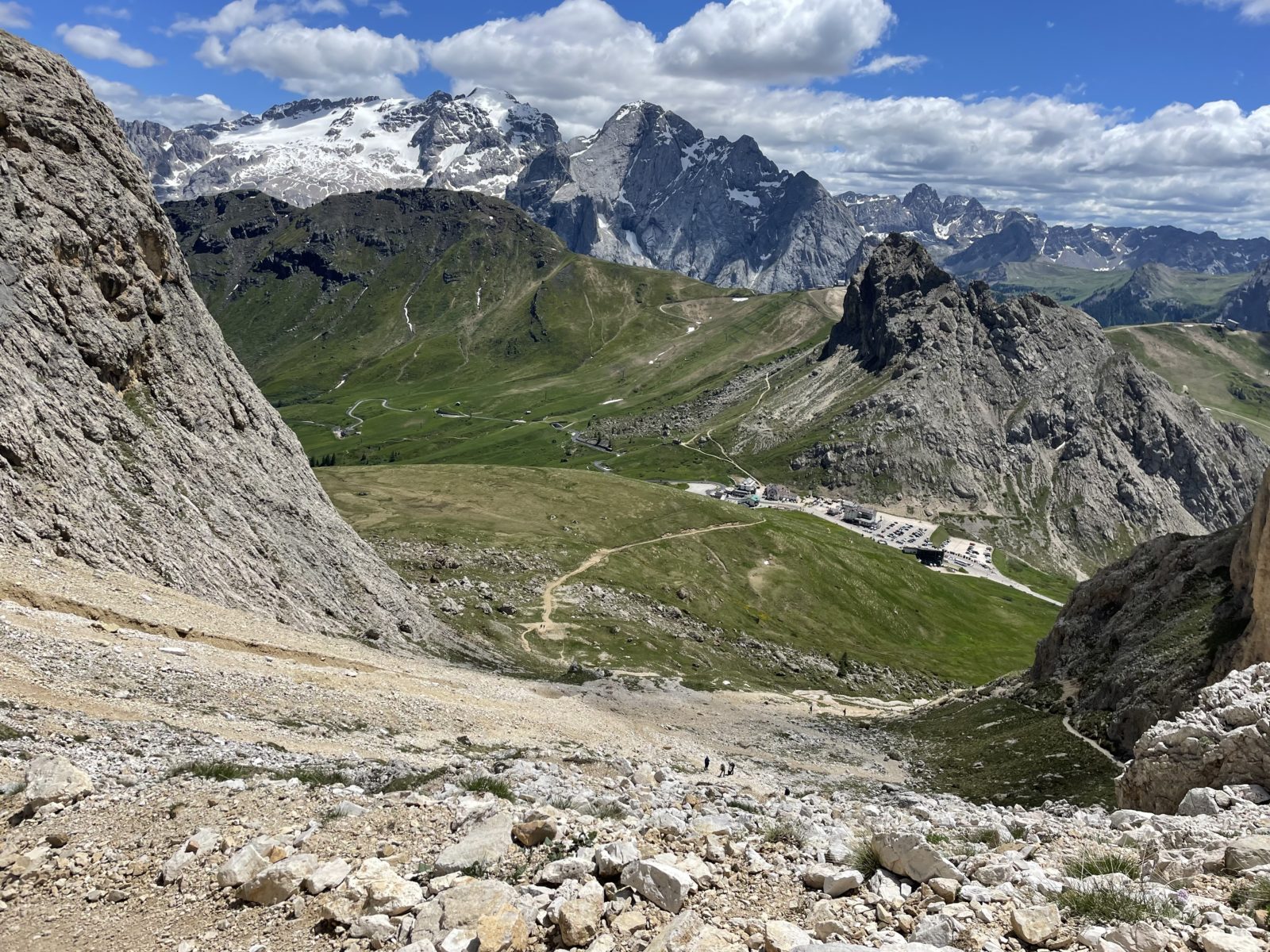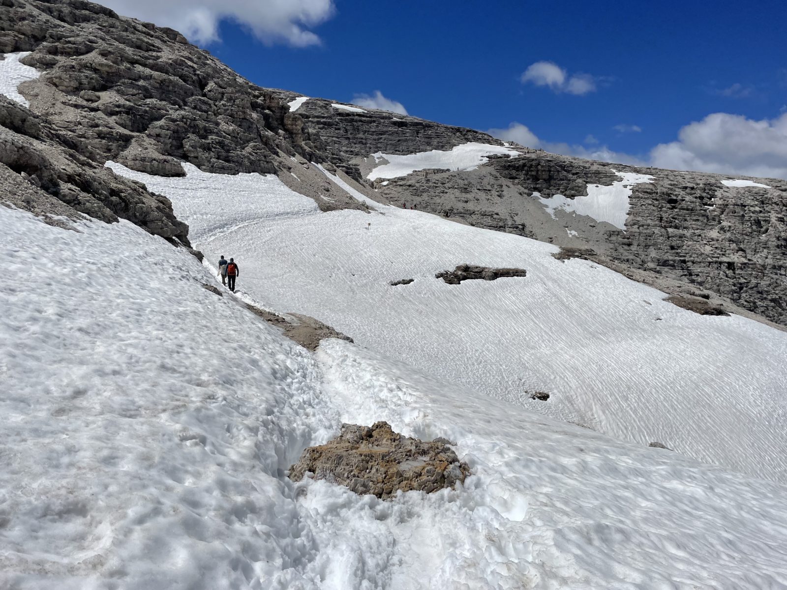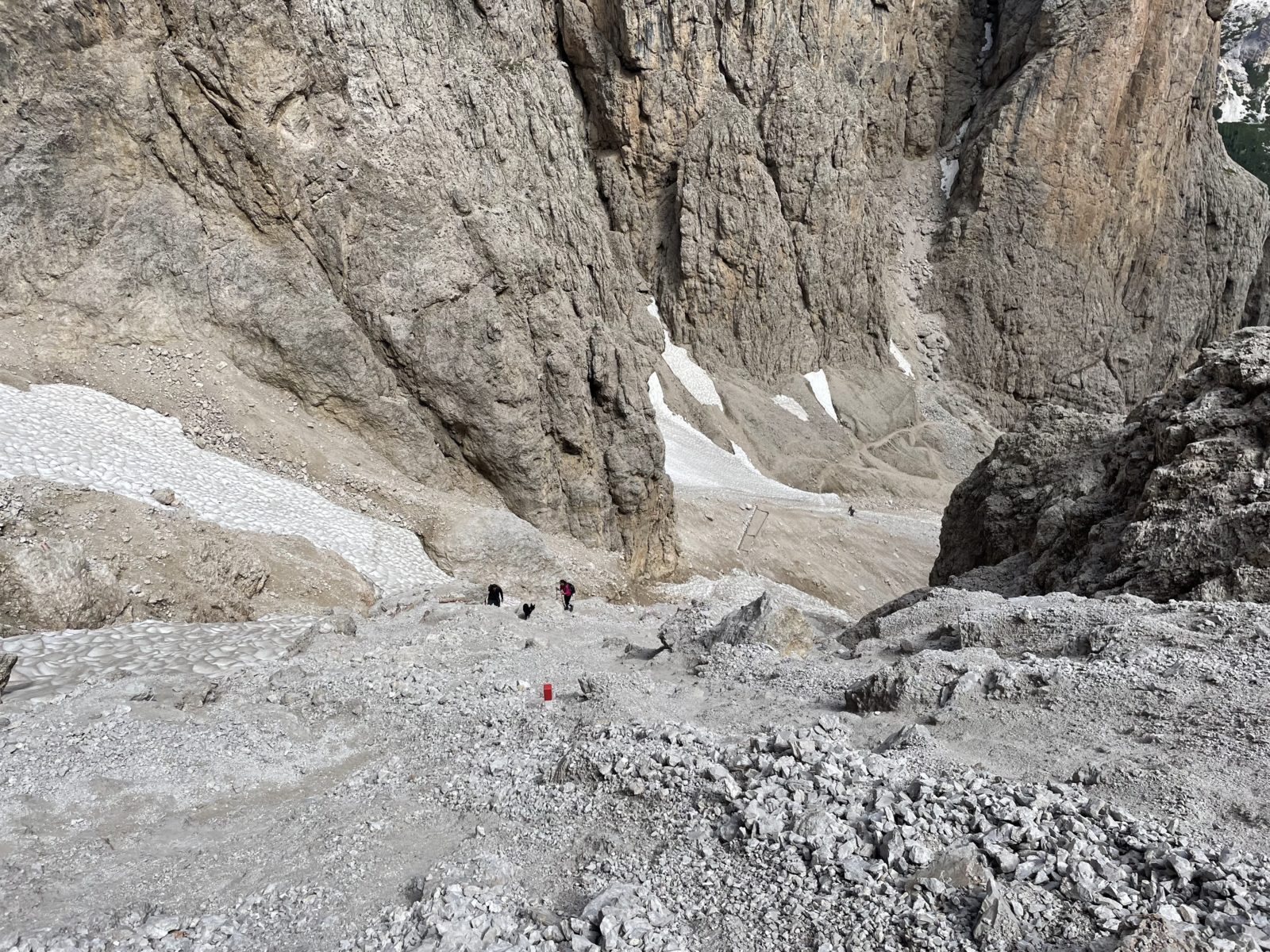 Potřebuju sejít dolů do silničního sedla Pordoi. Ale cestička od chaty je nějaká strmá a plná sněhu. Zrovna u toho stojí dva Češi a říkají: “No ale lidi tam chodí…” Takže mi nezbývá, než vyrazit. Obtížný úsek je velmi krátký a pak už je to jen suťovisko bez sněhu. Ukazuje se, že ne všichni jedou lanovkou – i tady je hodně lidí.