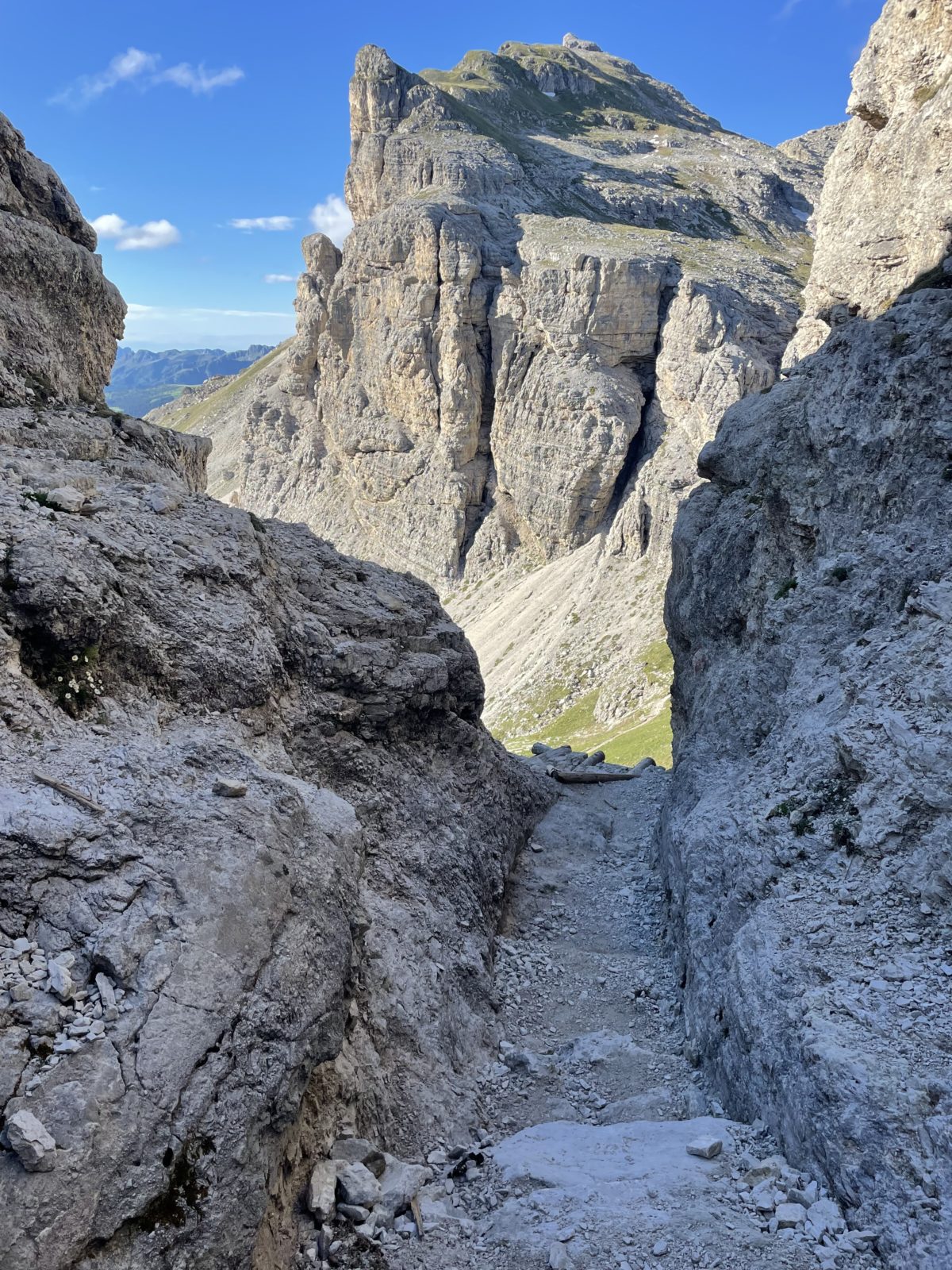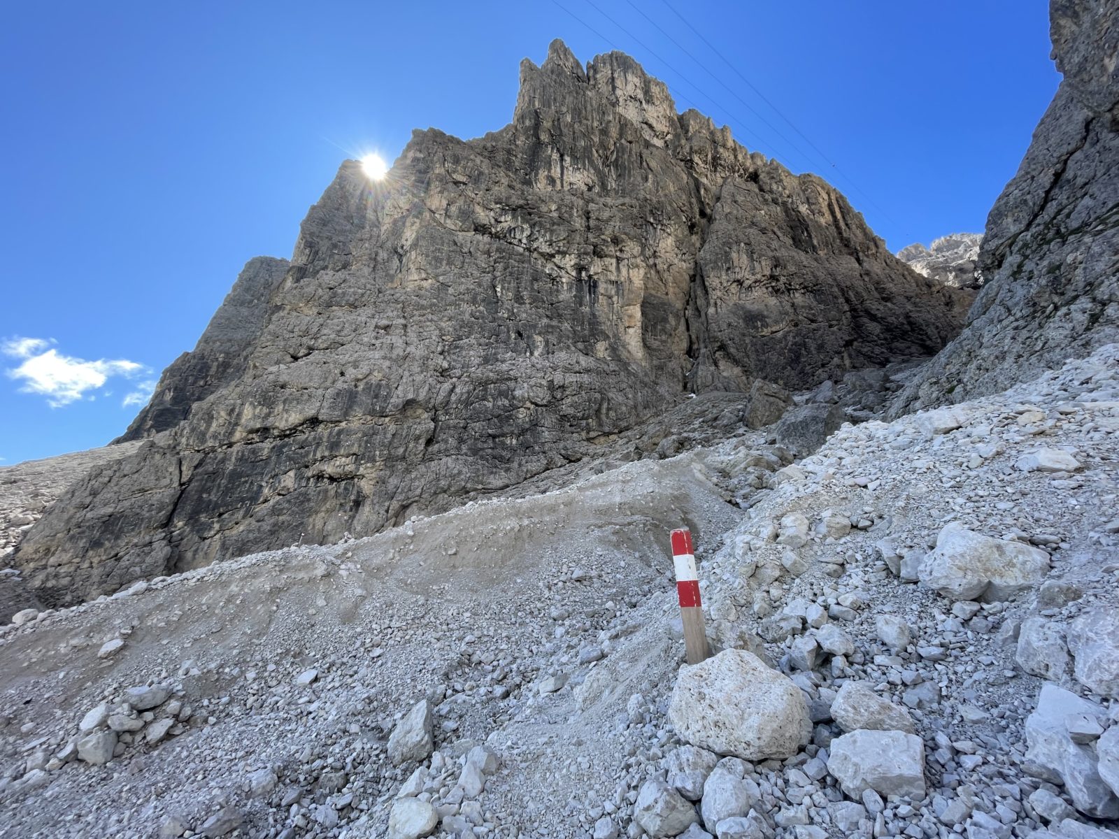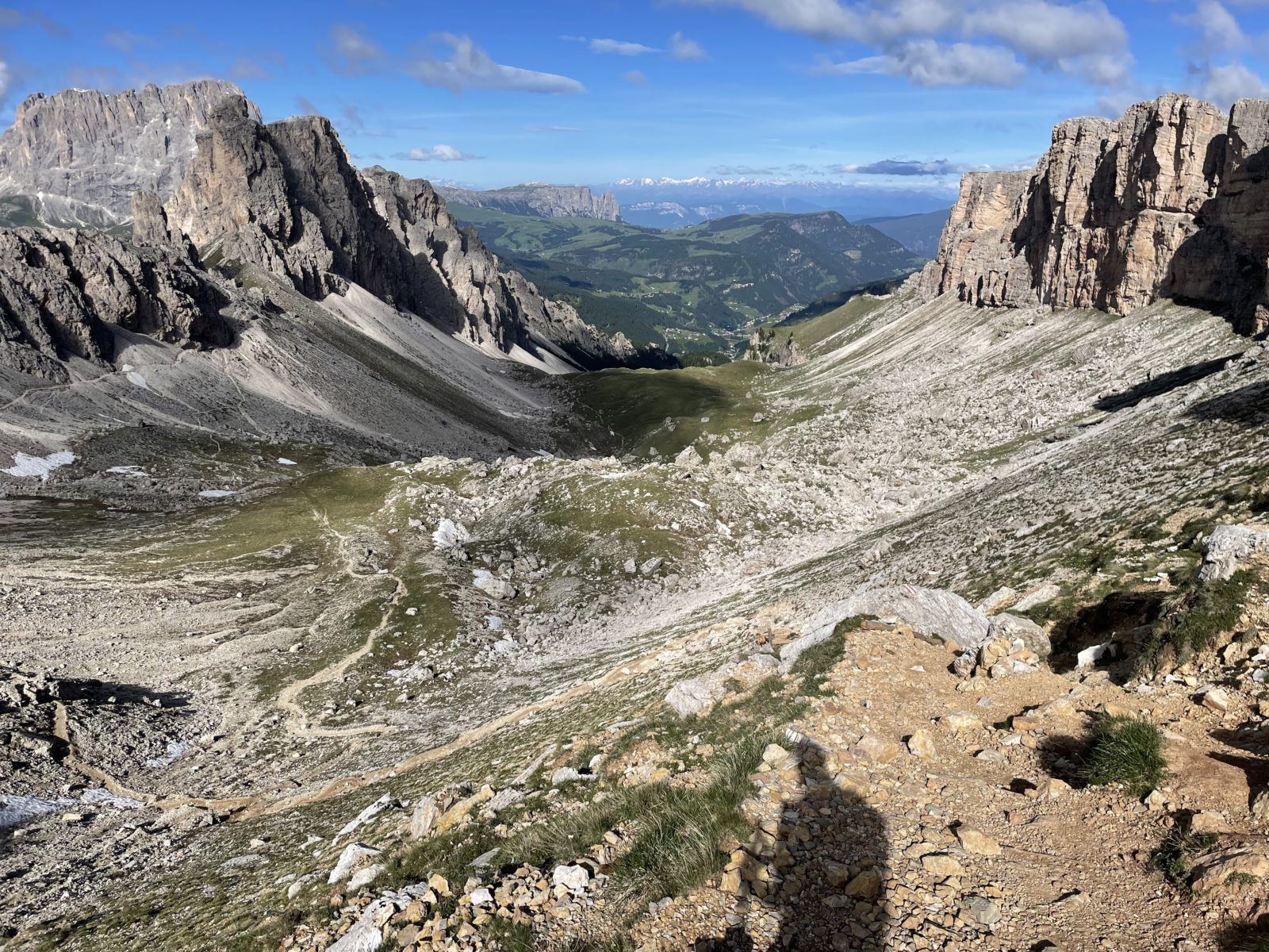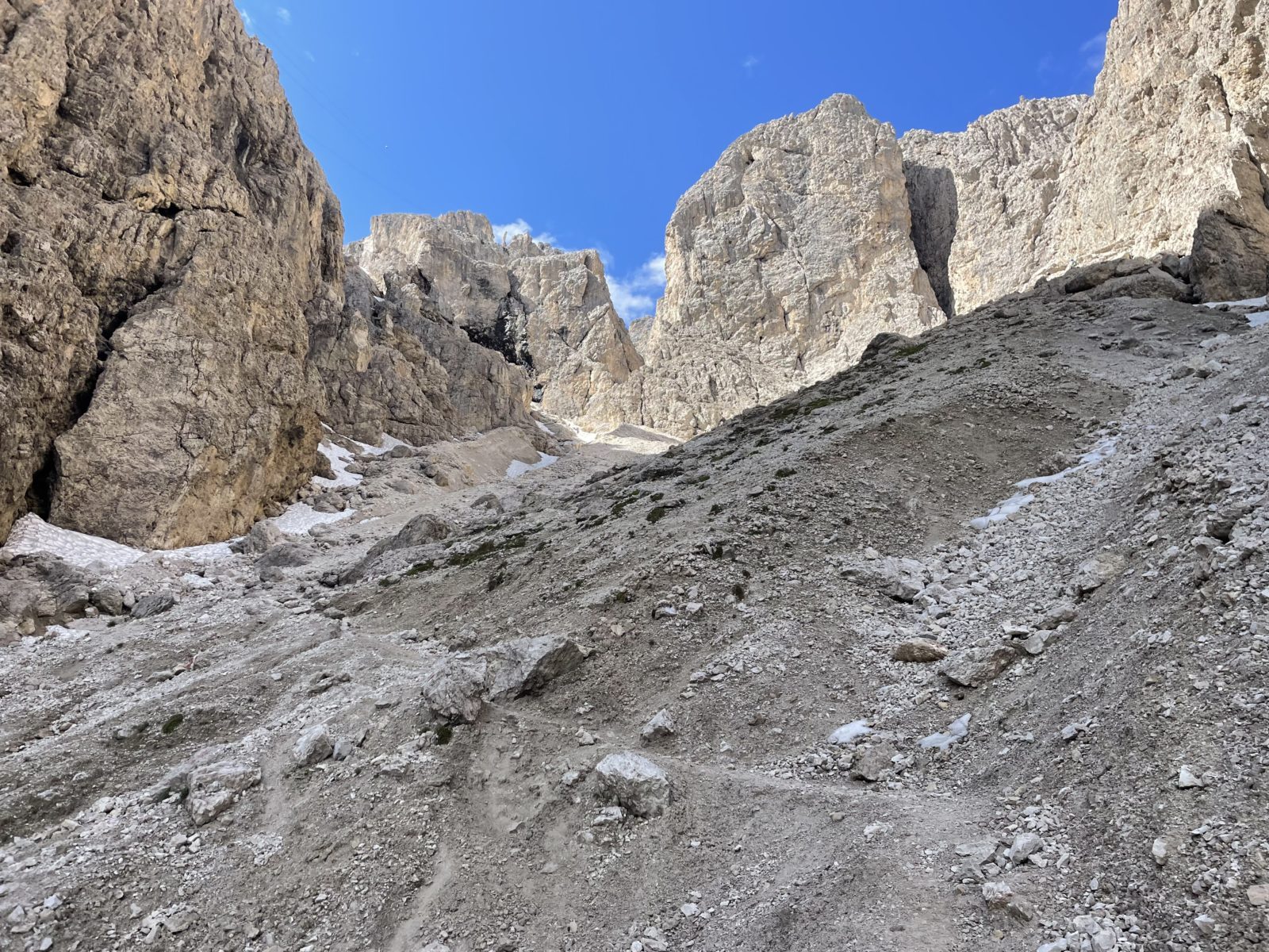 Potřebuju sejít dolů do silničního sedla Pordoi. Ale cestička od chaty je nějaká strmá a plná sněhu. Zrovna u toho stojí dva Češi a říkají: “No ale lidi tam chodí…” Takže mi nezbývá, než vyrazit. Obtížný úsek je velmi krátký a pak už je to jen suťovisko bez sněhu. Ukazuje se, že ne všichni jedou lanovkou – i tady je hodně lidí.