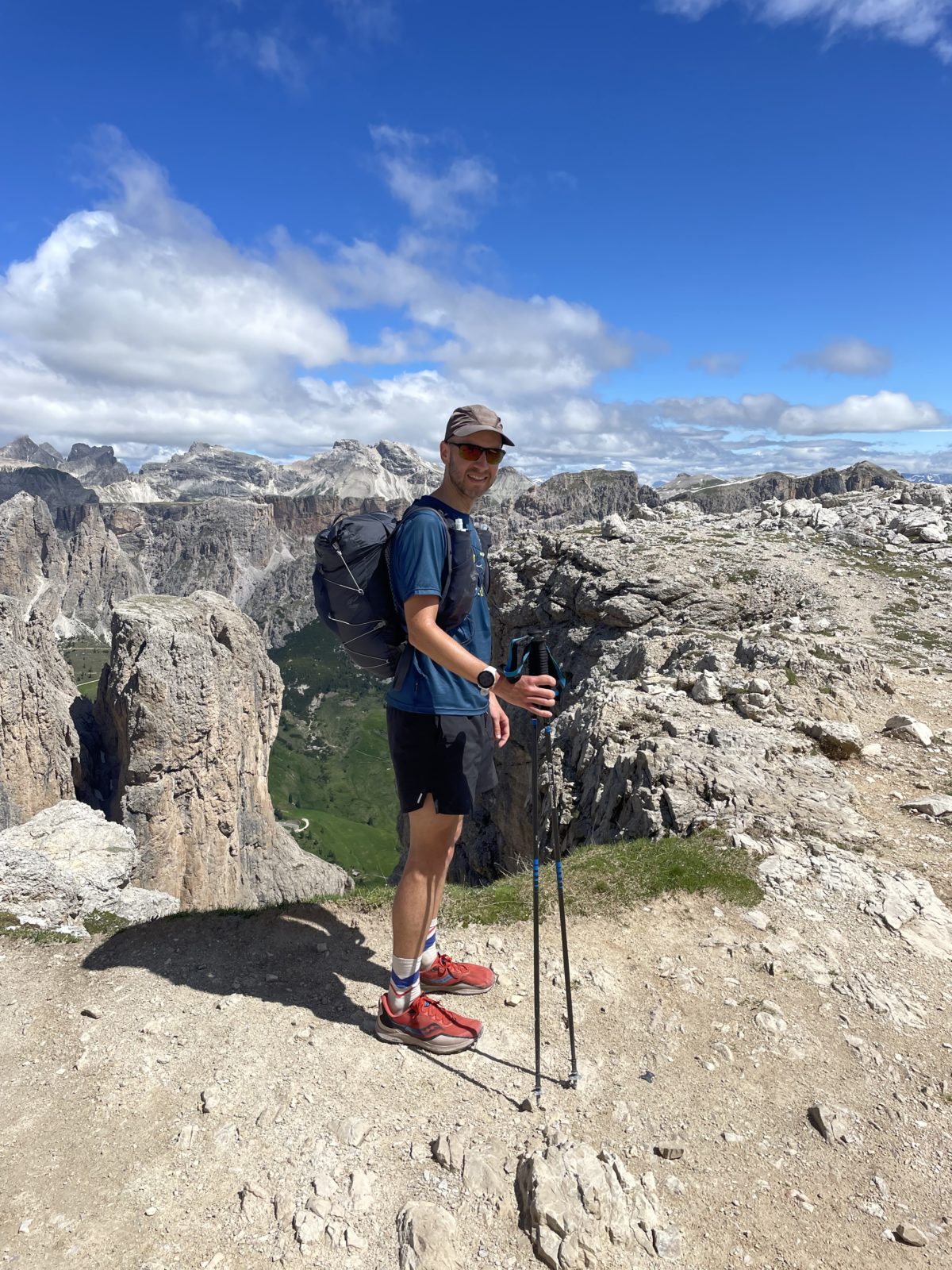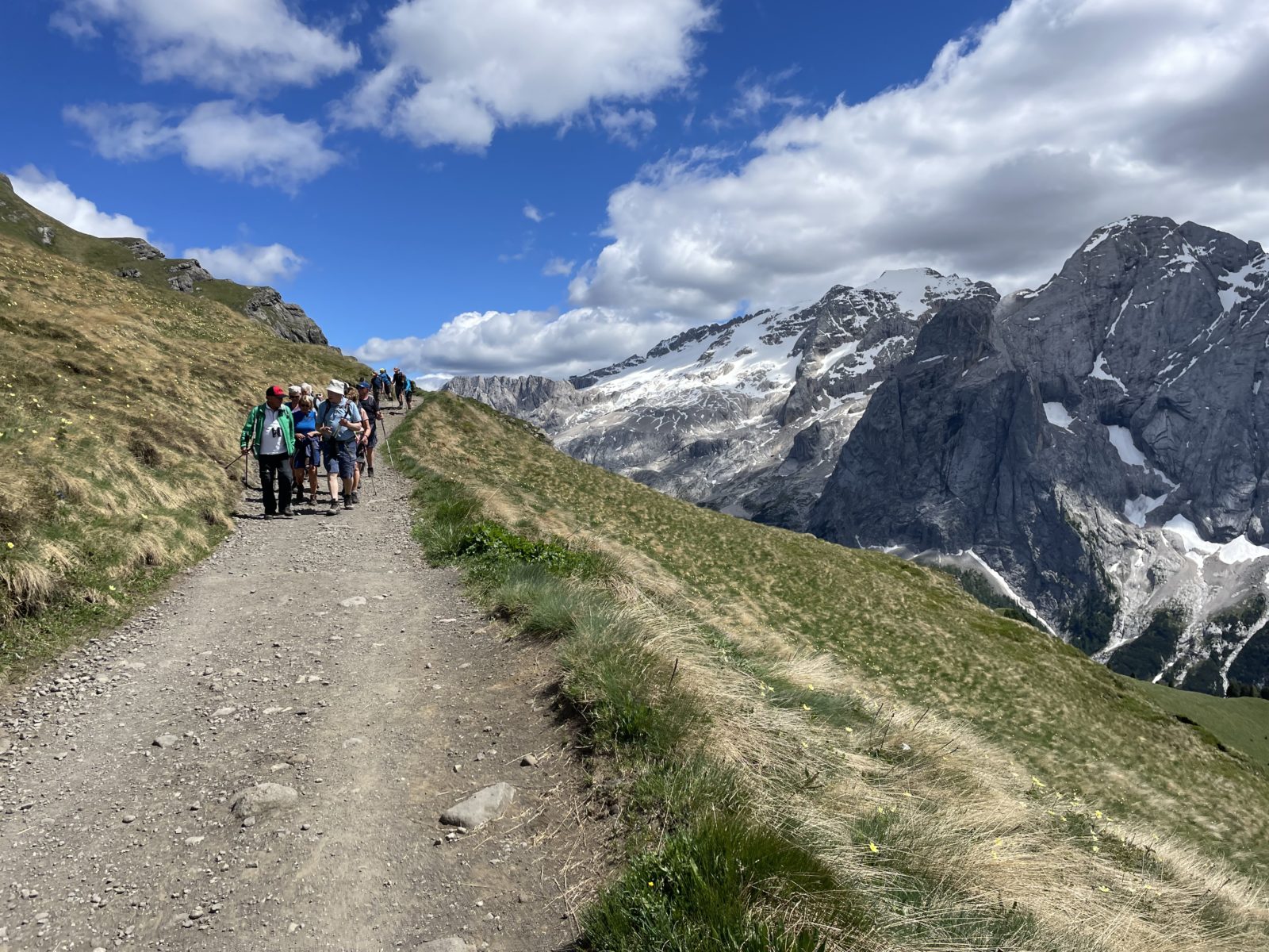 Tak pokračuju dál. Je to kousek do kopce a pak pokračuje takový dlouhý zvlněný travers s krásnými výhledy na Marmoladu. Jediná vada na kráse je, že jsou tu davy lidí. A mě navíc trápí vysušená chodidla (hlavně pravé). Mám varhany. Potřebuju někde zastavit a vyvětrat to a aspoň na to dát vazelínu. Ale je mi to záhada. Nohy byly dost v mokru kvůli sněhu, ale když to srovnám se Skotskem minulý podzim, tak to bylo nic, a tehdy jsem problém neměl.