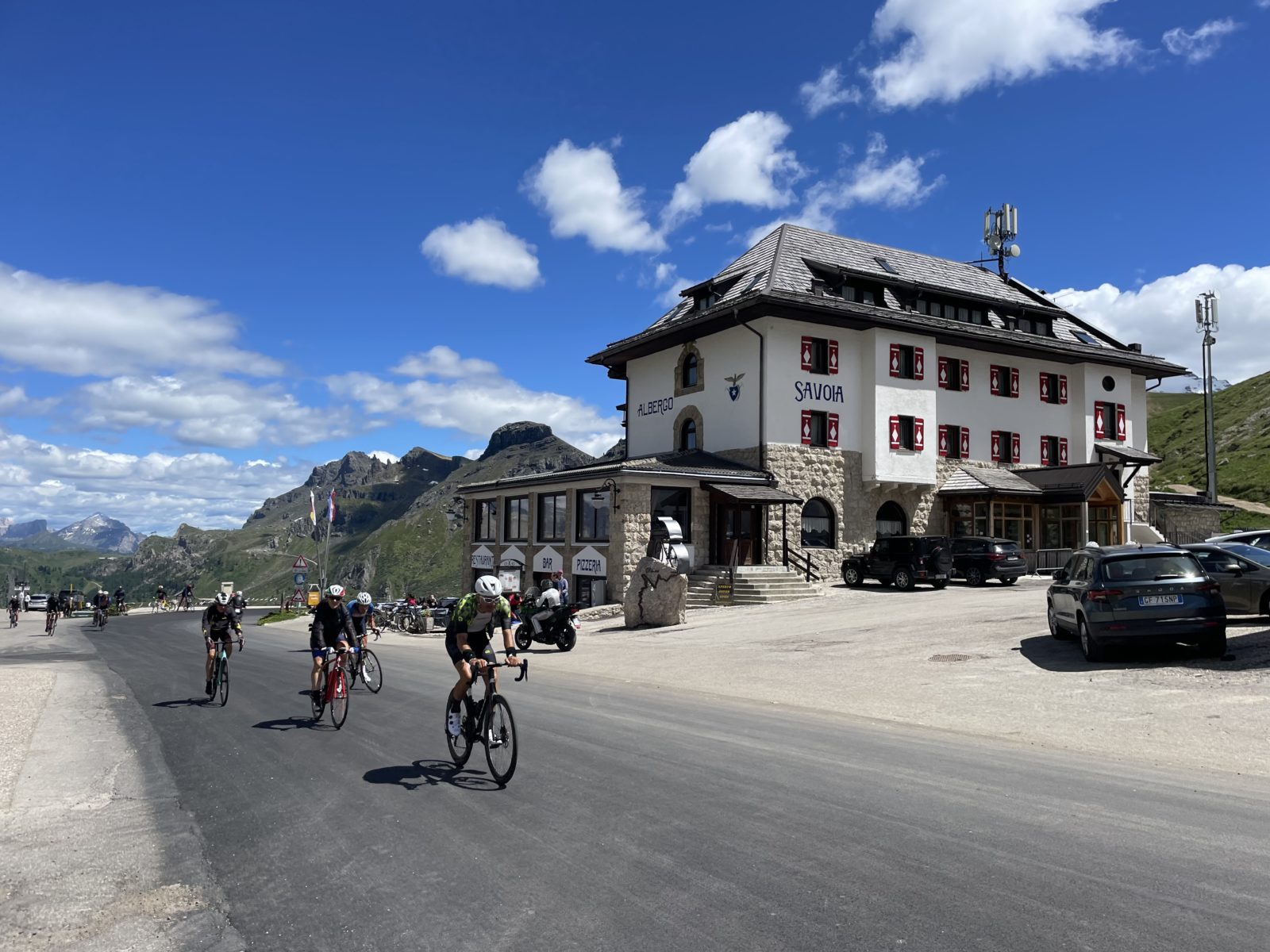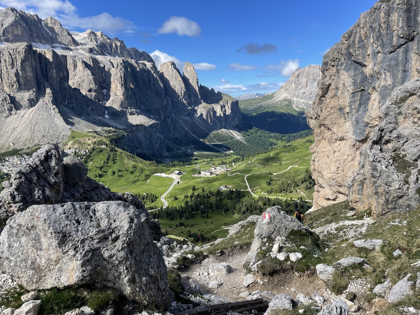 Pak chvíli čekám, až oschnu. A pak se obleču a pokračuju dál. Trasa se ještě chvíli mírně vlní a pak začíná sestup o pár set metrů níž k Passo Gardena. Tady se začínají rojit lidi. Je jich dost.
