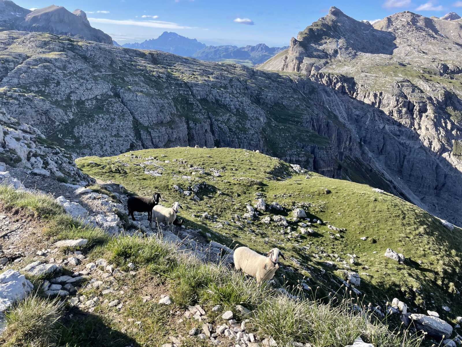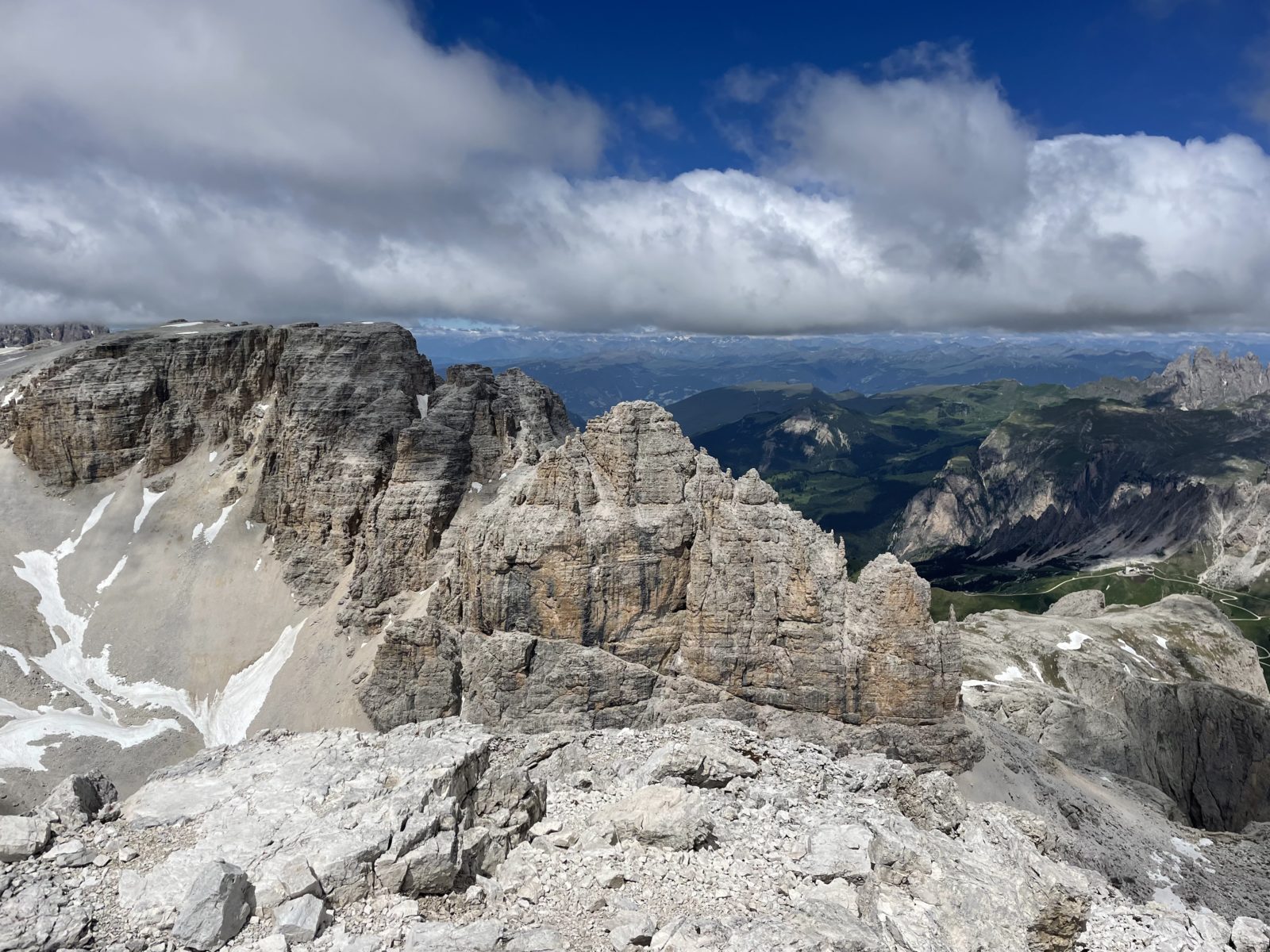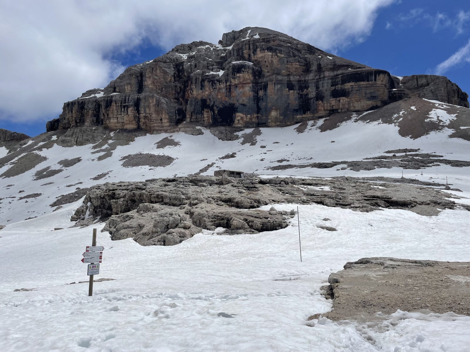 V 1 dojdu k chatě Boé (2871 m). Je tu mraky lidí. Dávám sváču. V průvodci doporučují to vzít přes kopec Piz Boé (3152 m). Chvíli to zvažuju, ale kašlu na to. Už jsem dnes jeden boční kopec měl a přijde mi, že je tam hrozně moc lidí (na tom mojem nebyl skoro nikdo). Takže pokračuju traverzem pod kopcem. Přecházím spoustu sněhových polí. Bylo by to fajn, kdyby tu nebylo tolik lidí.