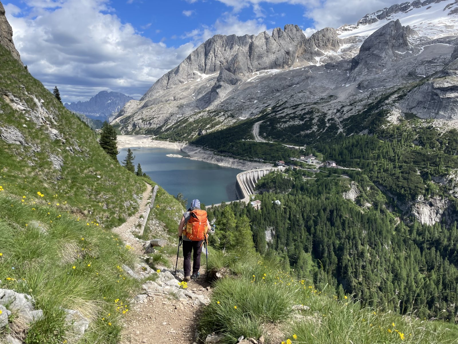 V 15:15 dojdu na chatu, co je po cestě. Myslel jsem, že si dám třeba pivo, ale obsluha na mě nějak kašle. Tak ošetřím nohy a pokračuju dál. Ještě chvíli zůstávám ve výšce a pak už definitivně začne klesání k přehradě Fedaia. Je tu silnice, takže i hodně lidí a ruch. Ale taky chata. Dojdu k ní v 16:25. Rozhoduju se zůstat. Místo v noclehárně mají. Je teda celkem brzo. Ale jednak dostanou chodidla víc času na vyvětrání. A taky jsem z toho sluníčka dneska nějakej zmoženej.