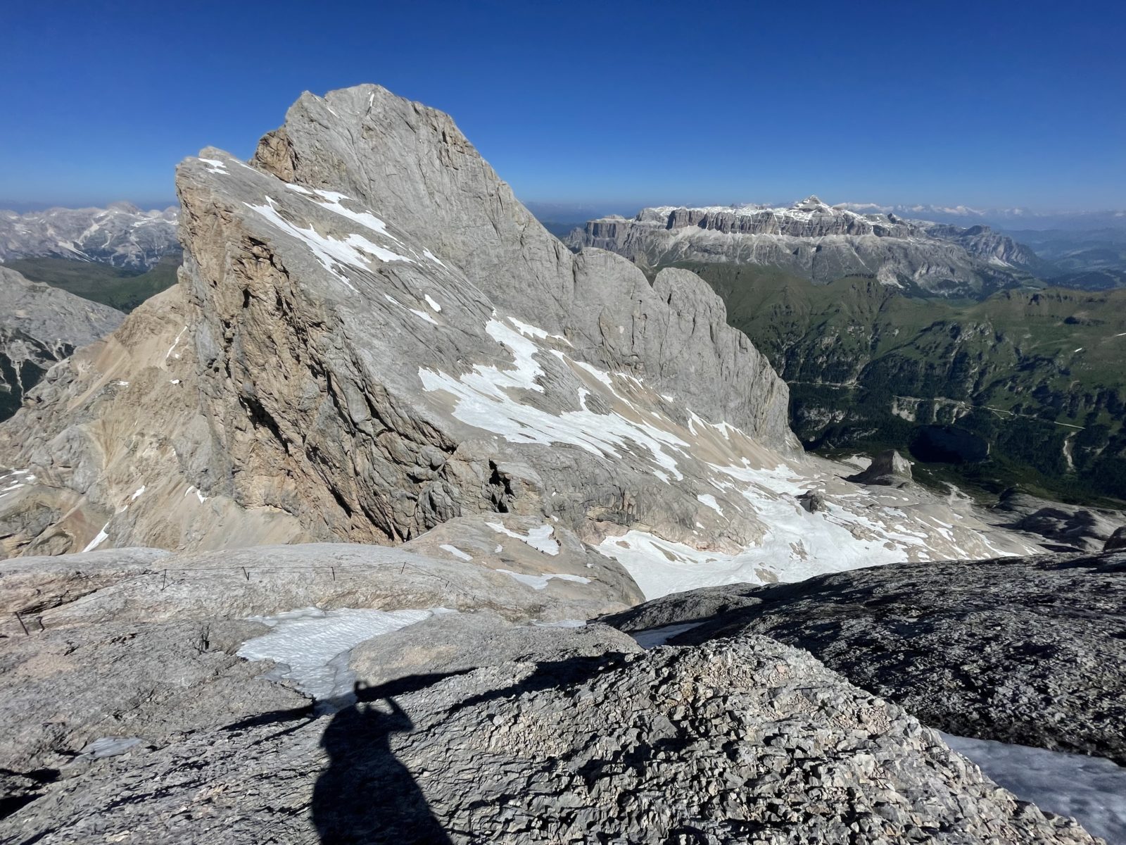 Přesně v 10:00 jsem v sedle Sforcela de La Marmolada (2885 m). Je to hezké místo. Z obou stran vede via ferrata prudce dolů. A do boku začíná ferrata na hlavní vrchol celého masivu – Punta Penia (3343 m).